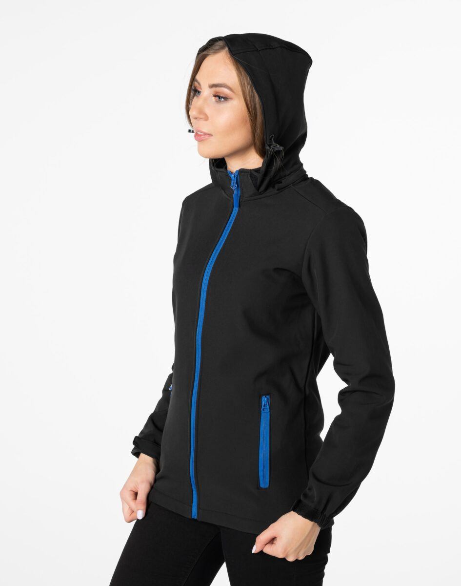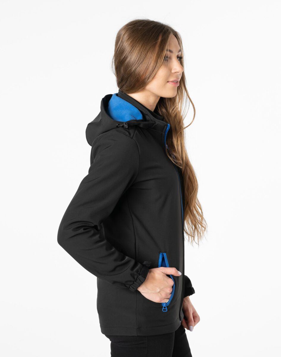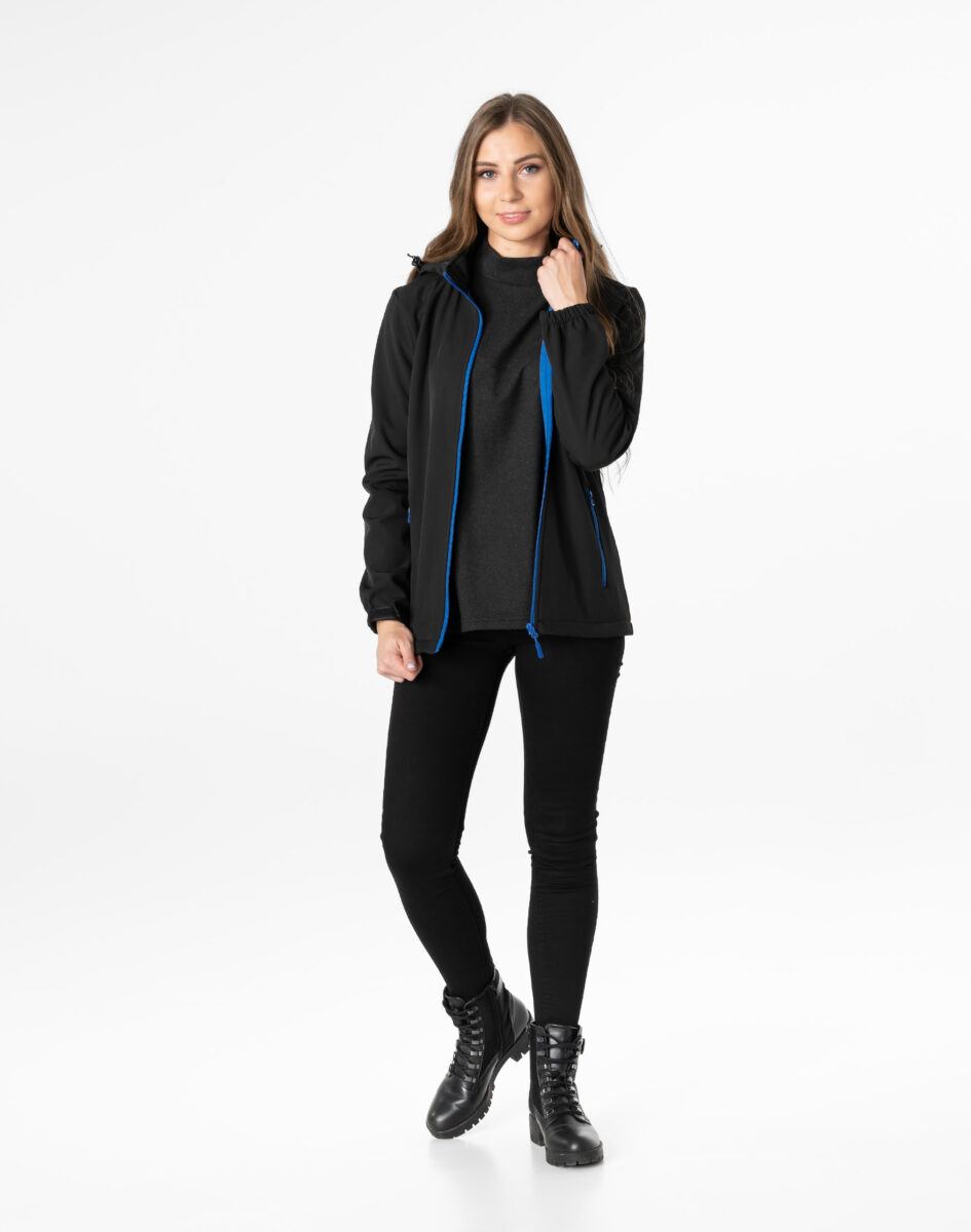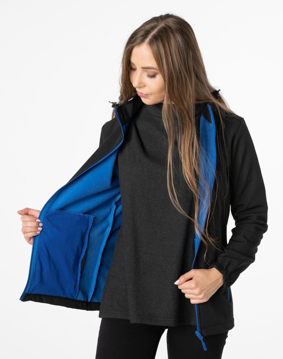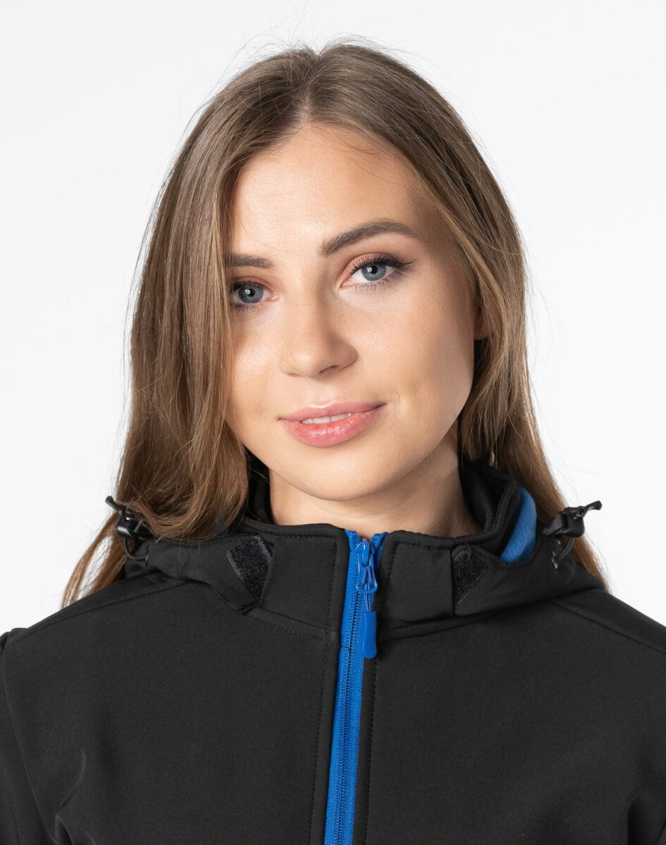 Softshell na zewnątrz posiada wykończenie typu Water Repellency, który zapobiega nasączeniu warstwy zewnętrznej wodą. Wewnętrzna strona kurtki utrzymująca ciepło to polarowa podszewka. Kurtka jest wodoodporna, oddychająca i zapinana w całości na wodoodporny zamek błyskawiczny. Praktyczny odpinany na zamek błyskawiczny i ocieplony polarową podszewką kaptur posiada możliwość połączenia go z za pomocą rzepów z kołnierzem oraz regulacji jego wielkości i dopasowania. Osłoni Twoją głowę przed deszczem, wiatrem i chłodem. Wysoki kołnierz/stójka skutecznie chroni podbródek i szyję a często zastępuje nawet szalik co jest bardzo wygodne. Kurtka posiada dwie przednie kieszenie na dłonie zasuwane na wodoodporne zamki błyskawiczne oraz dwie wewnętrzne naszywane kieszenie z technicznej siateczki na telefon kom./MP3/MP4/gogle/rękawiczki/kominiarkę/dokumenty itp. Ściągacze regulacyjne przy kapturze z gumką i stoperem, a w rękawach regulowane mankiety na rzepy pozwalają na precyzyjne dopasowanie kurtki do ciała, co znacznie zapobiega utracie ciepła i skutecznie chroni przed podmuchami wiatru. Wewnętrzna strona kurtki jest lekko ocieplona przyjazną dla ciała polarową podszewką. Talia zgrabnie podkreślona doskonale wyprofilowana konstrukcja. Modny sportowy krój efektownie podkreślający kobiecą sylwetkę prezentowany obecnie szeroko na modowych blogach.