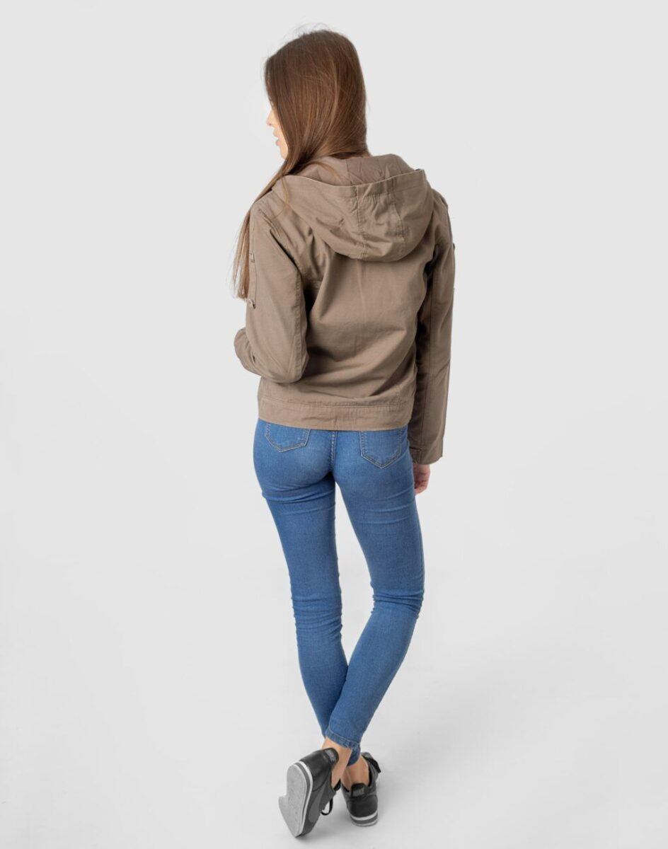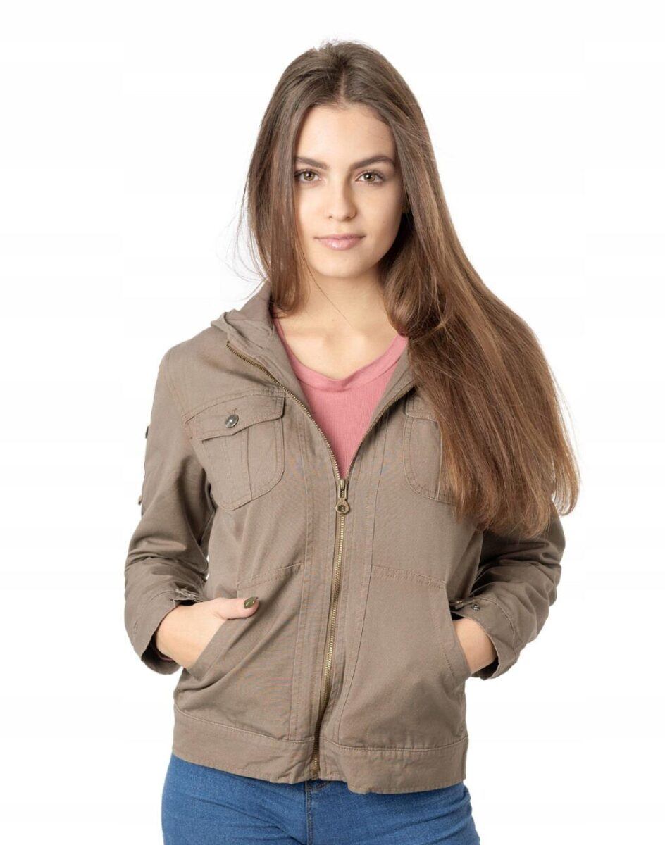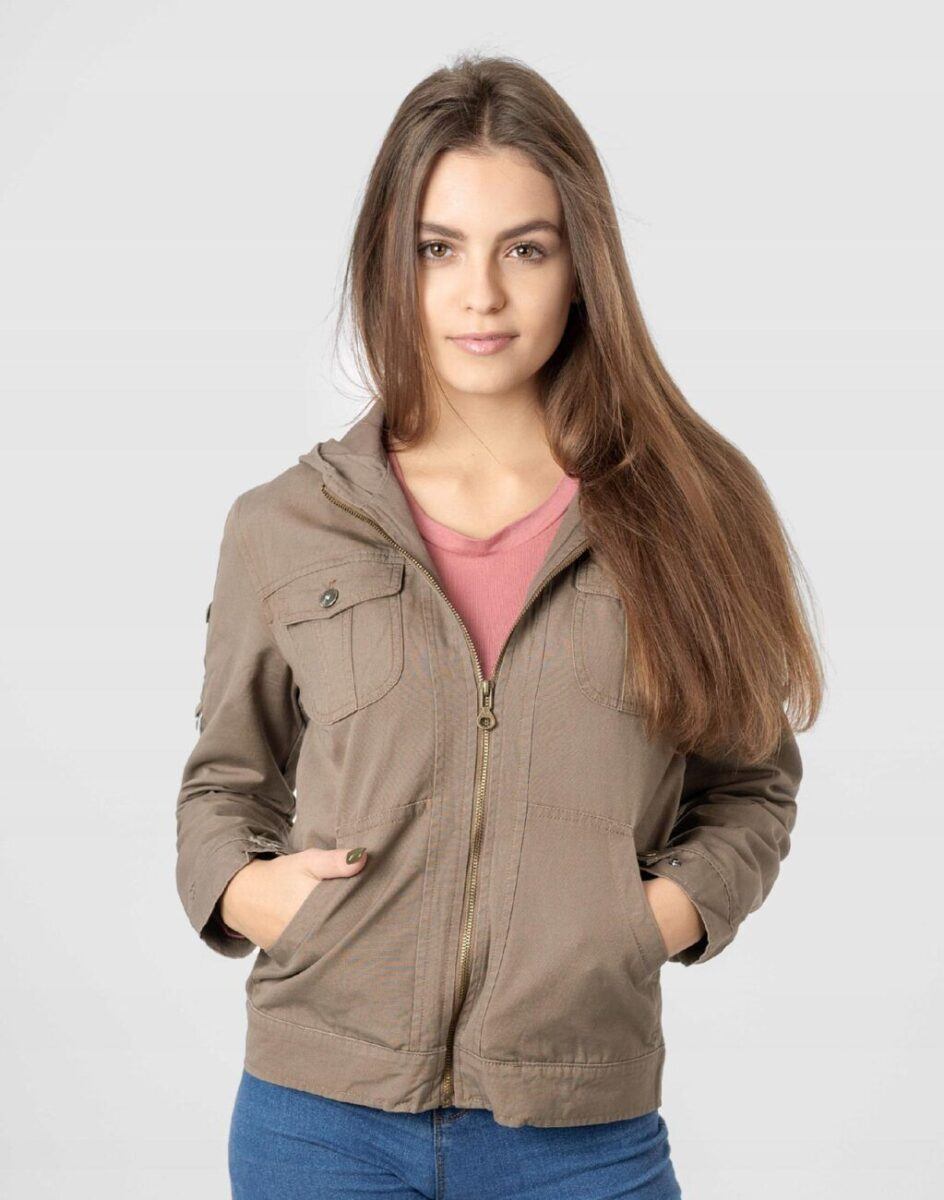 Cienka kurtka damska bawełniana typu „wiatrówka” przekonująca efektownym fasonem oraz praktycznym kapturem. Zasuwana w całości na zamek błyskawiczny i wykończona od wewnątrz materiałową podszewką. Na bokach dwie wpuszczane kieszenie na dłonie. Na piersiach dwie kieszenie naszywane kryte patkami zapinanymi na guziki. Mankiety rękawów z możliwością regulacji szerokości i dopasowania. Kurtka posiada kaptur zintegrowany z wysokim kołnierzem/stójką i wykończony od wewnętrznej strony podszewką. Talia zgrabnie podkreślona doskonale wyprofilowana konstrukcja efektownie podkreślająca kobiecą sylwetkę.