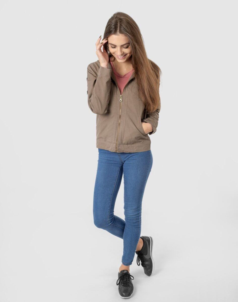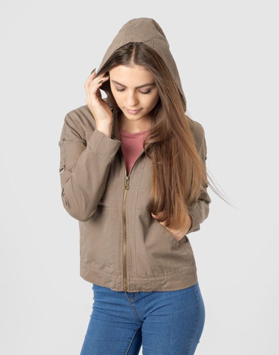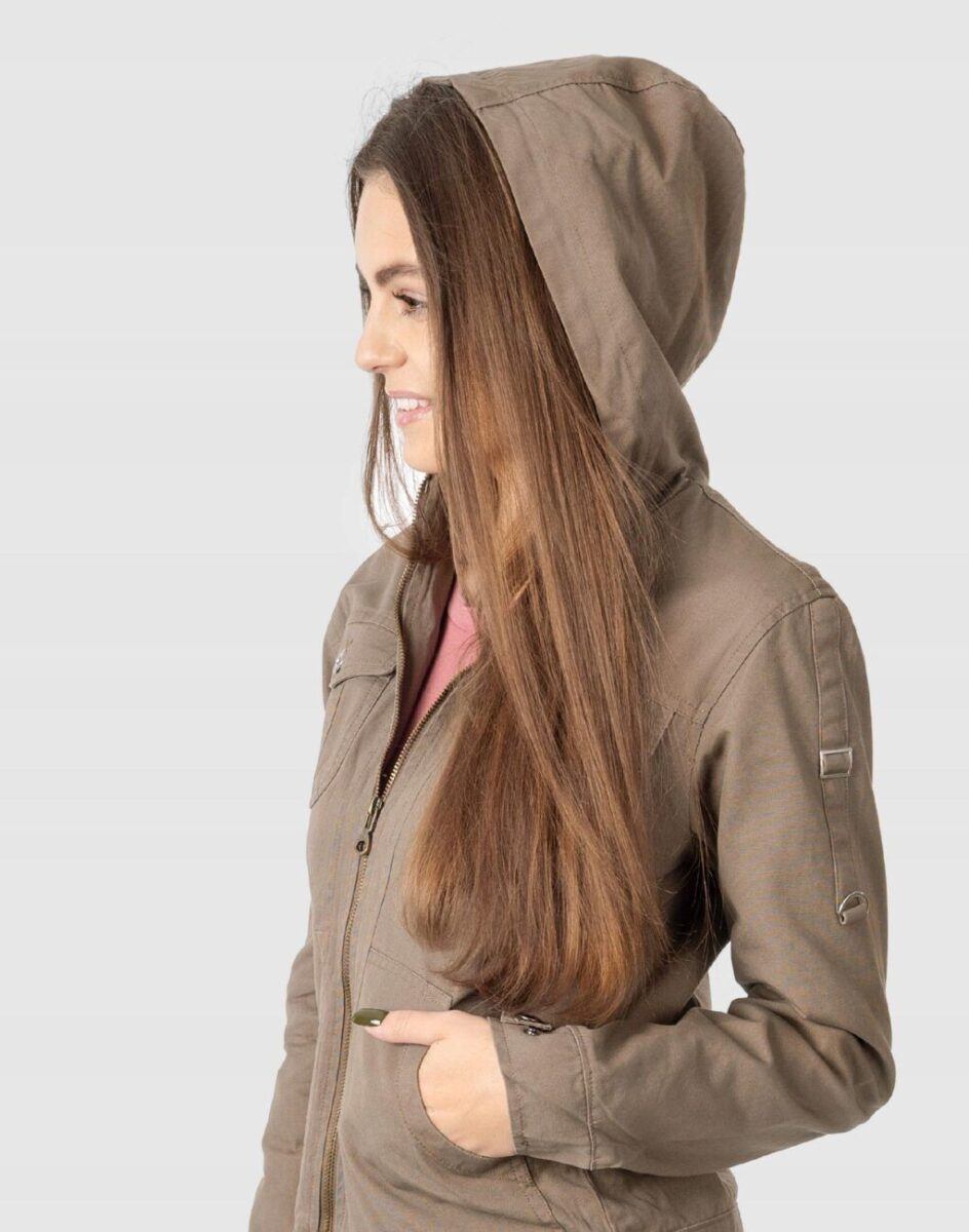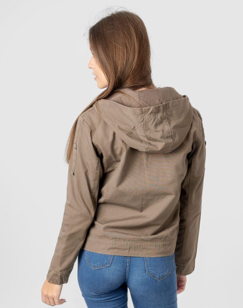 Cienka kurtka damska bawełniana typu „wiatrówka” przekonująca efektownym fasonem oraz praktycznym kapturem. Zasuwana w całości na zamek błyskawiczny i wykończona od wewnątrz materiałową podszewką. Na bokach dwie wpuszczane kieszenie na dłonie. Na piersiach dwie kieszenie naszywane kryte patkami zapinanymi na guziki. Mankiety rękawów z możliwością regulacji szerokości i dopasowania. Kurtka posiada kaptur zintegrowany z wysokim kołnierzem/stójką i wykończony od wewnętrznej strony podszewką. Talia zgrabnie podkreślona doskonale wyprofilowana konstrukcja efektownie podkreślająca kobiecą sylwetkę.