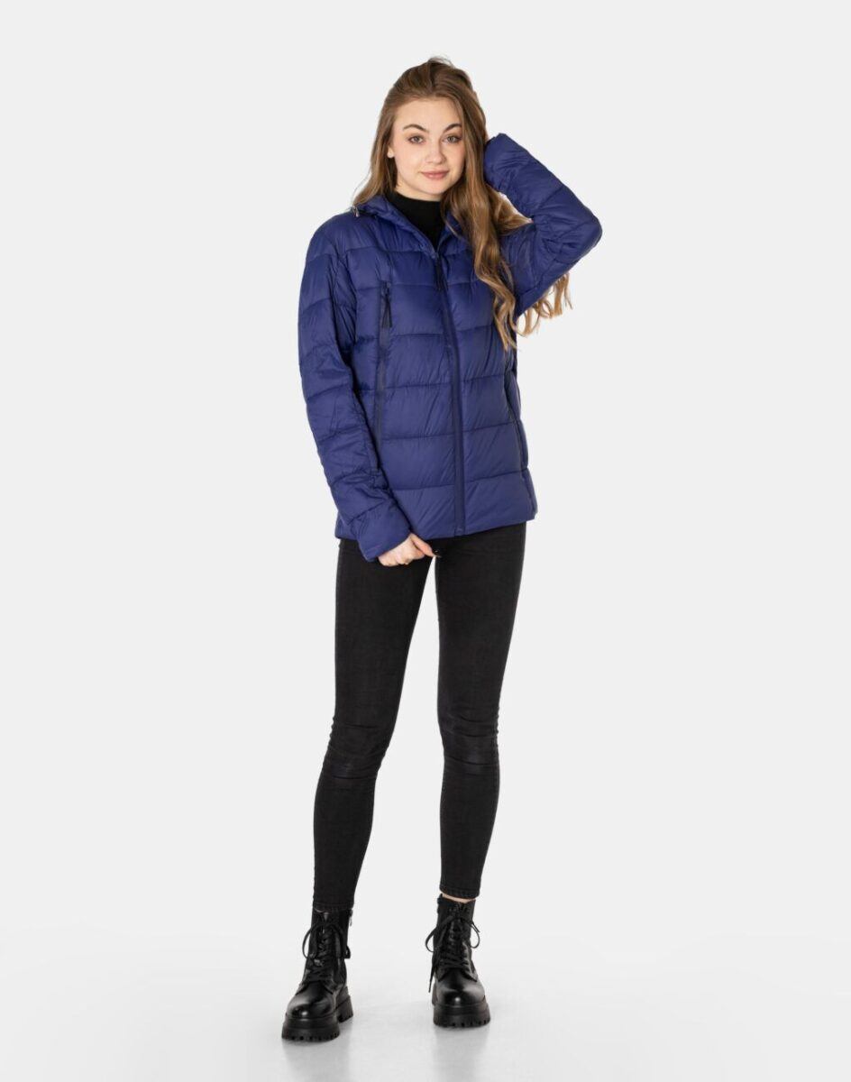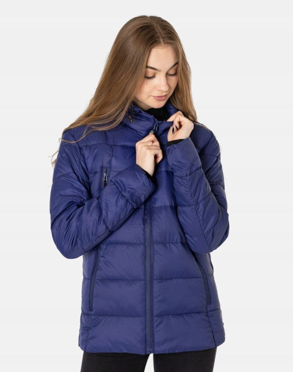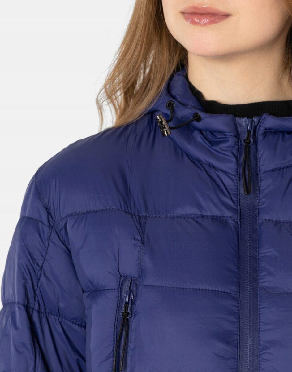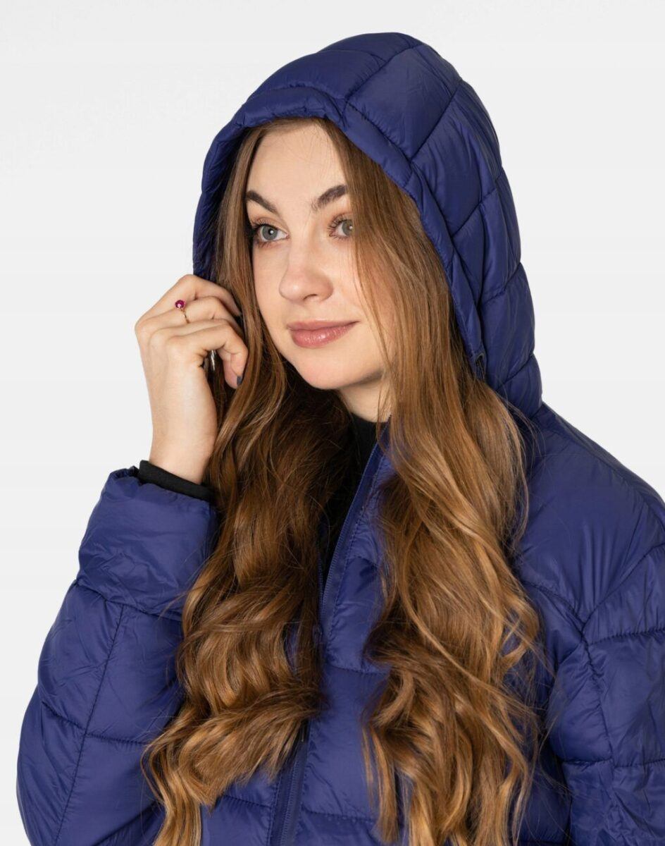 Kurtka jest zgrabnie taliowana, efektownie pikowana (aby w powstałych „kieszonkach” zmieścić jak najwięcej grzejącego surowca), zasuwana na wodoodporny zamek błyskawiczny i ocieplona w całości puchem syntetycznym. Posiada dwie duże pionowe kieszenie zasuwane również na wodoodporne zamki błyskawiczne w których można przechowywać wszystko, co warto mieć pod ręką. Zintegrowany z kołnierzem regulowany w 3D i ocieplany kaptur, osłoni Twoją głowę przed deszczem, wiatrem i chłodem, a kołnierz/stójka skutecznie chroni podbródek i szyję, a często zastępuje nawet szalik co jest bardzo wygodne. Długość do bioder, która świetnie podkreśli elegancję i kobiecość w twoim wyglądzie, a jednocześnie trzyma ciepło i przytulność przy zmiennej pogodzie. Nie krępuje ruchów i z powodzeniem zakrywa części ciała wrażliwe na chłód jak plecy na wysokości nerek i pośladki. Materiał zewnętrzny jest wiatroszczelny i posiada wykończenie typu Water Repellency, które zapobiega nasączeniu warstwy zewnętrznej wodą. Wewnętrzna strona kurtki wykończona jest pikowaną podszewką.