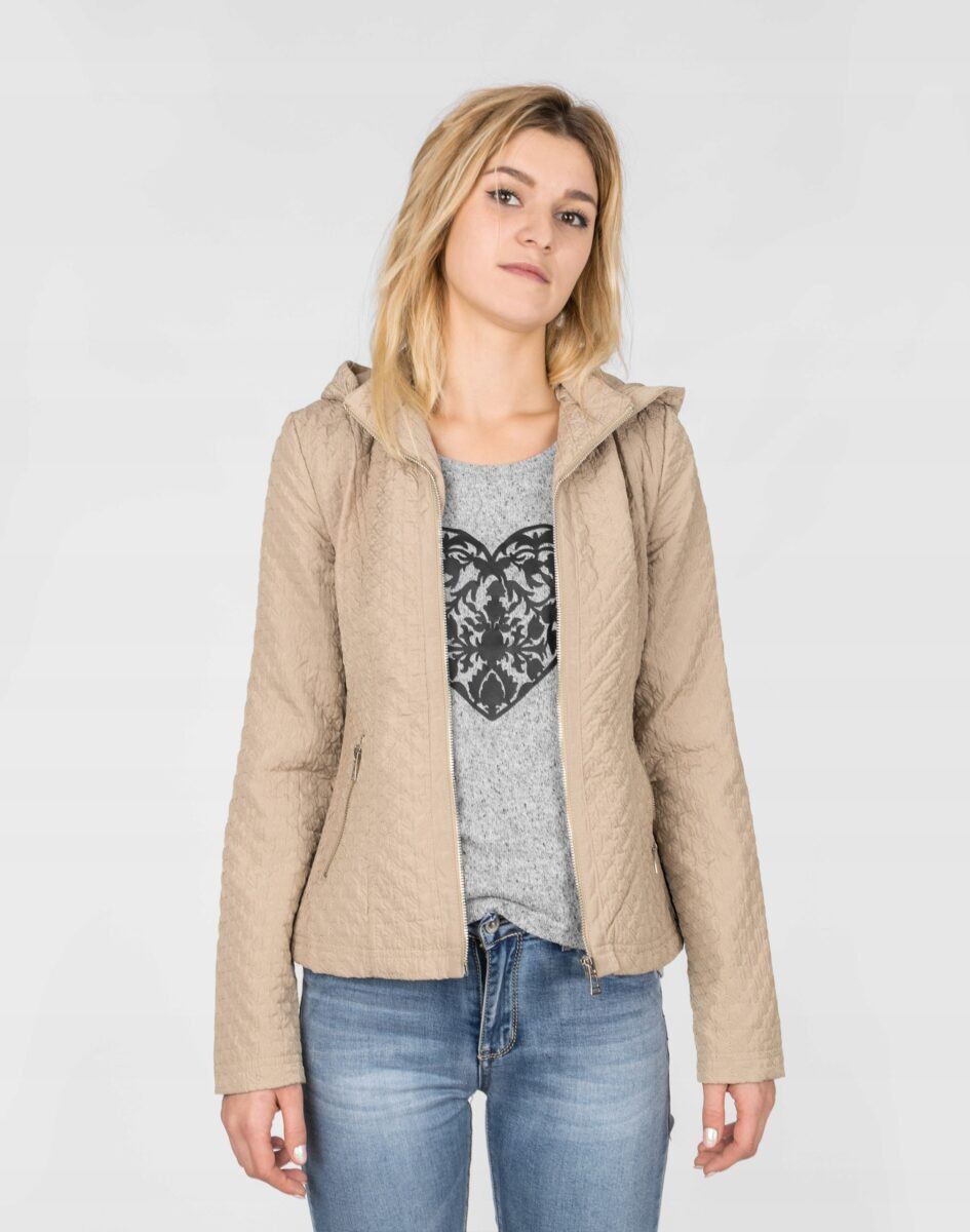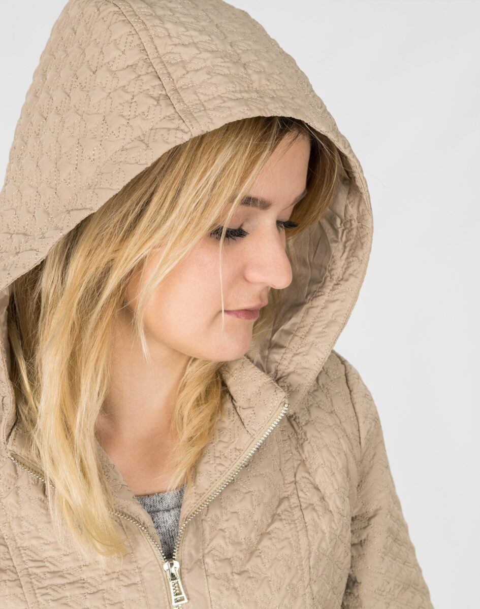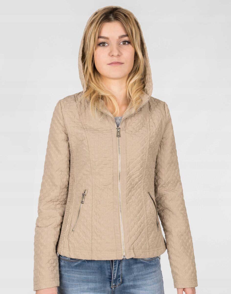 Pikowana lekka kurtka damska przekonująca efektownym, dopasowanym fasonem, zgrabnie podkreślającym kobiecą sylwetkę. Modnie pikowana, zasuwana w całości na zamek błyskawiczny. Po bokach dwie wpuszczane kieszenie na dłonie zasuwane na zamki. Posiada praktyczny odpinany kaptur. Wewnętrzna strona na materiałowej podszewce.
