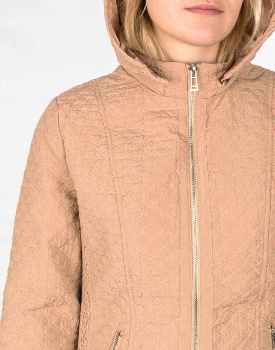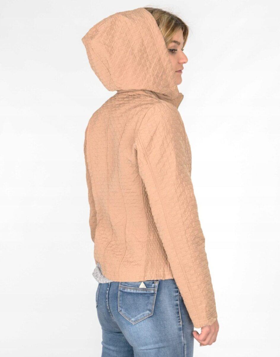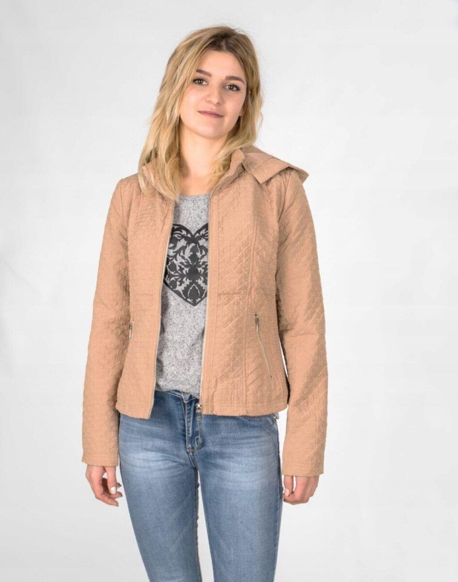 Pikowana lekka kurtka damska przekonująca efektownym, dopasowanym fasonem, zgrabnie podkreślającym kobiecą sylwetkę. Modnie pikowana, zasuwana w całości na zamek błyskawiczny. Po bokach dwie wpuszczane kieszenie na dłonie zasuwane na zamki. Posiada praktyczny odpinany kaptur. Wewnętrzna strona na materiałowej podszewce.