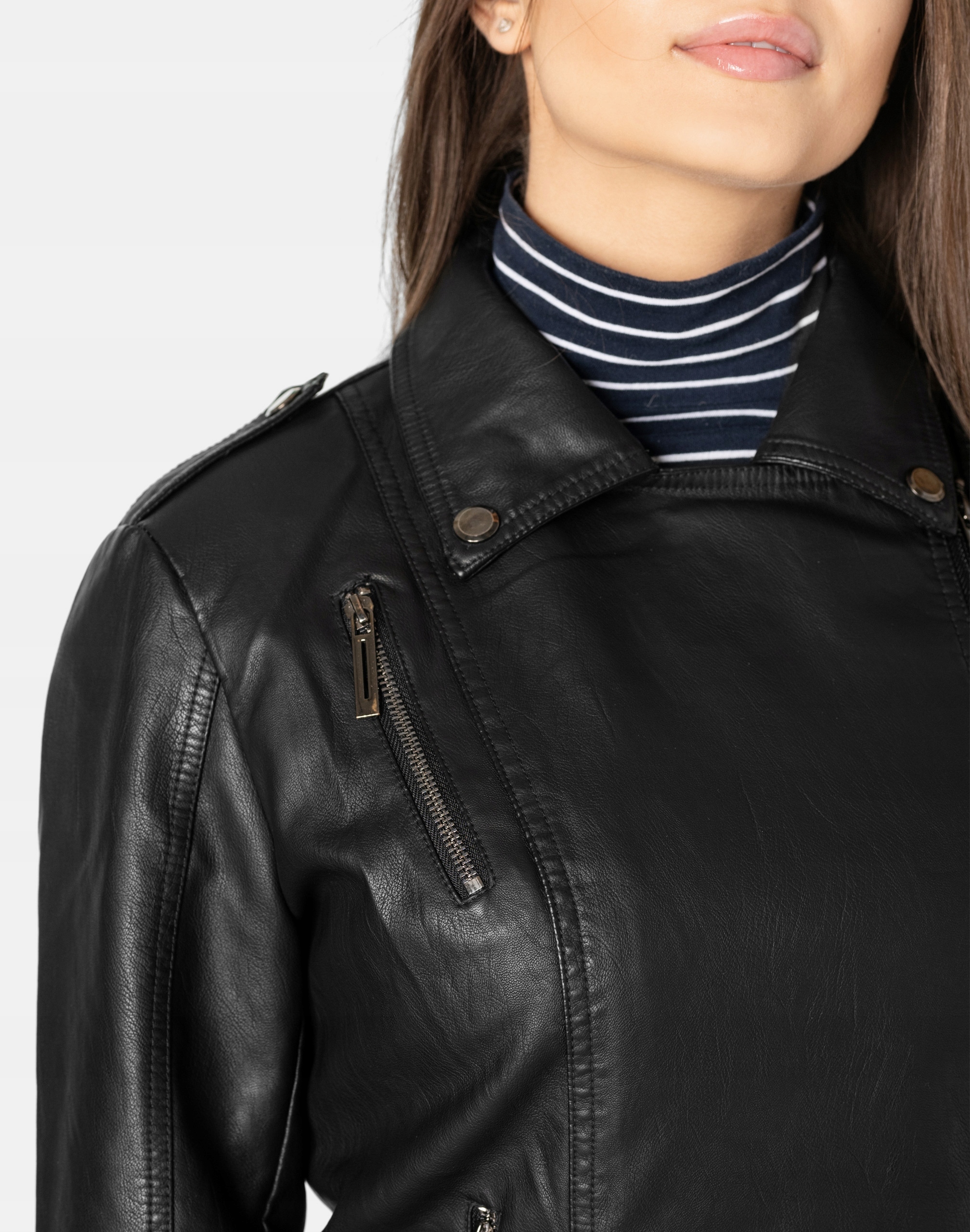 Damska, klasyczna, ponadczasowa ramoneska z zamkami w zawsze modnym czarnym kolorze. Jej motocyklowy styl i ozdobne zamki podkreślają niezależność i buntowniczy pazur który dodaje kurtce wyjątkowego charakteru.