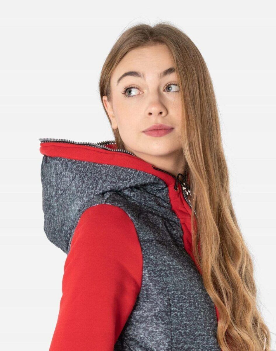 Znakomicie sprawdzi się w chłodniejsze dni a praktyczny podwójnie ocieplony puchem syntetycznym i bawełnianą podszewką kaptur skutecznie ochroni Twoją głowę przed deszczem, wiatrem i chłodem. Bluza jest unikalnym połączeniem wysokiej jakości tkaniny bawełnianej (rękawy) i tkaniny poliestrowej (pozostała część bluzy), zapewniając wygodę i komfort termiczny użytkowania, nawet w mniej sprzyjających warunkach pogodowych. Tkanina poliestrowa jest 100% wiatroszczelna i posiada wykończenie typu Water Repellency, które zapobiega nasączeniu warstwy zewnętrznej wodą. Bluza jest lekko ocieplona puchem syntetycznym i zasuwana w całości wraz z kapturem na zamek błyskawiczny. Posiada dwie wpuszczane kieszenie na dłonie zasuwane na kryte zamki błyskawiczne. Dół bluzy oraz rękawy zakończone są elastycznym ściągaczem co pozwala na precyzyjne dopasowanie do ciała i zapobiega utracie ciepła. Wewnętrzna strona bluzy wykończona jest materiałową podszewką. Długość midi, która z powodzeniem zakrywa części ciała wrażliwe na chłód jak plecy na wysokości nerek i pośladki. Fason dostosowany do kobiecej budowy ciała doskonale wyprofilowana konstrukcja efektownie podkreślająca kobiecą sylwetkę. Modny układ pikowanych, lekko ocieplonych, wiatroszczelnych i wodoodpornych paneli został efektownie połączony z bawełnianymi rękawami tworząc najmodniejszy obecnie styl prezentowany szeroko na modowych blogach.