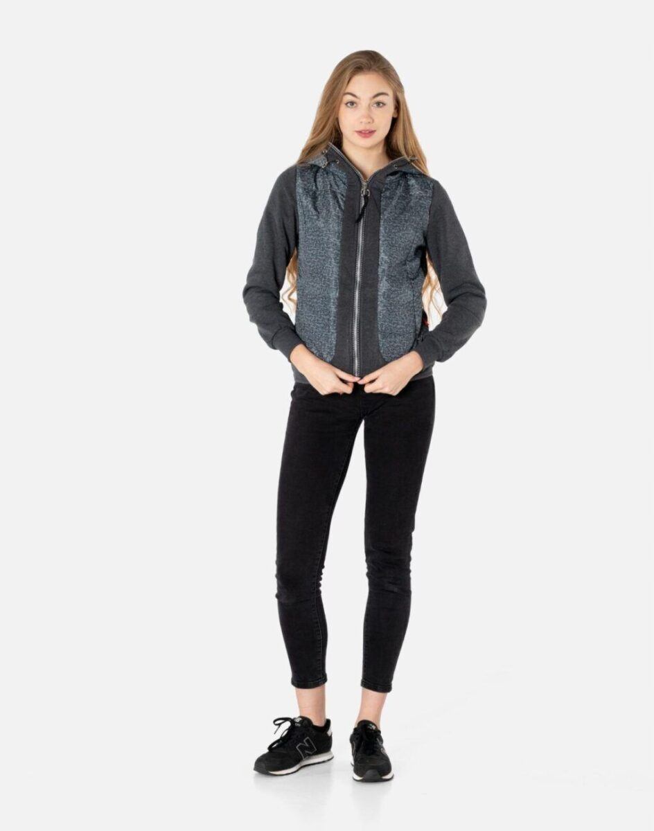 Znakomicie sprawdzi się w chłodniejsze dni a praktyczny podwójnie ocieplony puchem syntetycznym i bawełnianą podszewką kaptur skutecznie ochroni Twoją głowę przed deszczem, wiatrem i chłodem. Bluza jest unikalnym połączeniem wysokiej jakości tkaniny bawełnianej (rękawy) i tkaniny poliestrowej (pozostała część bluzy), zapewniając wygodę i komfort termiczny użytkowania, nawet w mniej sprzyjających warunkach pogodowych. Tkanina poliestrowa jest 100% wiatroszczelna i posiada wykończenie typu Water Repellency, które zapobiega nasączeniu warstwy zewnętrznej wodą. Bluza jest lekko ocieplona puchem syntetycznym i zasuwana w całości wraz z kapturem na zamek błyskawiczny. Posiada dwie wpuszczane kieszenie na dłonie zasuwane na kryte zamki błyskawiczne. Dół bluzy oraz rękawy zakończone są elastycznym ściągaczem co pozwala na precyzyjne dopasowanie do ciała i zapobiega utracie ciepła. Wewnętrzna strona bluzy wykończona jest materiałową podszewką. Długość midi, która z powodzeniem zakrywa części ciała wrażliwe na chłód jak plecy na wysokości nerek i pośladki. Fason dostosowany do kobiecej budowy ciała doskonale wyprofilowana konstrukcja efektownie podkreślająca kobiecą sylwetkę. Modny układ pikowanych, lekko ocieplonych, wiatroszczelnych i wodoodpornych paneli został efektownie połączony z bawełnianymi rękawami tworząc najmodniejszy obecnie styl prezentowany szeroko na modowych blogach.