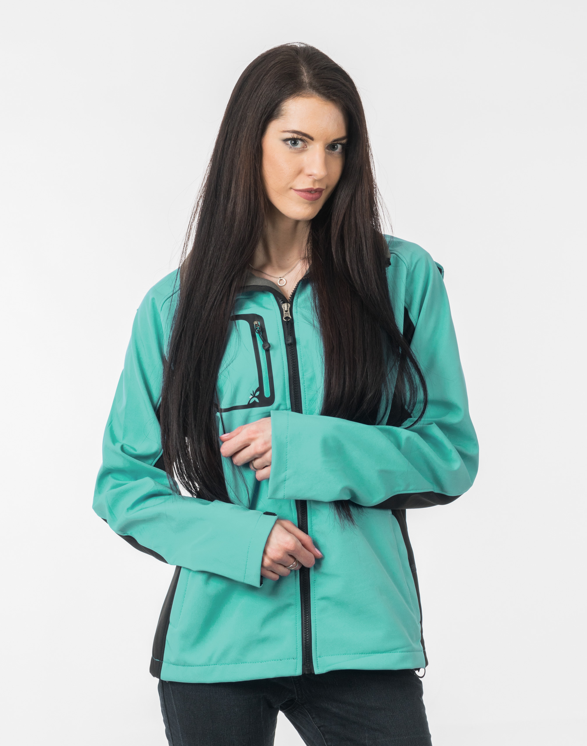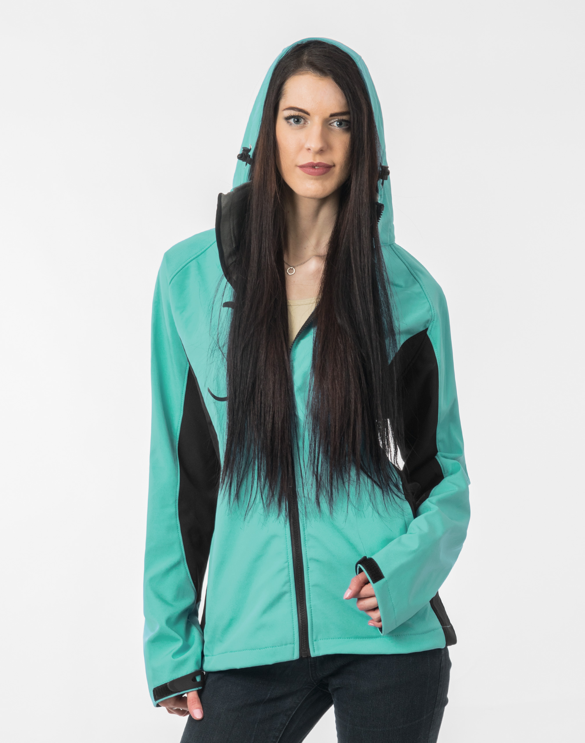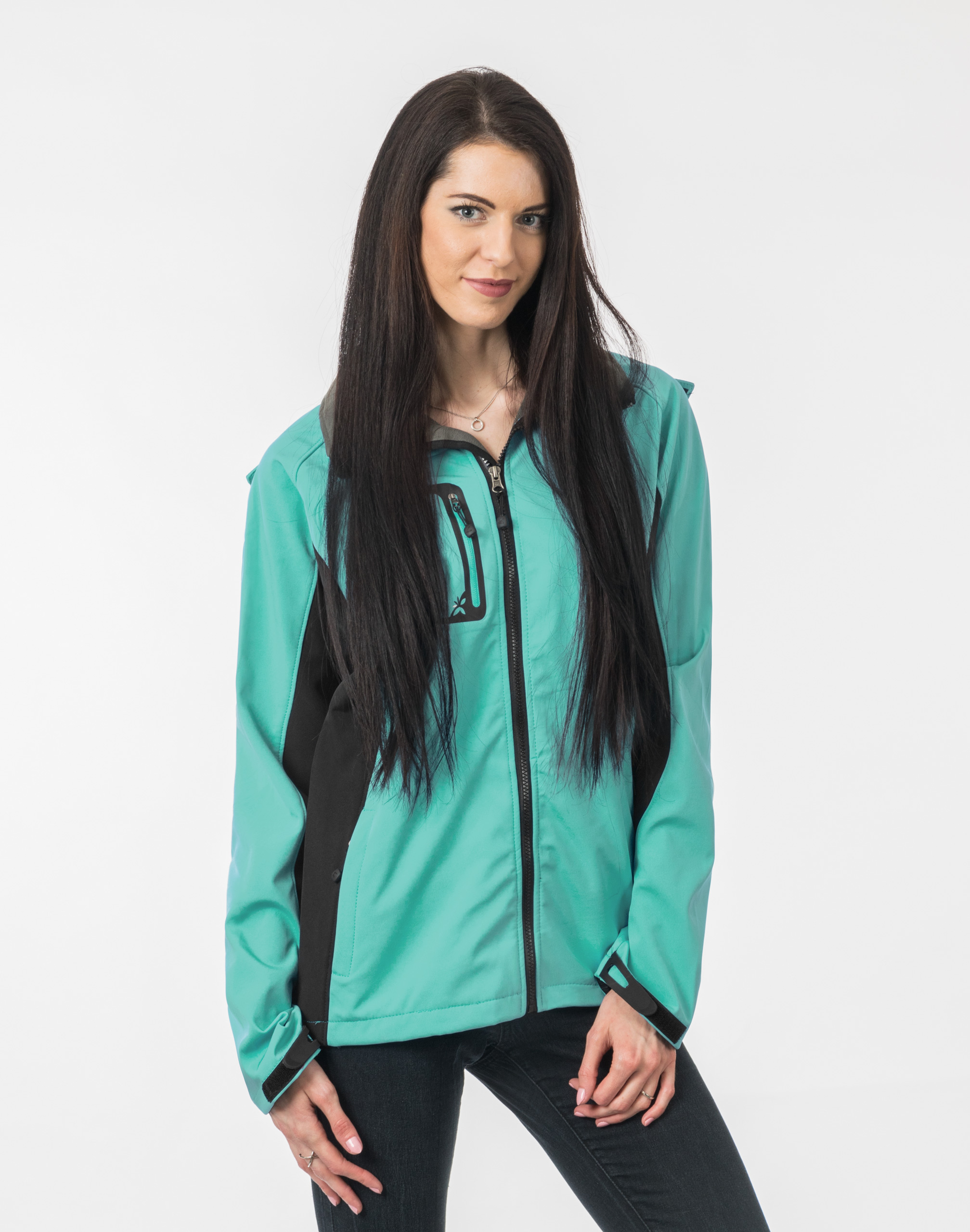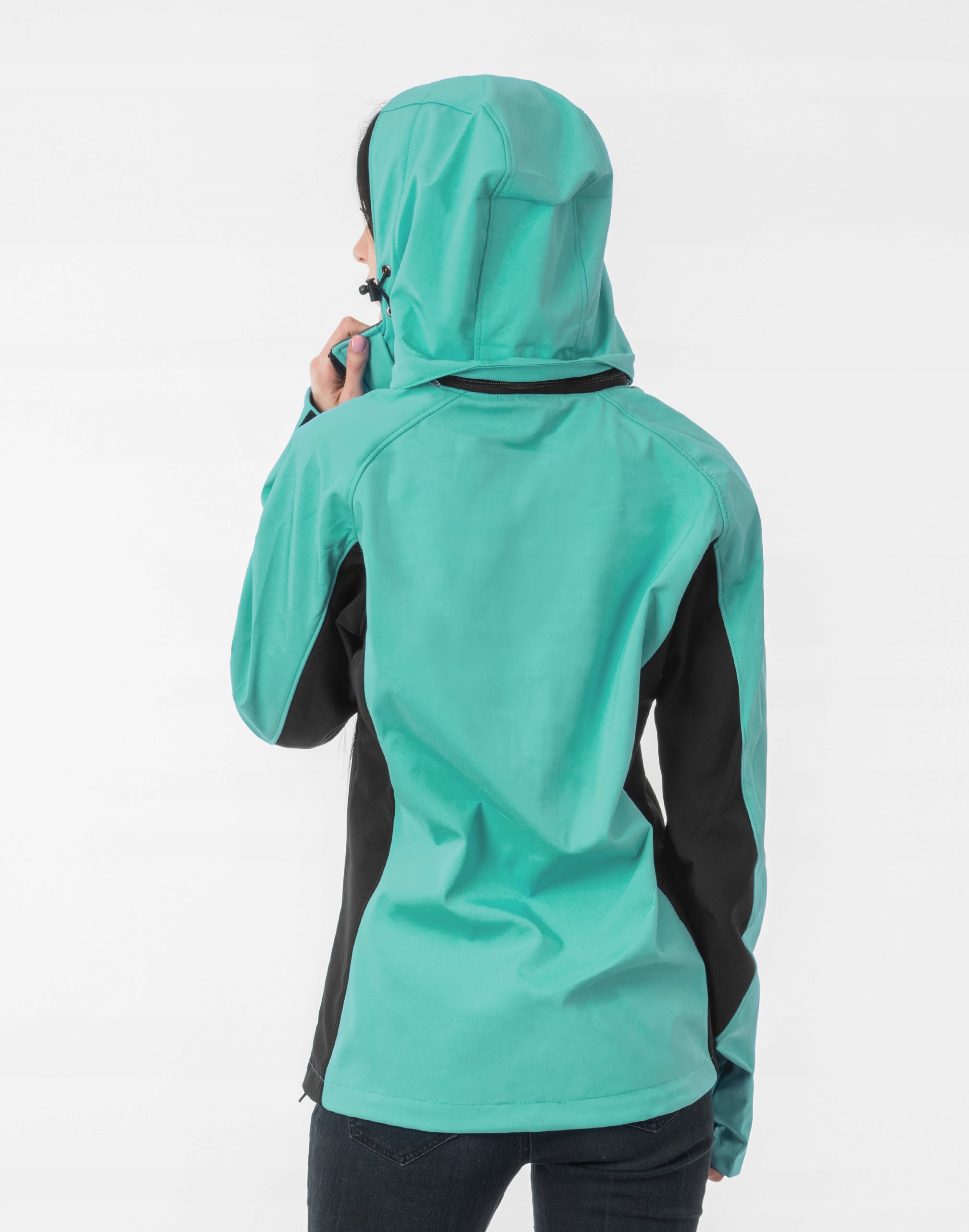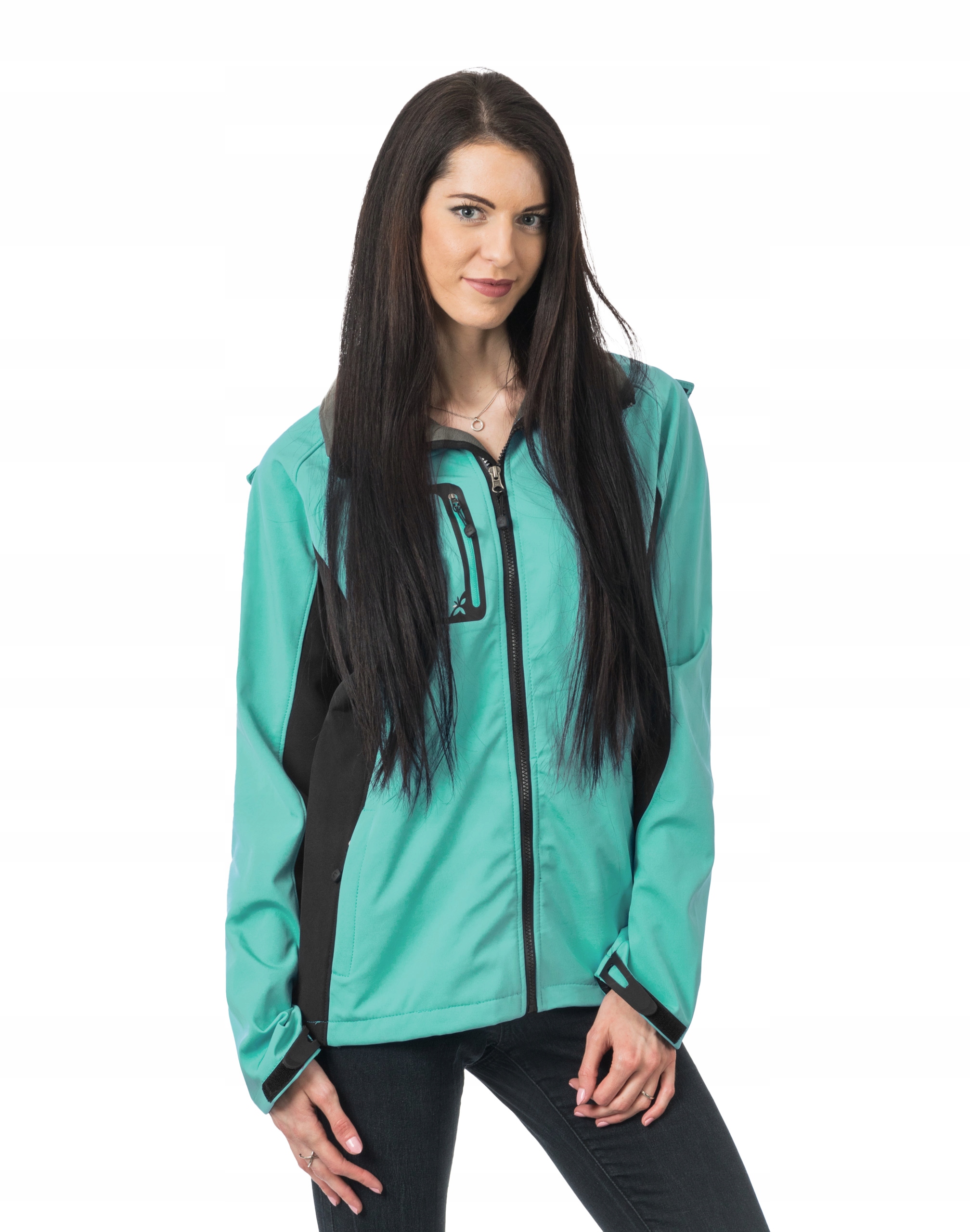 Softshell jest tkaniną składającą się z trzech warstw. Materiał na zewnątrz posiada wykończenie typu Water Repellency, który zapobiega nasączeniu warstwy zewnętrznej wodą. Wewnętrzna strona materiału utrzymująca ciepło to polar. Oddychająca membrana umieszczona pomiędzy warstwą zewnętrzną a wewnętrzną umożliwia odprowadzanie wilgoci na zewnątrz. Materiał zewnętrzny jest wiatroszczelny (WINDPROOF ), wodoodporny (WATERPROOF) i oddychający (BREATHABLE). Aby uniknąć przenikania wody do wnętrza kurtki szwy mają podwójne przeszycia dzięki czemu są w 100% wodoszczelne. Praktyczny odpinany na zamek błyskawiczny i ocieplony polarem kaptur posiada możliwość połączenia go z za pomocą rzep z kołnierzem oraz regulacji jego wielkości i dopasowania. Skutecznie osłoni Twoją głowę przed deszczem, wiatrem i chłodem. Wysoki kołnierz/stójka skutecznie chroni podbródek i szyję a często zastępuje nawet szalik co jest bardzo wygodne. Kurtka posiada dwie kieszenie przednie na dłonie, zasuwane na kryte zamki błyskawiczne oraz pionową kieszeń na prawej piersi zasuwaną na zamek błyskawiczny. Wewnątrz dwie kieszenie naszywane. Ściągacze regulacyjne na dole kurtki oraz przy kapturze z gumką i stoperem, a w rękawach regulowane mankiety na rzepy pozwalają na precyzyjne dopasowanie kurtki do ciała, co znacznie zapobiega utracie ciepła i skutecznie chroni przed podmuchami wiatru. Wewnętrzna strona kurtki jest ocieplona przyjaznym dla ciała polarem. Talia zgrabnie podkreślona doskonale wyprofilowana konstrukcja. Modny sportowy krój efektownie podkreślający kobiecą sylwetkę prezentowany obecnie szeroko na modowych blogach.