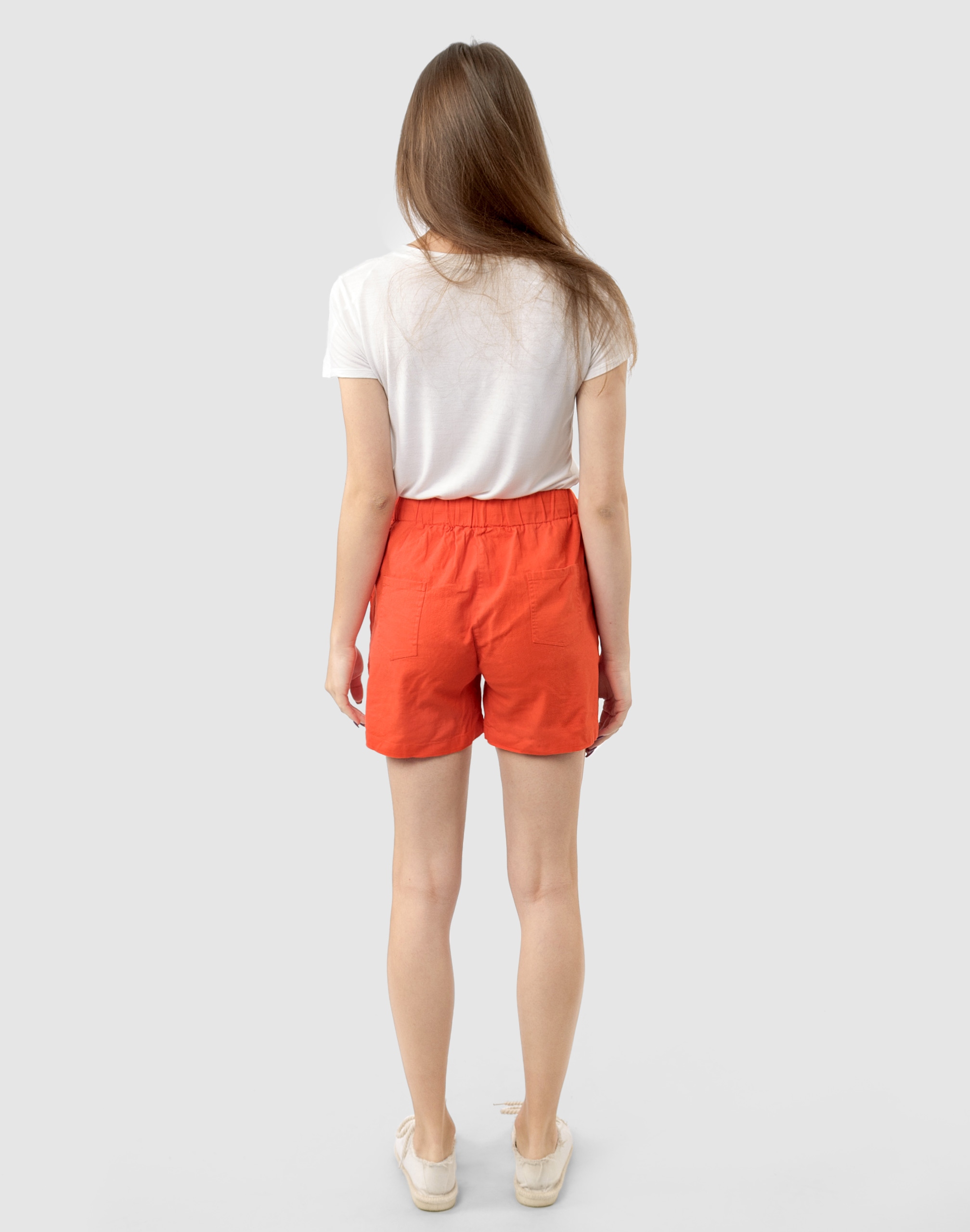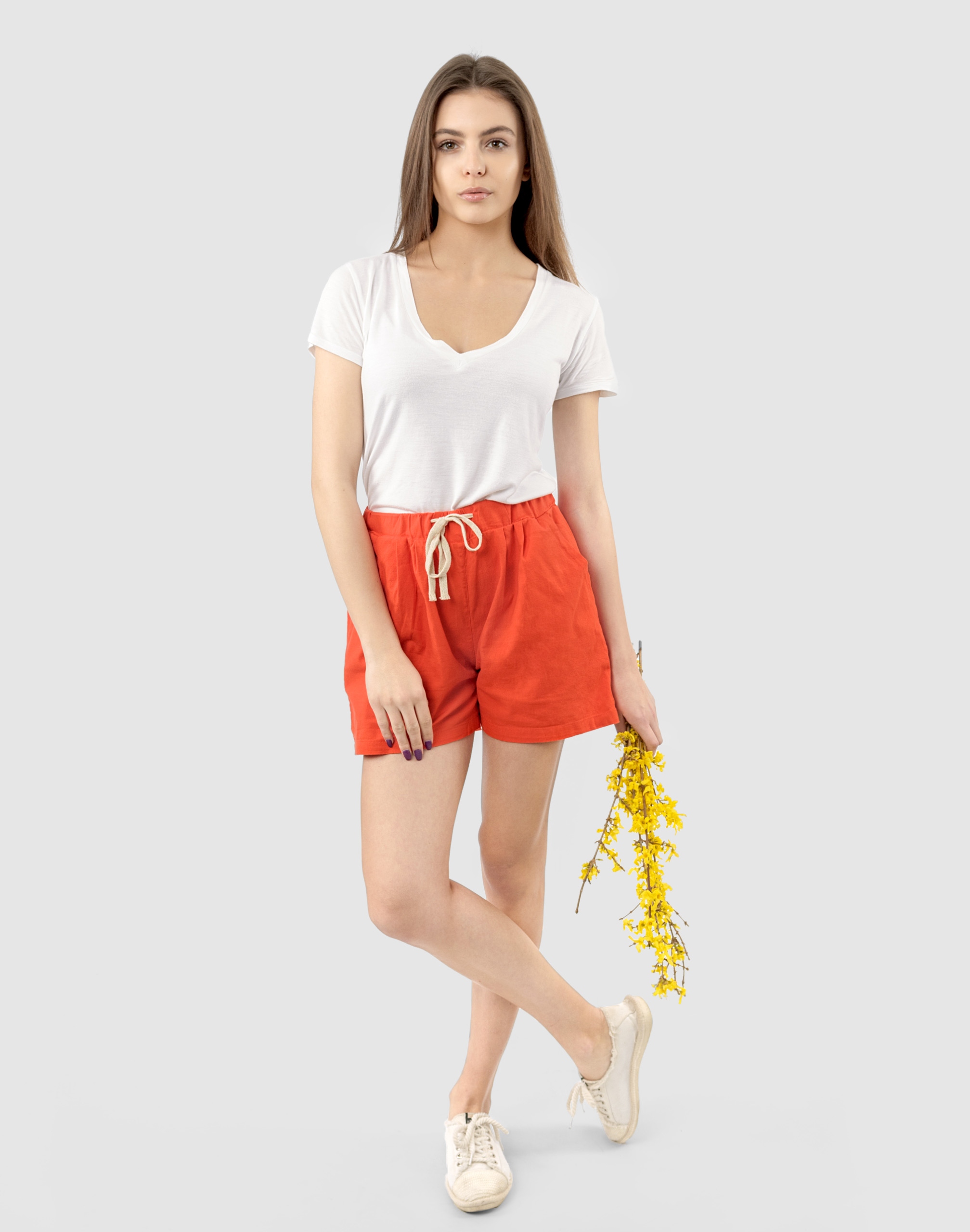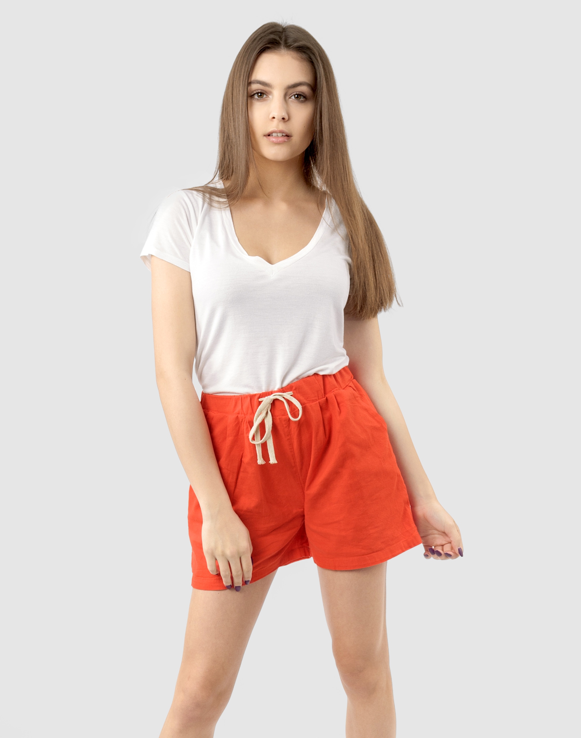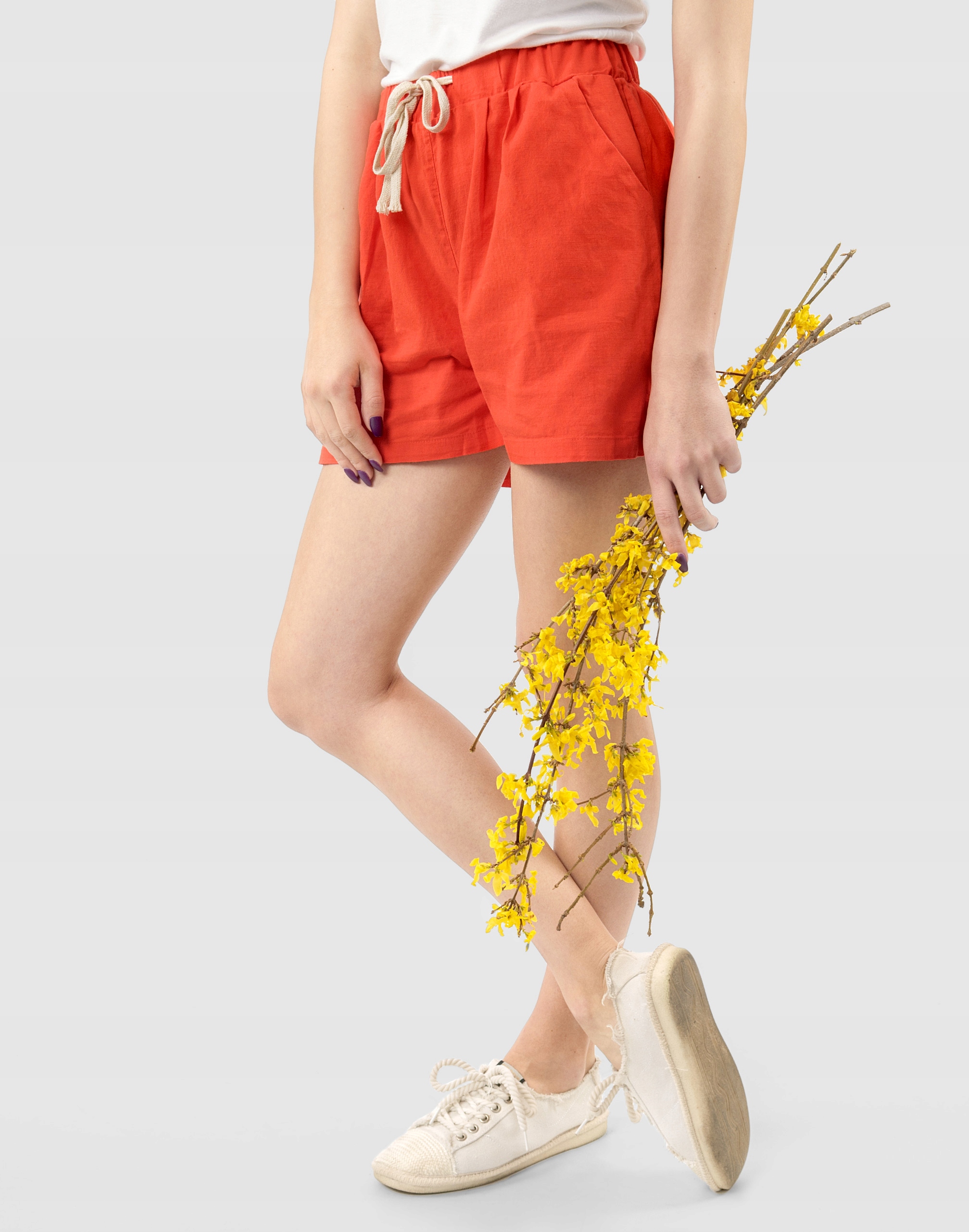 Od kilku sezonów absolutnym hitem podczas słonecznych dni są szorty damskie. Wyjątkowo lekkie i przewiewne spodenki bawełniane z wysokim stanem i krótką nogawką to jeden z najczęściej wybieranych na ciepłe i gorące dni wiosny i lata model spodni. Wykonane z wysokiej jakości cienkiej tkaniny bawełnianej o jednolitym wybarwieniu (do złudzenia przypominającej naturalny len) z niewielkim dodatkiem elastanu. Dobry i sprawdzony krój spodenek nie ogranicza swobody ruchów a odpowiednia na wysokie temperatury gramatura tkaniny pozytywnie wpływa na komfort użytkowania. Niewielki dodatek elastanu sprawia, że spodenki są bardziej elastyczne co pozwala na pełną swobodę ruchów, daje wygodę przy siadaniu i zapewnia ogromny komfort noszenia. W talii posiadają szeroki elastyczny pas ściągający oraz dodatkowo wpuszczoną w pasek taśmę regulacyjną z możliwością jej zawiązywania. Z przodu dwie wpuszczane zaokrąglone kieszonki na dłonie, a z tyłu klasyczne kieszonki naszywane. Idealne na co dzień jako element casualowego stroju czyniąc go lekkim i dostosowanym do wysokich temperatur.