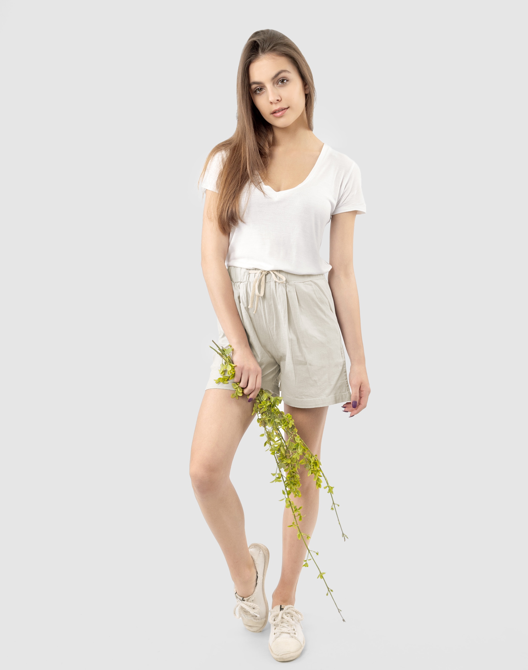 Od kilku sezonów absolutnym hitem podczas słonecznych dni są szorty damskie. Wyjątkowo lekkie i przewiewne spodenki bawełniane z wysokim stanem i krótką nogawką to jeden z najczęściej wybieranych na ciepłe i gorące dni wiosny i lata model spodni. Wykonane z wysokiej jakości cienkiej tkaniny bawełnianej o jednolitym wybarwieniu (do złudzenia przypominającej naturalny len) z niewielkim dodatkiem elastanu. Dobry i sprawdzony krój spodenek nie ogranicza swobody ruchów a odpowiednia na wysokie temperatury gramatura tkaniny pozytywnie wpływa na komfort użytkowania. Niewielki dodatek elastanu sprawia, że spodenki są bardziej elastyczne co pozwala na pełną swobodę ruchów, daje wygodę przy siadaniu i zapewnia ogromny komfort noszenia. W talii posiadają szeroki elastyczny pas ściągający oraz dodatkowo wpuszczoną w pasek taśmę regulacyjną z możliwością jej zawiązywania. Z przodu dwie wpuszczane zaokrąglone kieszonki na dłonie, a z tyłu klasyczne kieszonki naszywane. Idealne na co dzień jako element casualowego stroju czyniąc go lekkim i dostosowanym do wysokich temperatur.