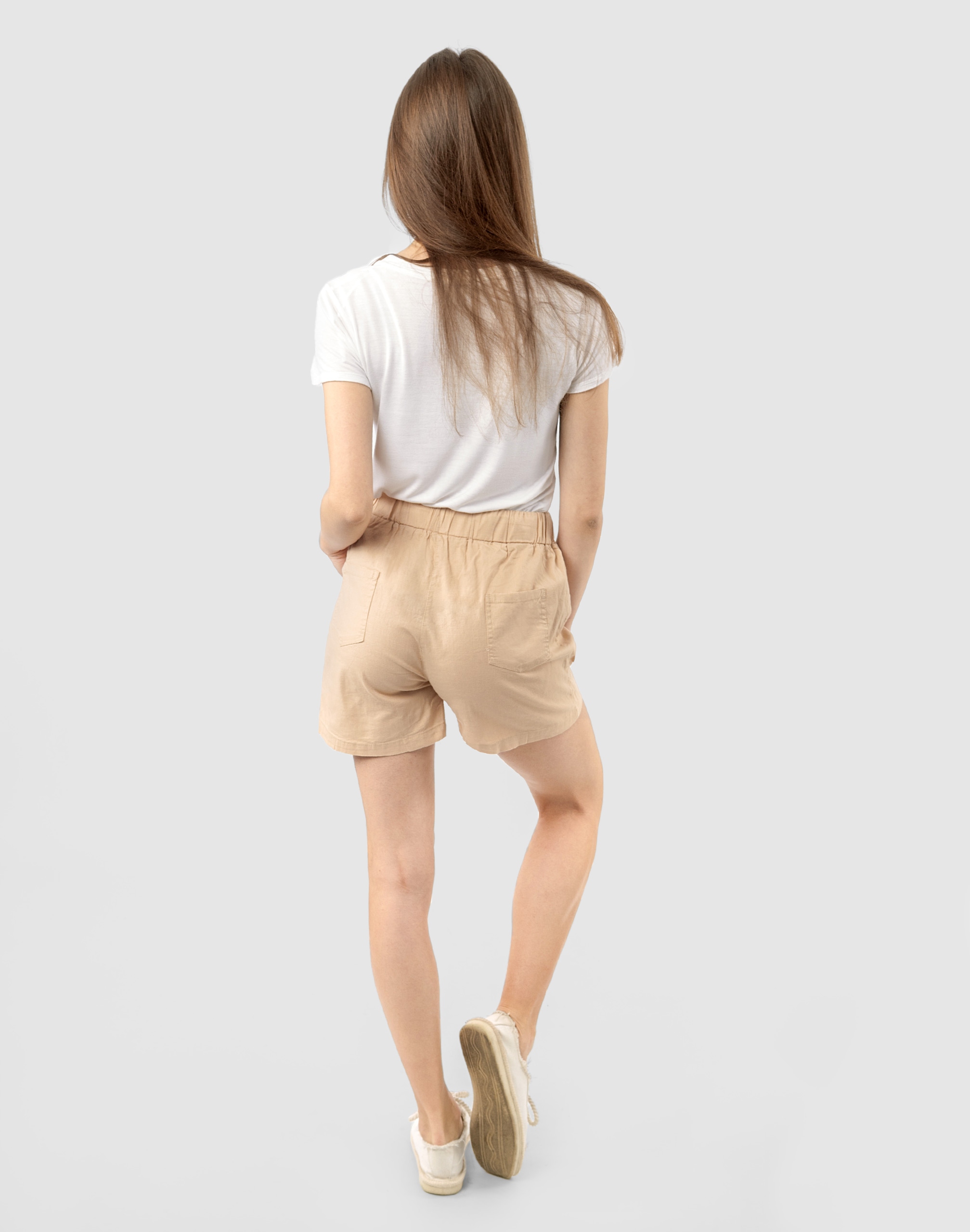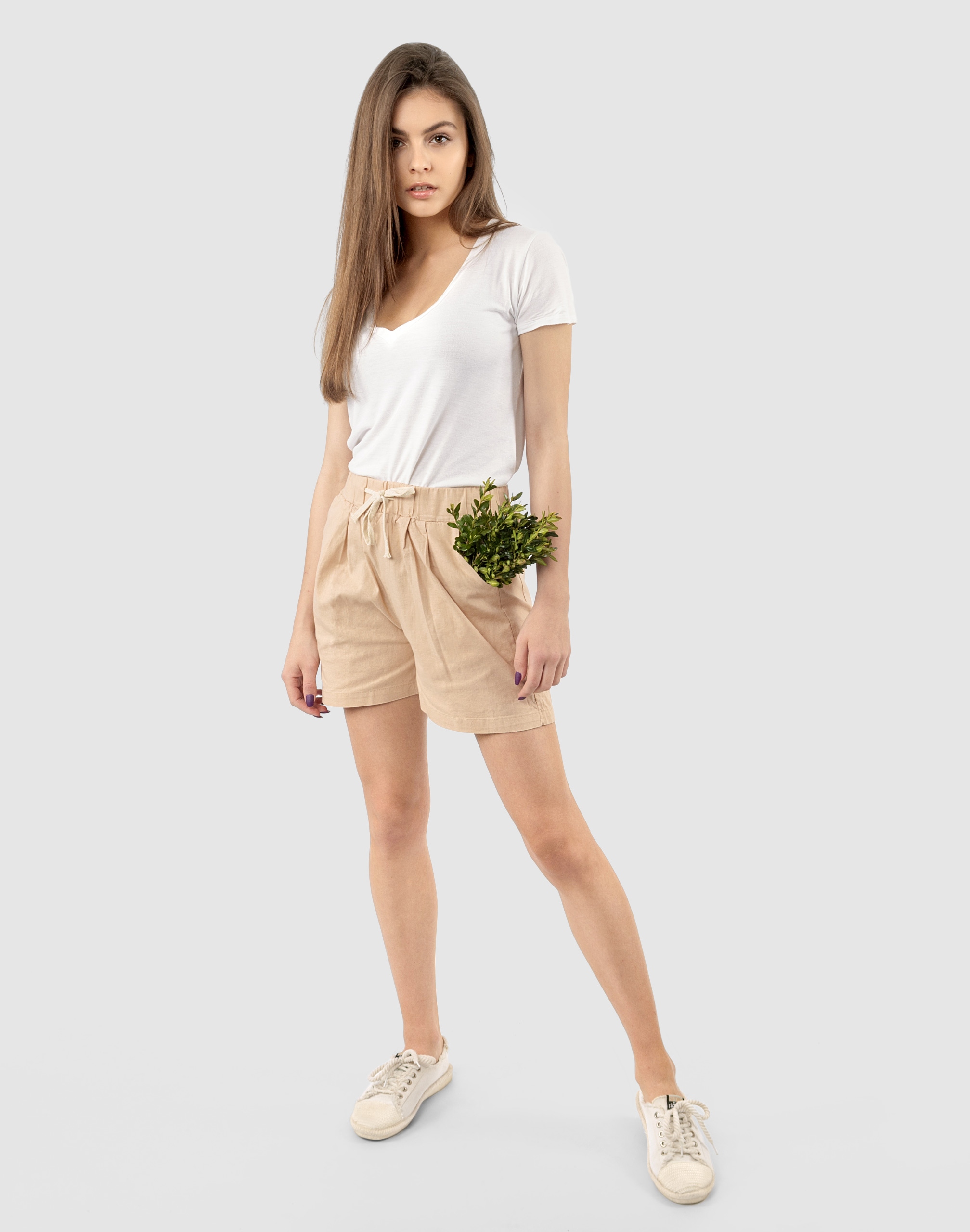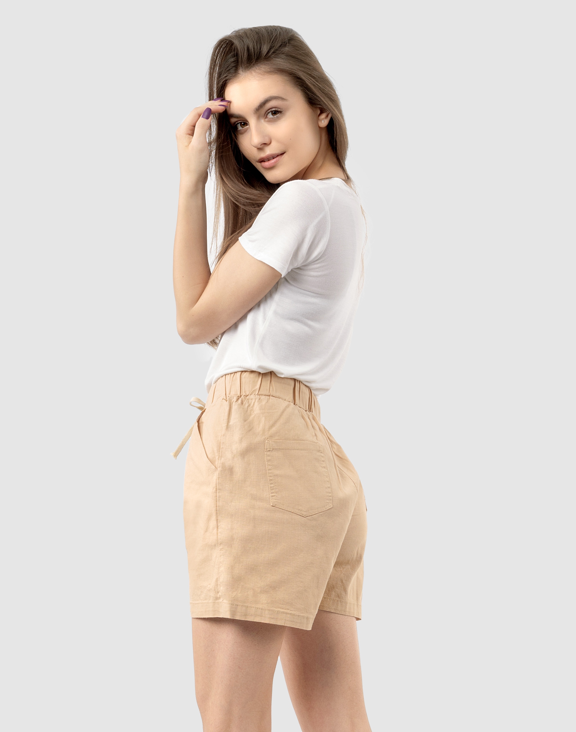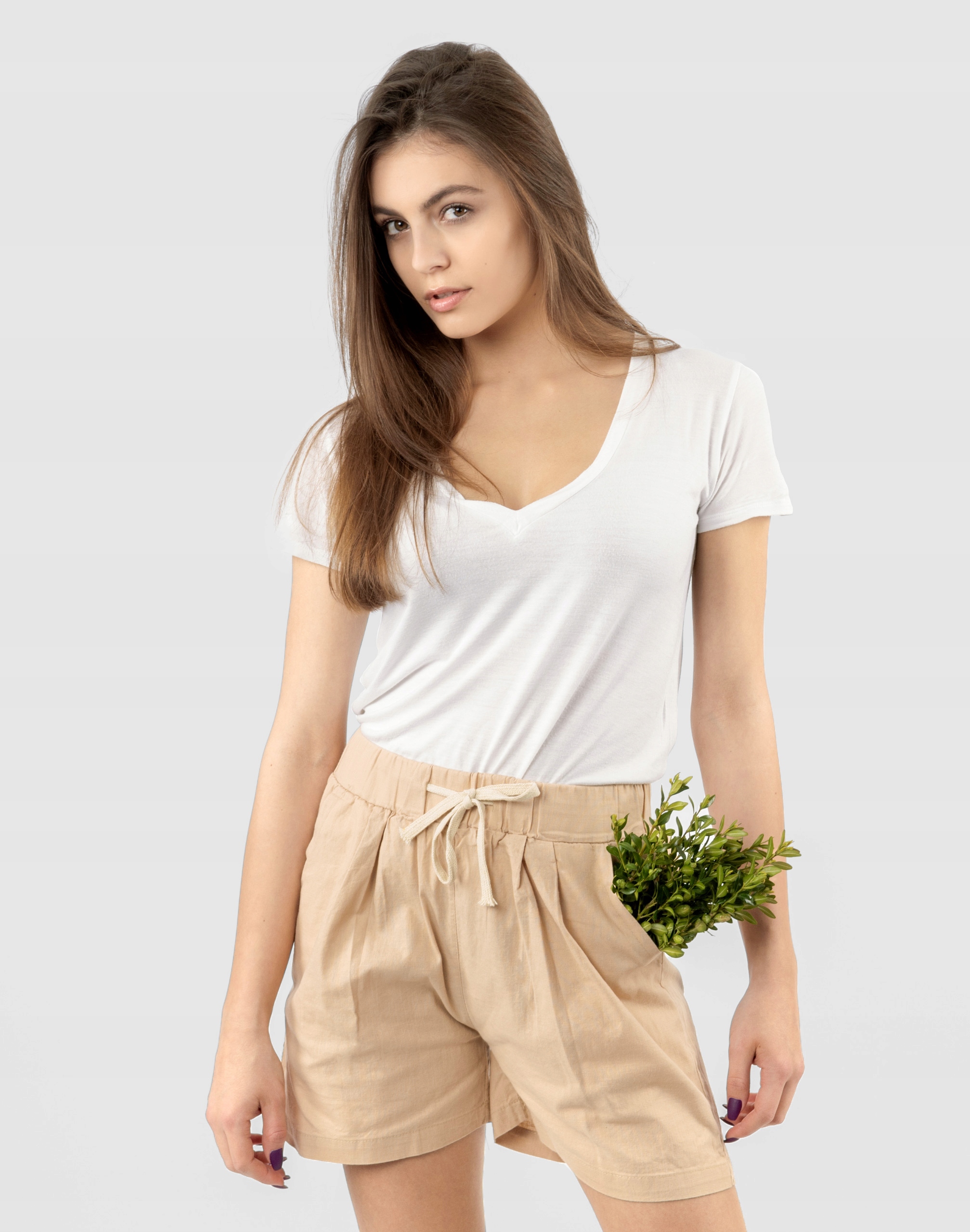 Od kilku sezonów absolutnym hitem podczas słonecznych dni są szorty damskie. Wyjątkowo lekkie i przewiewne spodenki bawełniane z wysokim stanem i krótką nogawką to jeden z najczęściej wybieranych na ciepłe i gorące dni wiosny i lata model spodni. Wykonane z wysokiej jakości cienkiej tkaniny bawełnianej o jednolitym wybarwieniu (do złudzenia przypominającej naturalny len) z niewielkim dodatkiem elastanu. Dobry i sprawdzony krój spodenek nie ogranicza swobody ruchów a odpowiednia na wysokie temperatury gramatura tkaniny pozytywnie wpływa na komfort użytkowania. Niewielki dodatek elastanu sprawia, że spodenki są bardziej elastyczne co pozwala na pełną swobodę ruchów, daje wygodę przy siadaniu i zapewnia ogromny komfort noszenia. W talii posiadają szeroki elastyczny pas ściągający oraz dodatkowo wpuszczoną w pasek taśmę regulacyjną z możliwością jej zawiązywania. Z przodu dwie wpuszczane zaokrąglone kieszonki na dłonie, a z tyłu klasyczne kieszonki naszywane. Idealne na co dzień jako element casualowego stroju czyniąc go lekkim i dostosowanym do wysokich temperatur.