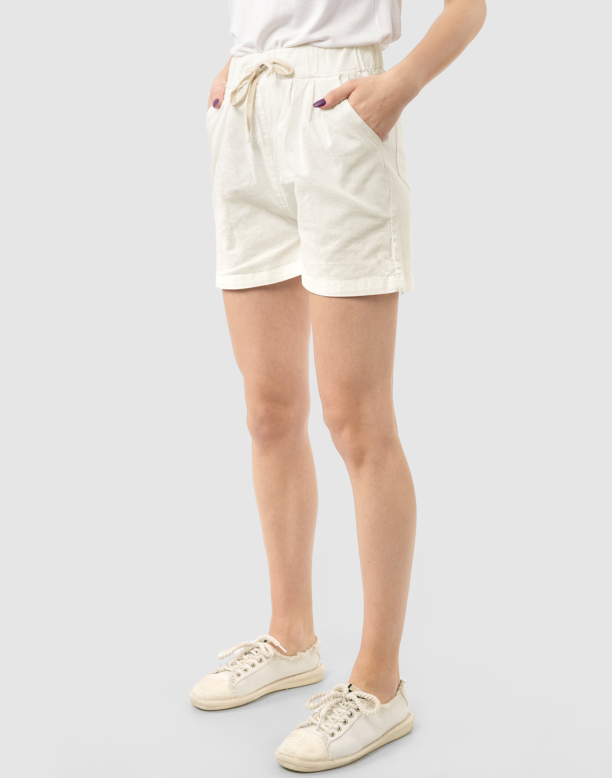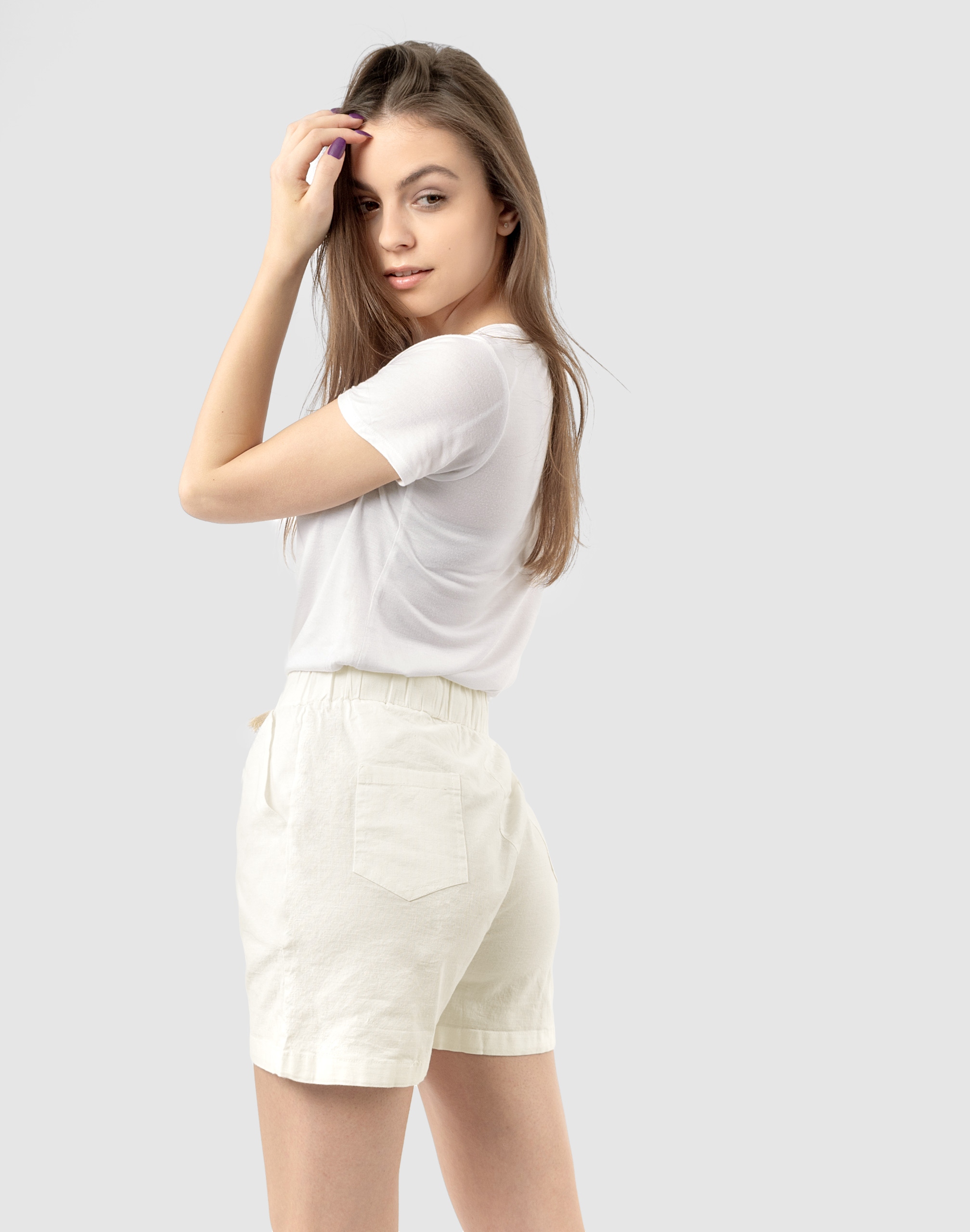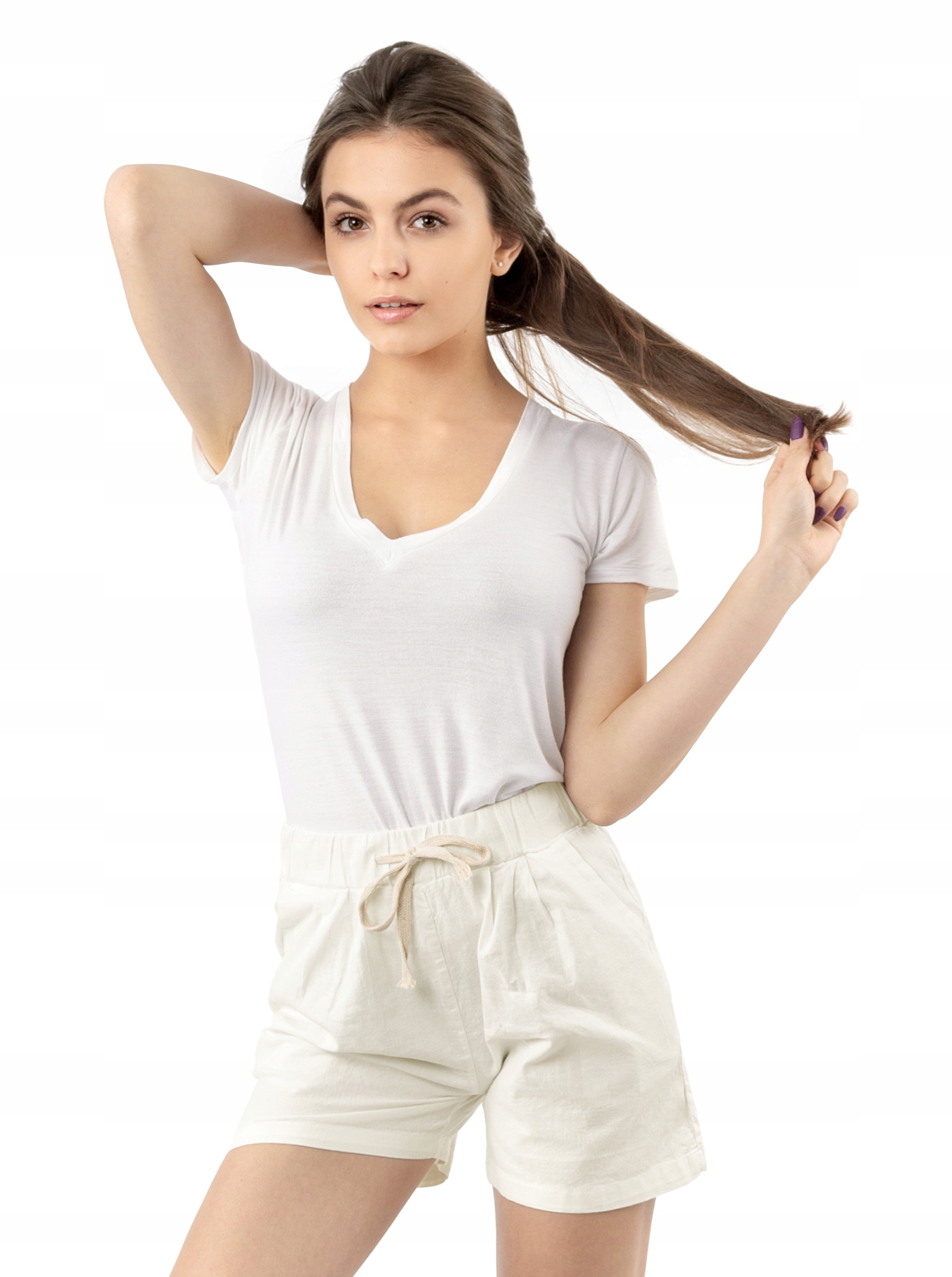 Od kilku sezonów absolutnym hitem podczas słonecznych dni są szorty damskie. Wyjątkowo lekkie i przewiewne spodenki bawełniane z wysokim stanem i krótką nogawką to jeden z najczęściej wybieranych na ciepłe i gorące dni wiosny i lata model spodni. Wykonane z wysokiej jakości cienkiej tkaniny bawełnianej o jednolitym wybarwieniu (do złudzenia przypominającej naturalny len) z niewielkim dodatkiem elastanu. Dobry i sprawdzony krój spodenek nie ogranicza swobody ruchów a odpowiednia na wysokie temperatury gramatura tkaniny pozytywnie wpływa na komfort użytkowania. Niewielki dodatek elastanu sprawia, że spodenki są bardziej elastyczne co pozwala na pełną swobodę ruchów, daje wygodę przy siadaniu i zapewnia ogromny komfort noszenia. W talii posiadają szeroki elastyczny pas ściągający oraz dodatkowo wpuszczoną w pasek taśmę regulacyjną z możliwością jej zawiązywania. Z przodu dwie wpuszczane zaokrąglone kieszonki na dłonie, a z tyłu klasyczne kieszonki naszywane. Idealne na co dzień jako element casualowego stroju czyniąc go lekkim i dostosowanym do wysokich temperatur.