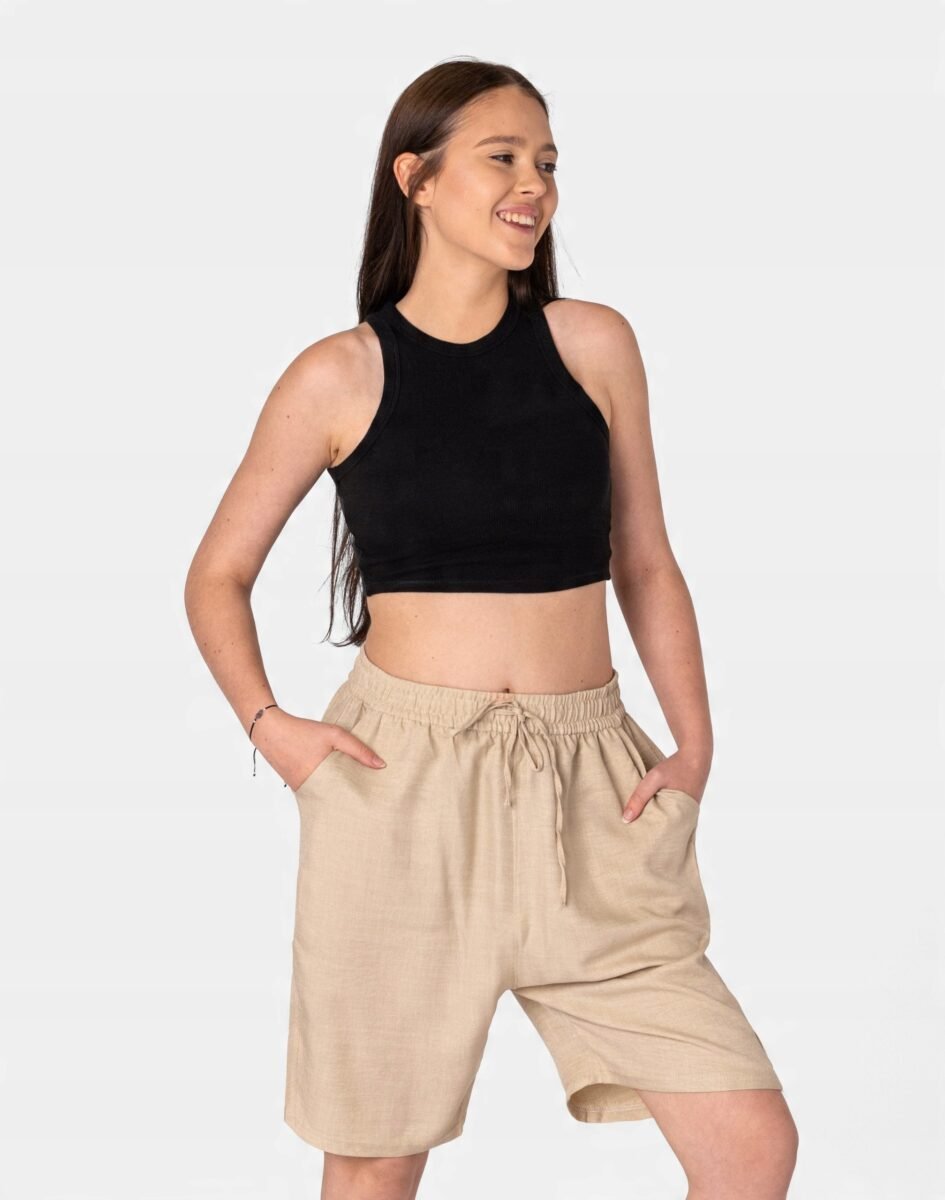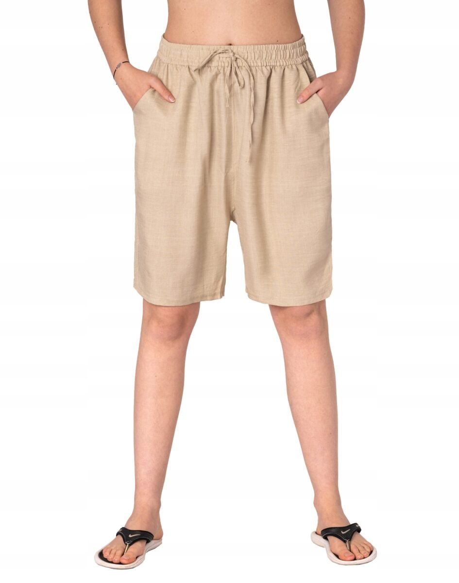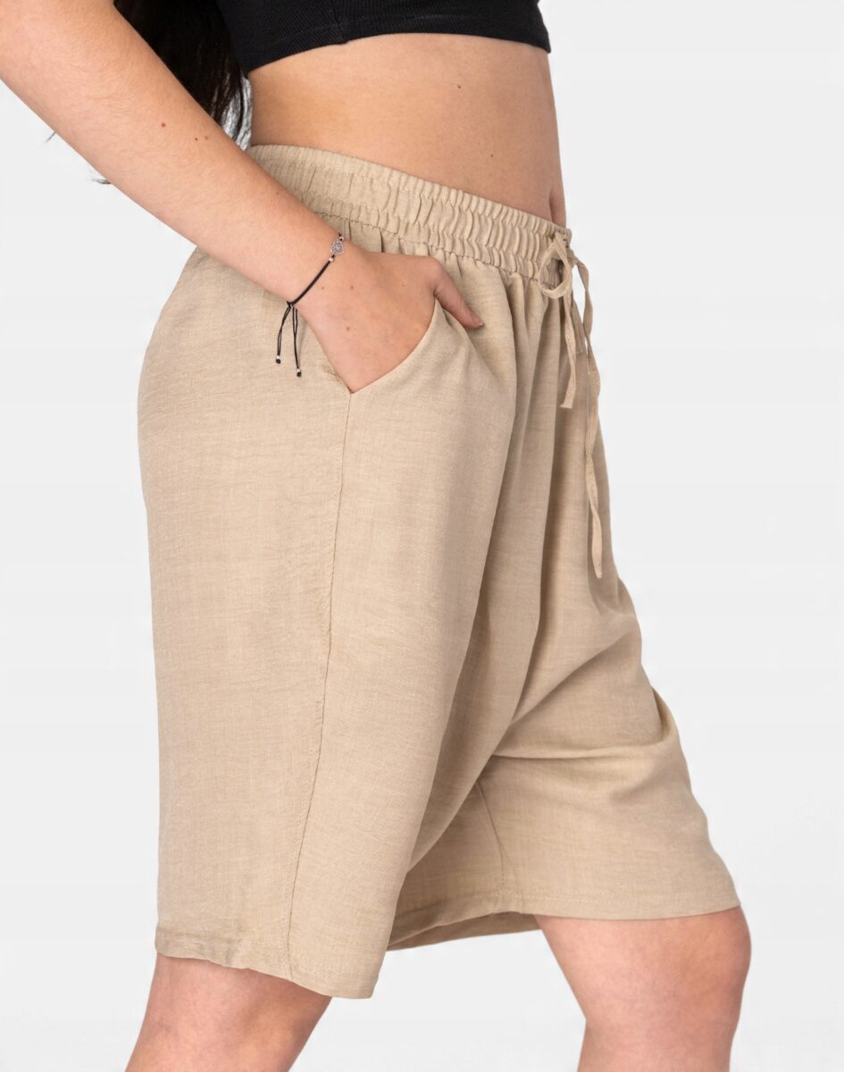 Wyjątkowo lekkie i przewiewne krótkie spodenki damskie z wysokim stanem, luźną nogawką 1/2, to jeden z najczęściej wybieranych na ciepłe i gorące dni wiosny i lata modeli spodenek. Wykonane z wysokiej jakości cienkiej i oddychającej, zwiewnej tkaniny bawełnianej o jednolitym wybarwieniu do złudzenia przypominającej naturalny len. Odpowiedni na wysokie temperatury luźny krój spodni nie ogranicza swobody ruchów, a niewielka gramatura tkaniny (140 g/m2) pozytywnie wpływa na komfort użytkowania. Z założenia wyróżniają się dużą wygodą a dopasowanie w pasie zapewnia szeroki, elastyczny pas ściągający zgrabnie modelujący sylwetkę w talii oraz dodatkowo wpuszczoną w pasek taśma regulacyjna z możliwością jej zawiązywania. Na bokach dwie wpuszczane kieszonki na dłonie. Idealne na co dzień jako element casualowego stroju czyniąc go lekkim i dostosowanym do wysokich temperatur.
