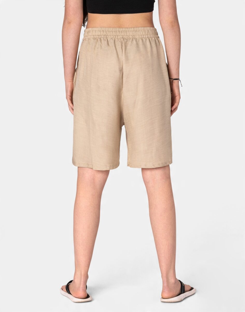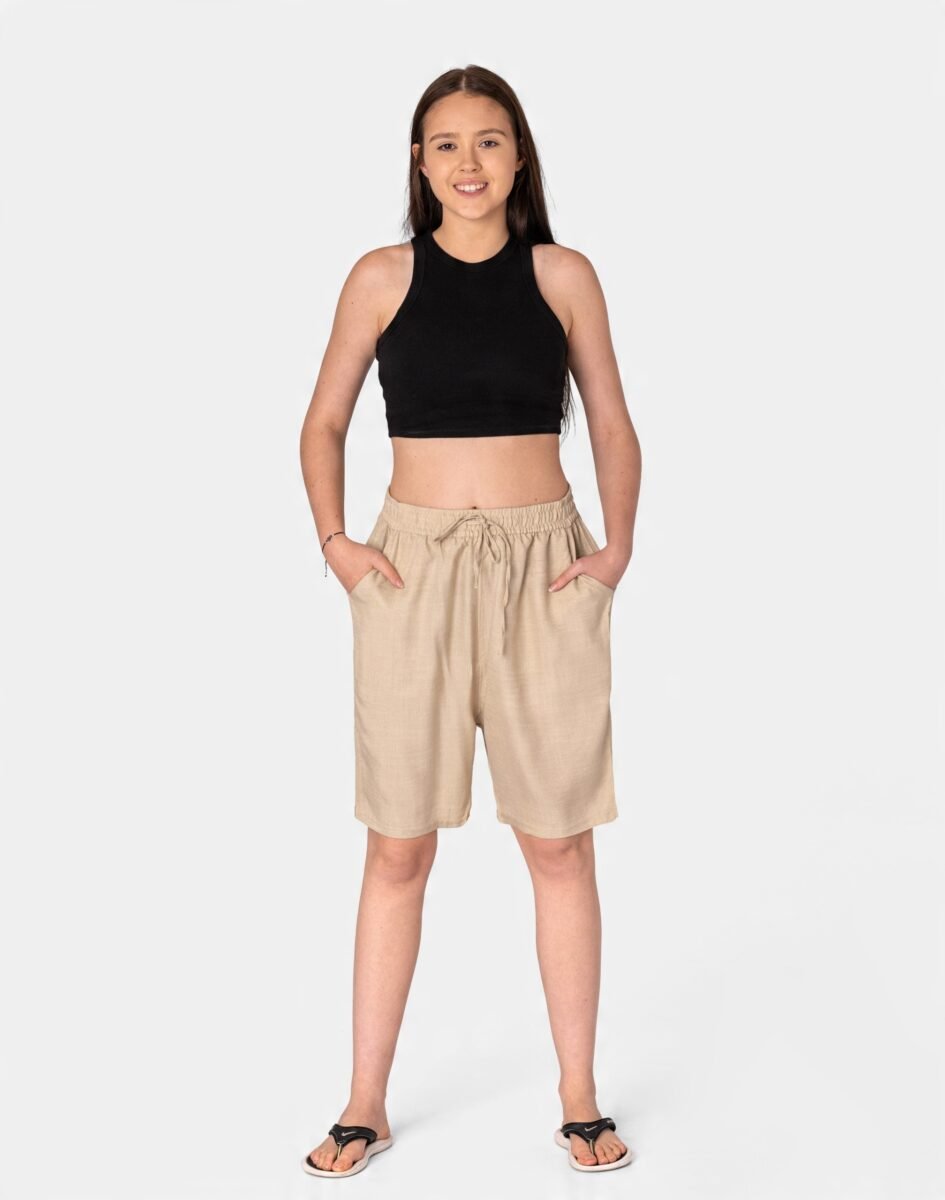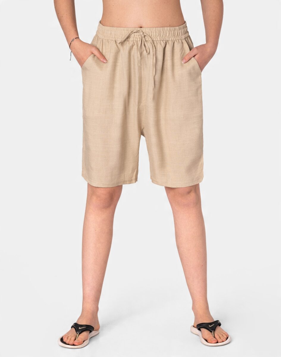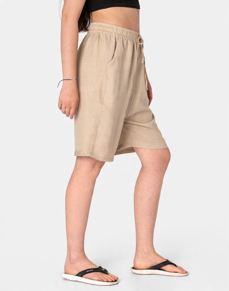 Wyjątkowo lekkie i przewiewne krótkie spodenki damskie z wysokim stanem, luźną nogawką 1/2, to jeden z najczęściej wybieranych na ciepłe i gorące dni wiosny i lata modeli spodenek. Wykonane z wysokiej jakości cienkiej i oddychającej, zwiewnej tkaniny bawełnianej o jednolitym wybarwieniu do złudzenia przypominającej naturalny len. Odpowiedni na wysokie temperatury luźny krój spodni nie ogranicza swobody ruchów, a niewielka gramatura tkaniny (140 g/m2) pozytywnie wpływa na komfort użytkowania. Z założenia wyróżniają się dużą wygodą a dopasowanie w pasie zapewnia szeroki, elastyczny pas ściągający zgrabnie modelujący sylwetkę w talii oraz dodatkowo wpuszczoną w pasek taśma regulacyjna z możliwością jej zawiązywania. Na bokach dwie wpuszczane kieszonki na dłonie. Idealne na co dzień jako element casualowego stroju czyniąc go lekkim i dostosowanym do wysokich temperatur.
