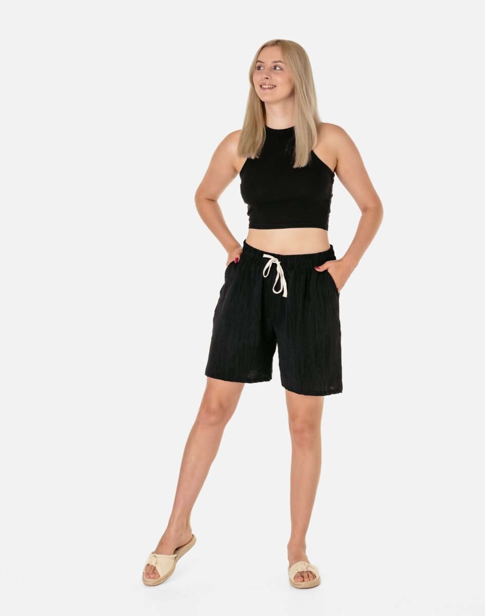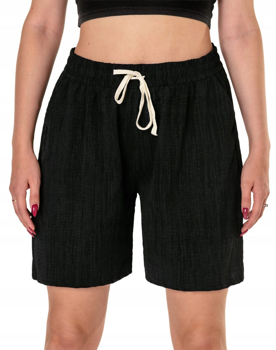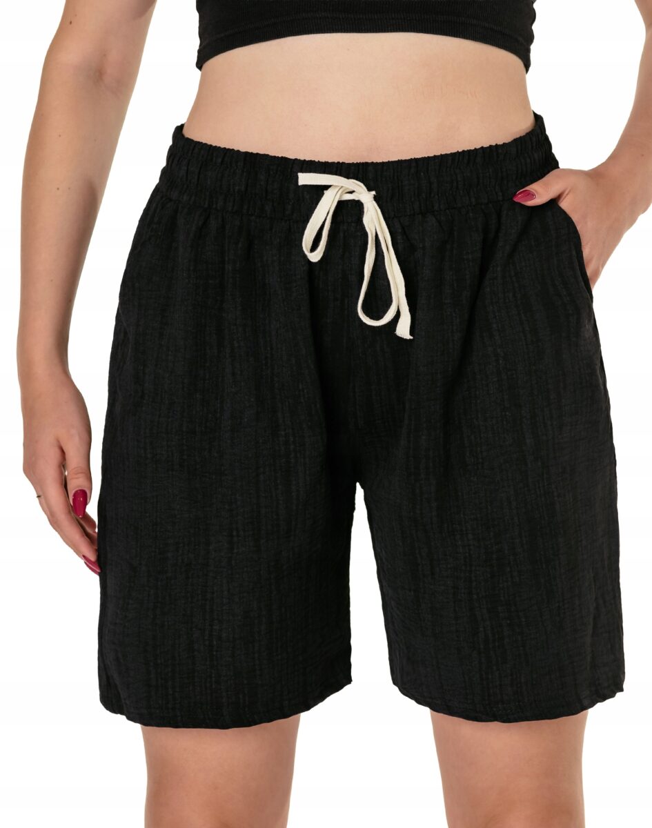Wyjątkowo lekkie i przewiewne krótkie spodenki damskie bawełniane z wysokim stanem i luźną, szeroką nogawką przed kolano to jeden z najczęściej wybieranych na ciepłe i gorące dni wiosny i lata modeli spodenek. Wykonane z wysokiej jakości cienkiej i oddychającej tkaniny bawełnianej o jednolitym wybarwieniu. Odpowiedni na wysokie temperatury luźny krój spodenek nie ogranicza swobody ruchów, a niewielka gramatura tkaniny (140 g/m2) pozytywnie wpływa na komfort użytkowania. Z założenia wyróżniają się dużą wygodą a dopasowanie w pasie zapewnia szeroki, elastyczny pas ściągający zgrabnie modelujący sylwetkę w talii oraz dodatkowo wpuszczoną w pasek taśma regulacyjna z możliwością jej zawiązywania. Na bokach dwie wpuszczane kieszonki na dłonie. Idealne na co dzień jako element casualowego stroju czyniąc go lekkim i dostosowanym do wysokich temperatur.