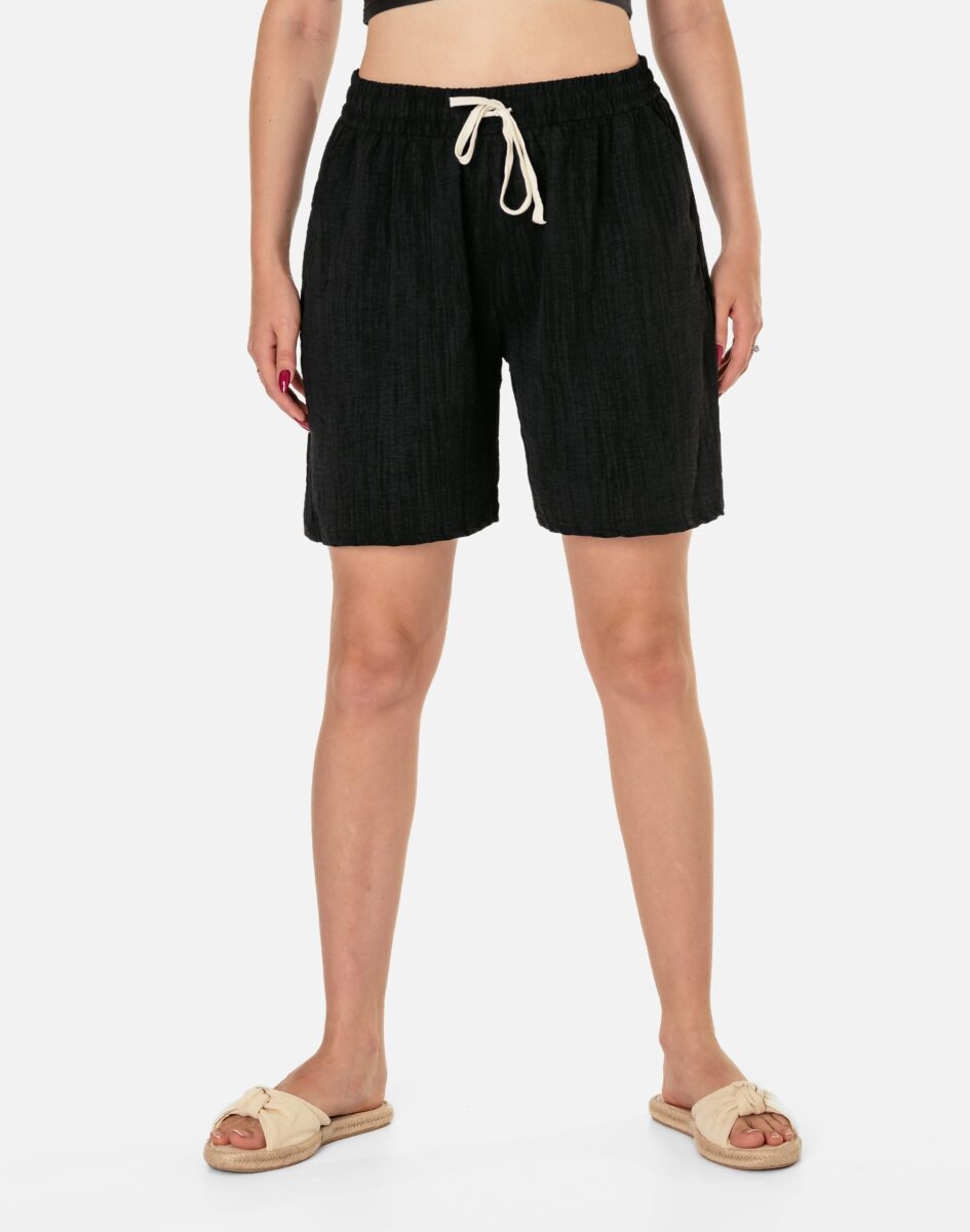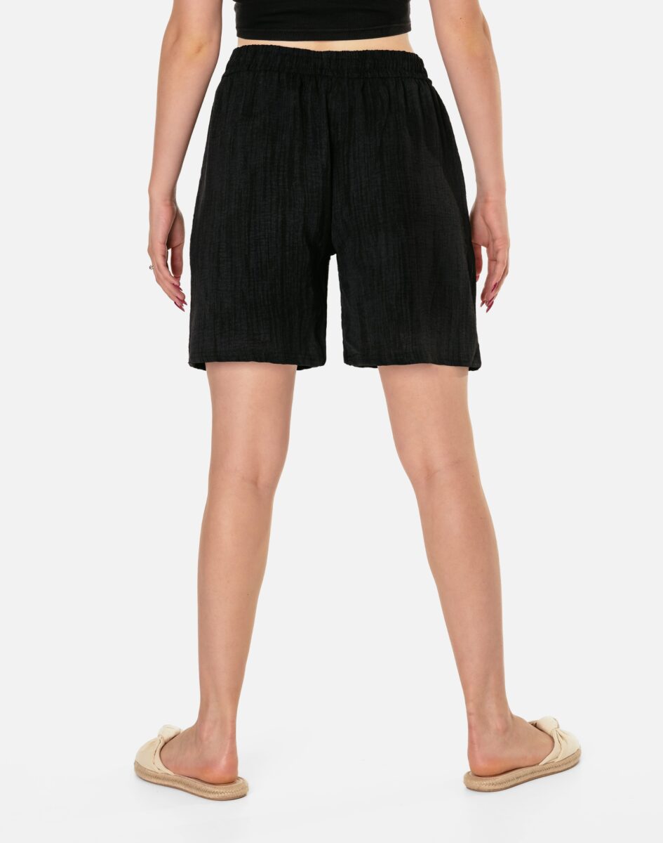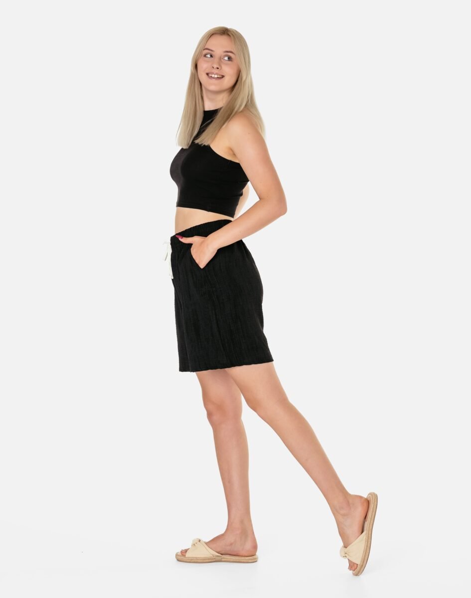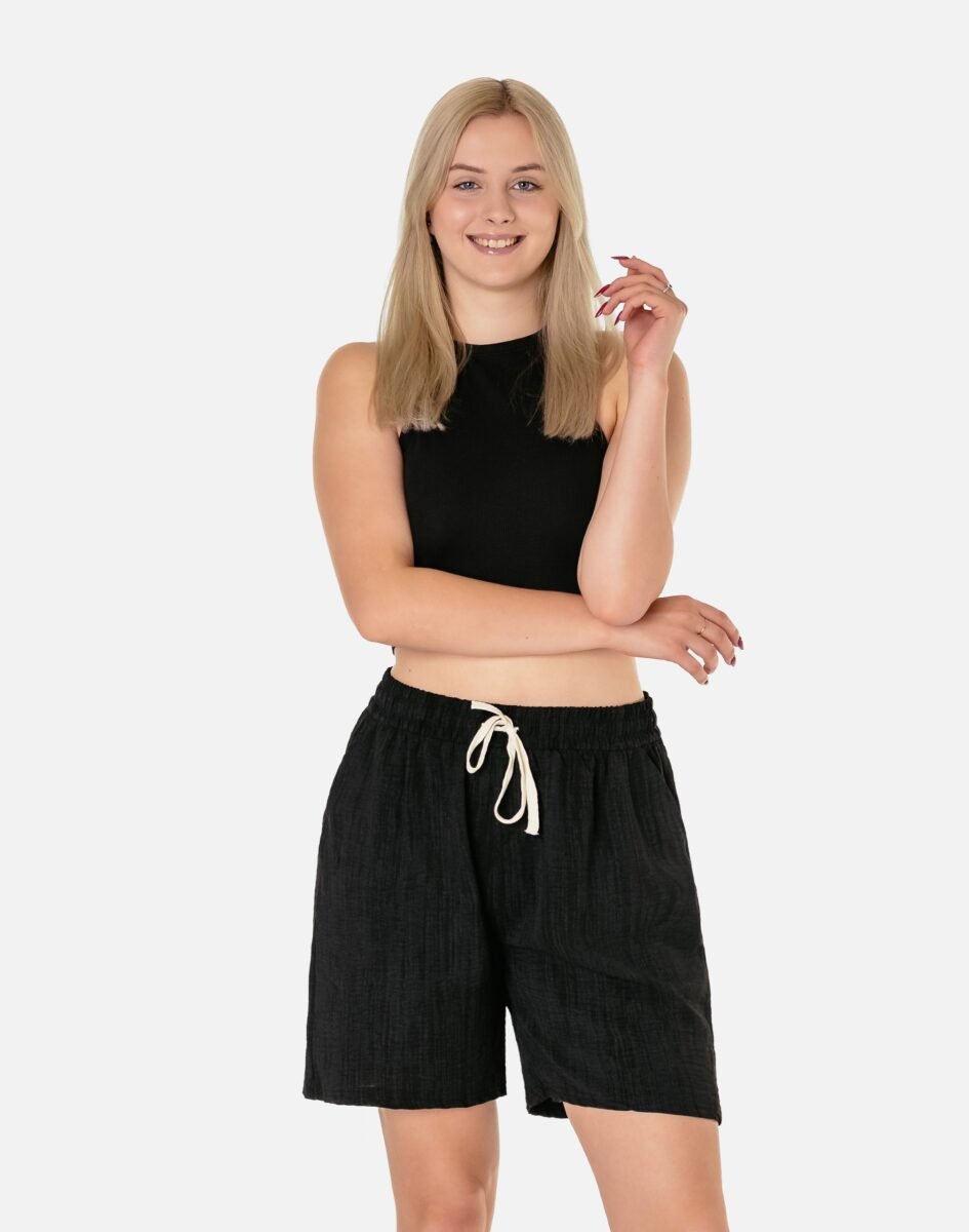 Wyjątkowo lekkie i przewiewne krótkie spodenki damskie bawełniane z wysokim stanem i luźną, szeroką nogawką przed kolano to jeden z najczęściej wybieranych na ciepłe i gorące dni wiosny i lata modeli spodenek. Wykonane z wysokiej jakości cienkiej i oddychającej tkaniny bawełnianej o jednolitym wybarwieniu. Odpowiedni na wysokie temperatury luźny krój spodenek nie ogranicza swobody ruchów, a niewielka gramatura tkaniny (140 g/m2) pozytywnie wpływa na komfort użytkowania. Z założenia wyróżniają się dużą wygodą a dopasowanie w pasie zapewnia szeroki, elastyczny pas ściągający zgrabnie modelujący sylwetkę w talii oraz dodatkowo wpuszczoną w pasek taśma regulacyjna z możliwością jej zawiązywania. Na bokach dwie wpuszczane kieszonki na dłonie. Idealne na co dzień jako element casualowego stroju czyniąc go lekkim i dostosowanym do wysokich temperatur.