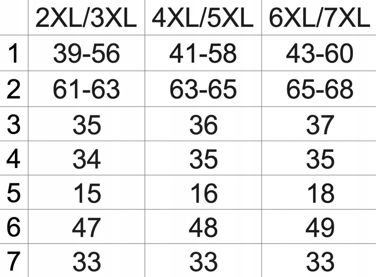 Proszę nie sugerować się rozmiarem podanym na metce przez producenta ( np: XL/3XL, 4XL/5XL czy 6XL/7XL) ponieważ różne firmy stosują bardzo różne oznaczenia rozmiaru na co my jako sprzedawcy na Allegro nie mamy żadnego wpływu. Najlepiej jest zmierzyć się dokładnie centymetrem a następnie porównać swoje wymiary z tabelą wymiarów podaną przez nas na aukcji i wybrać odpowiedni rozmiar.