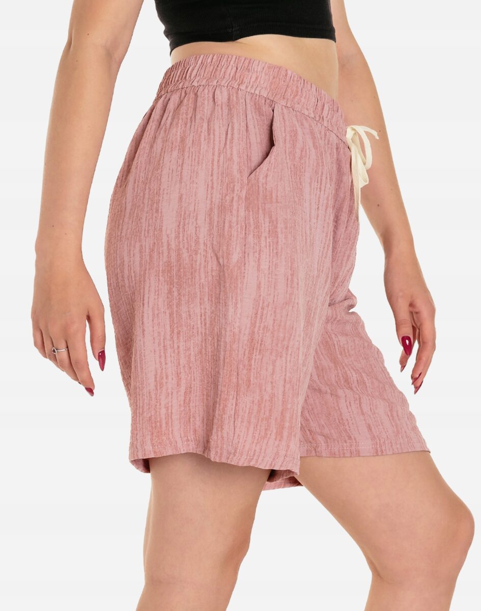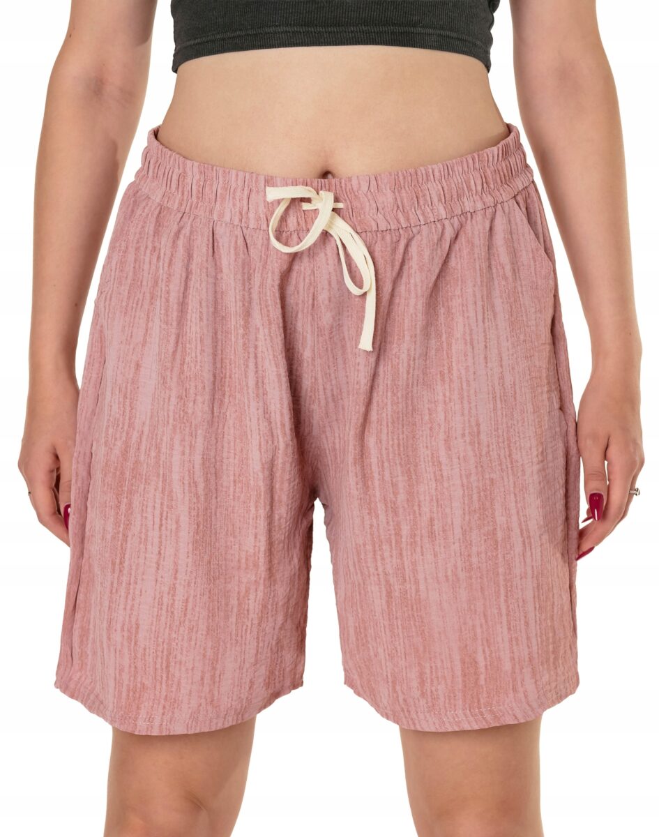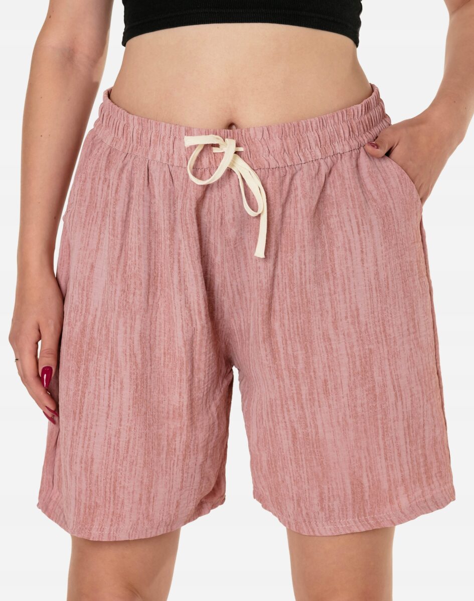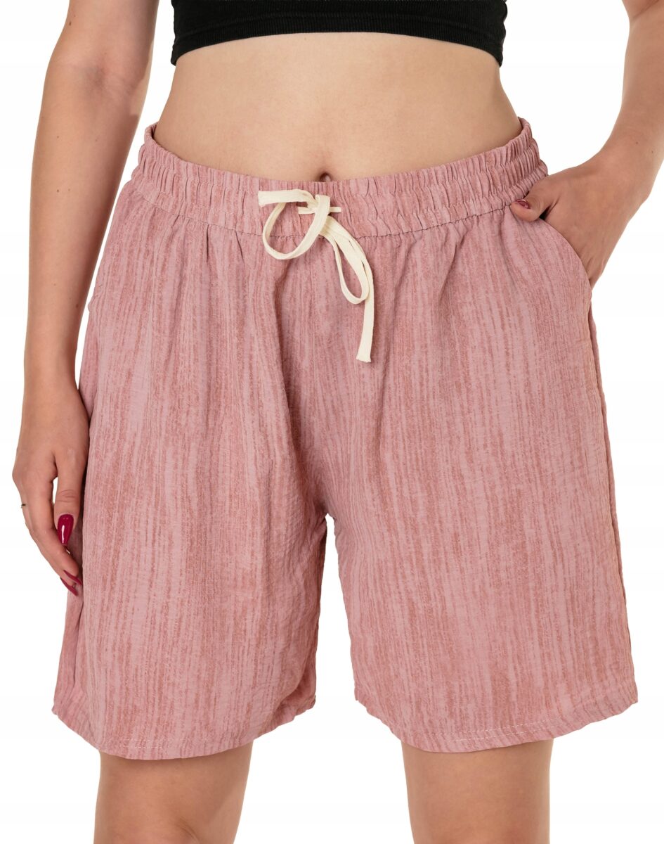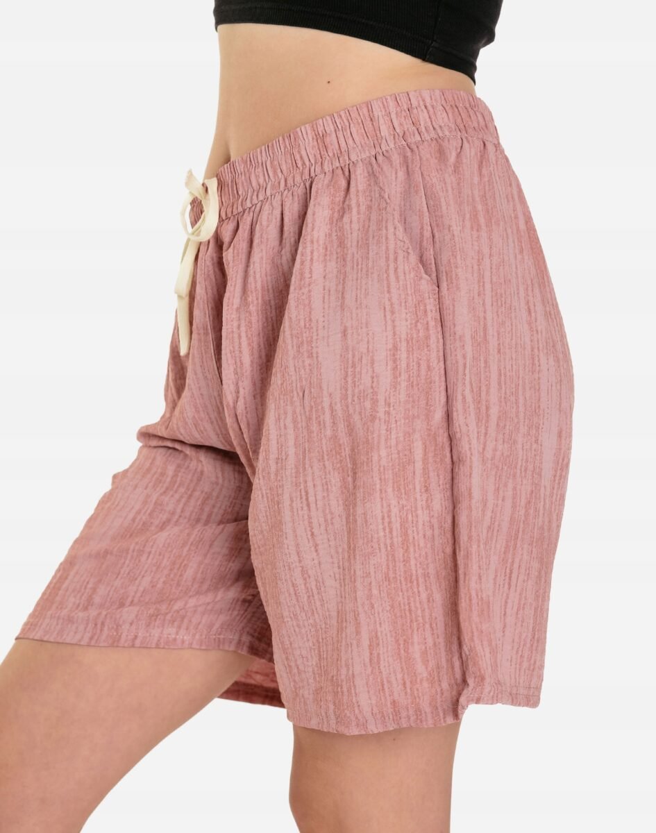 Wyjątkowo lekkie i przewiewne krótkie spodenki damskie bawełniane z wysokim stanem i luźną, szeroką nogawką przed kolano to jeden z najczęściej wybieranych na ciepłe i gorące dni wiosny i lata modeli spodenek. Wykonane z wysokiej jakości cienkiej i oddychającej tkaniny bawełnianej o jednolitym wybarwieniu. Odpowiedni na wysokie temperatury luźny krój spodenek nie ogranicza swobody ruchów, a niewielka gramatura tkaniny (140 g/m2) pozytywnie wpływa na komfort użytkowania. Z założenia wyróżniają się dużą wygodą a dopasowanie w pasie zapewnia szeroki, elastyczny pas ściągający zgrabnie modelujący sylwetkę w talii oraz dodatkowo wpuszczoną w pasek taśma regulacyjna z możliwością jej zawiązywania. Na bokach dwie wpuszczane kieszonki na dłonie. Idealne na co dzień jako element casualowego stroju czyniąc go lekkim i dostosowanym do wysokich temperatur.