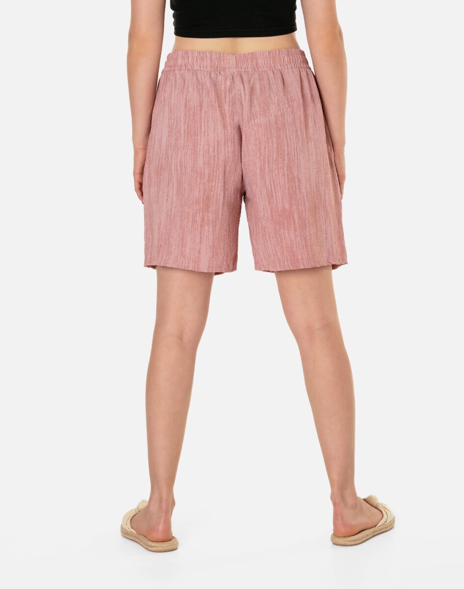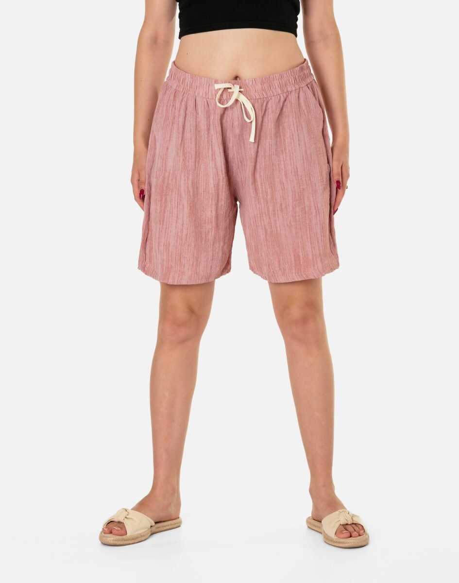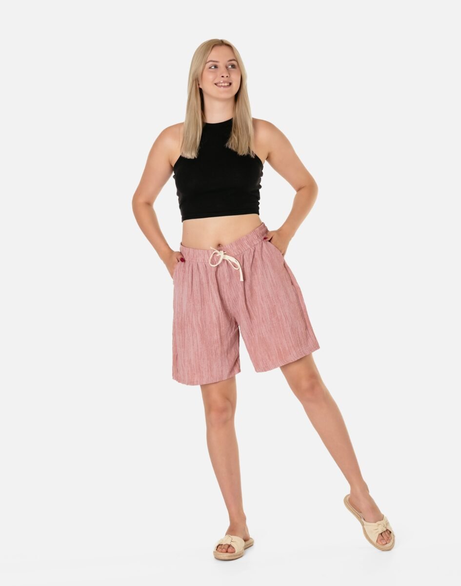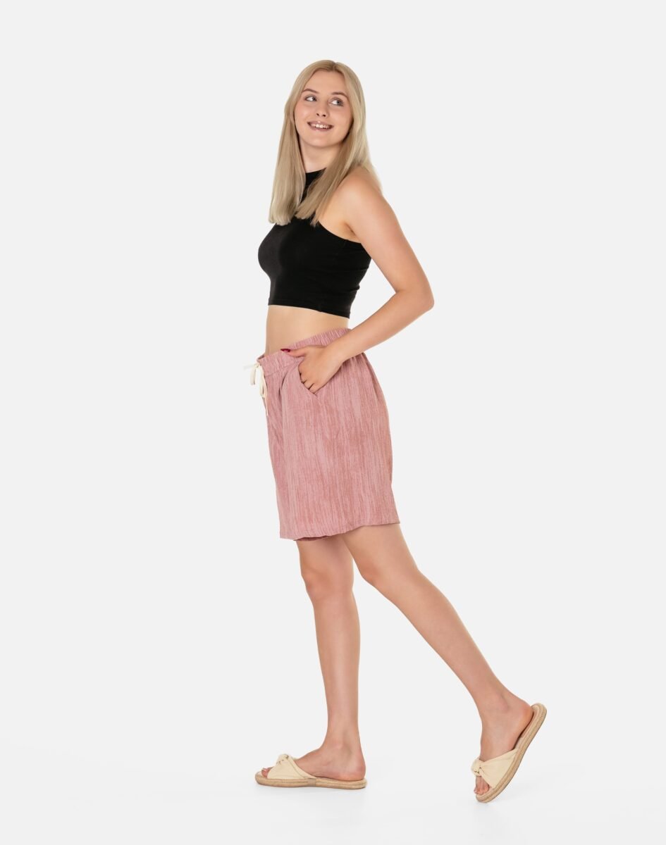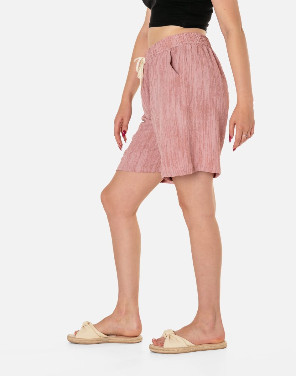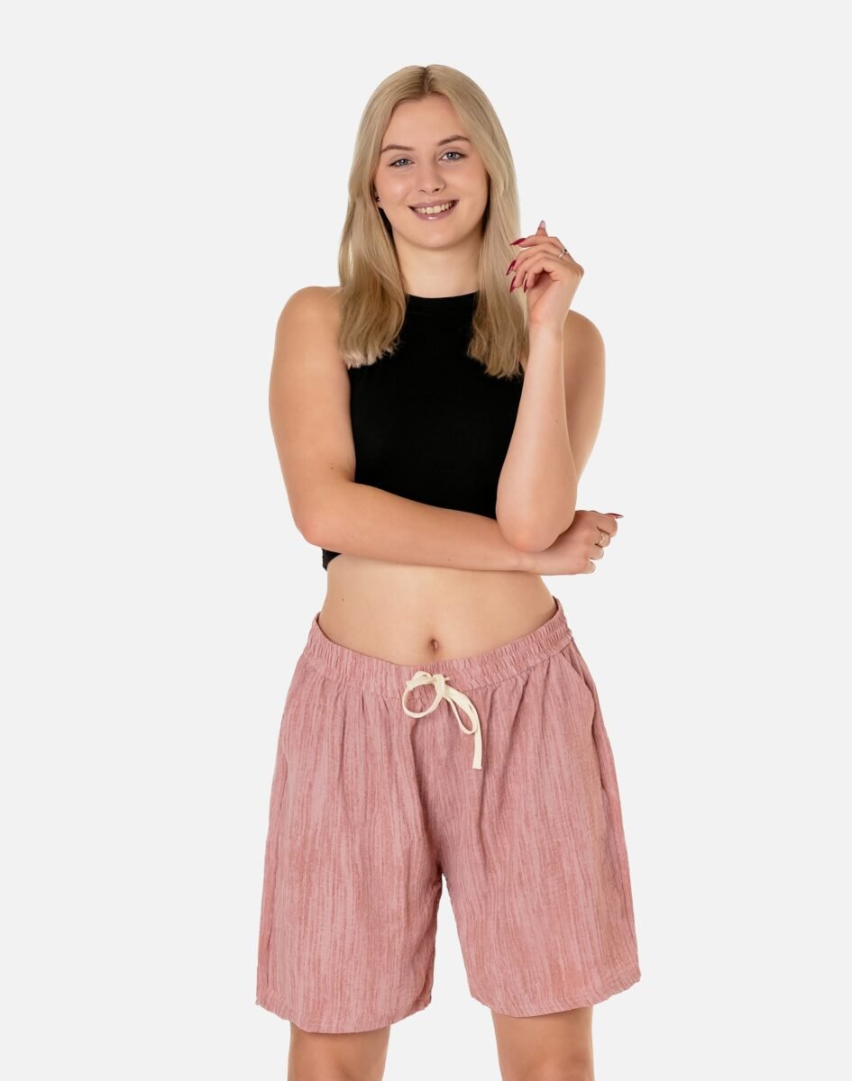 Wyjątkowo lekkie i przewiewne krótkie spodenki damskie bawełniane z wysokim stanem i luźną, szeroką nogawką przed kolano to jeden z najczęściej wybieranych na ciepłe i gorące dni wiosny i lata modeli spodenek. Wykonane z wysokiej jakości cienkiej i oddychającej tkaniny bawełnianej o jednolitym wybarwieniu. Odpowiedni na wysokie temperatury luźny krój spodenek nie ogranicza swobody ruchów, a niewielka gramatura tkaniny (140 g/m2) pozytywnie wpływa na komfort użytkowania. Z założenia wyróżniają się dużą wygodą a dopasowanie w pasie zapewnia szeroki, elastyczny pas ściągający zgrabnie modelujący sylwetkę w talii oraz dodatkowo wpuszczoną w pasek taśma regulacyjna z możliwością jej zawiązywania. Na bokach dwie wpuszczane kieszonki na dłonie. Idealne na co dzień jako element casualowego stroju czyniąc go lekkim i dostosowanym do wysokich temperatur.