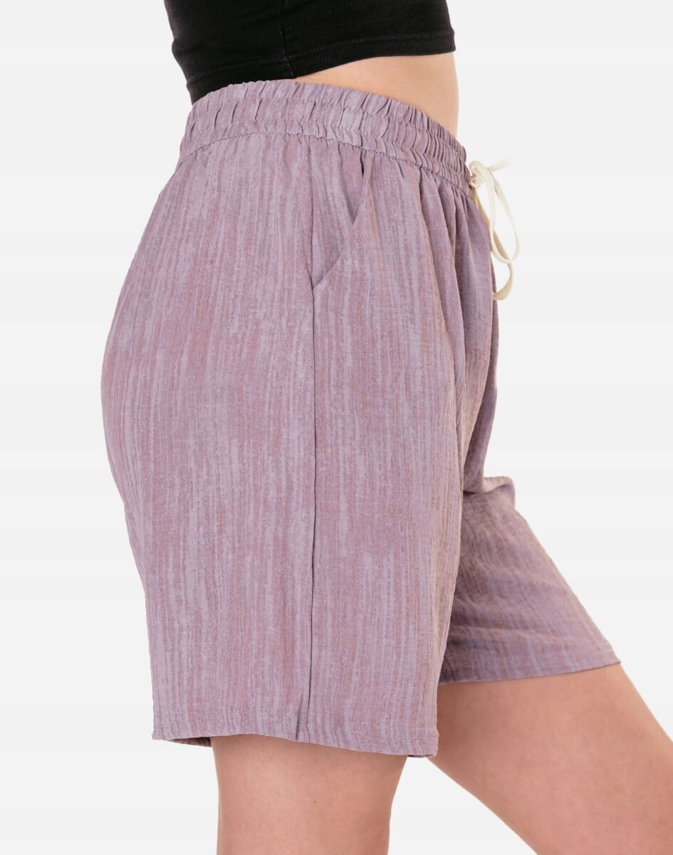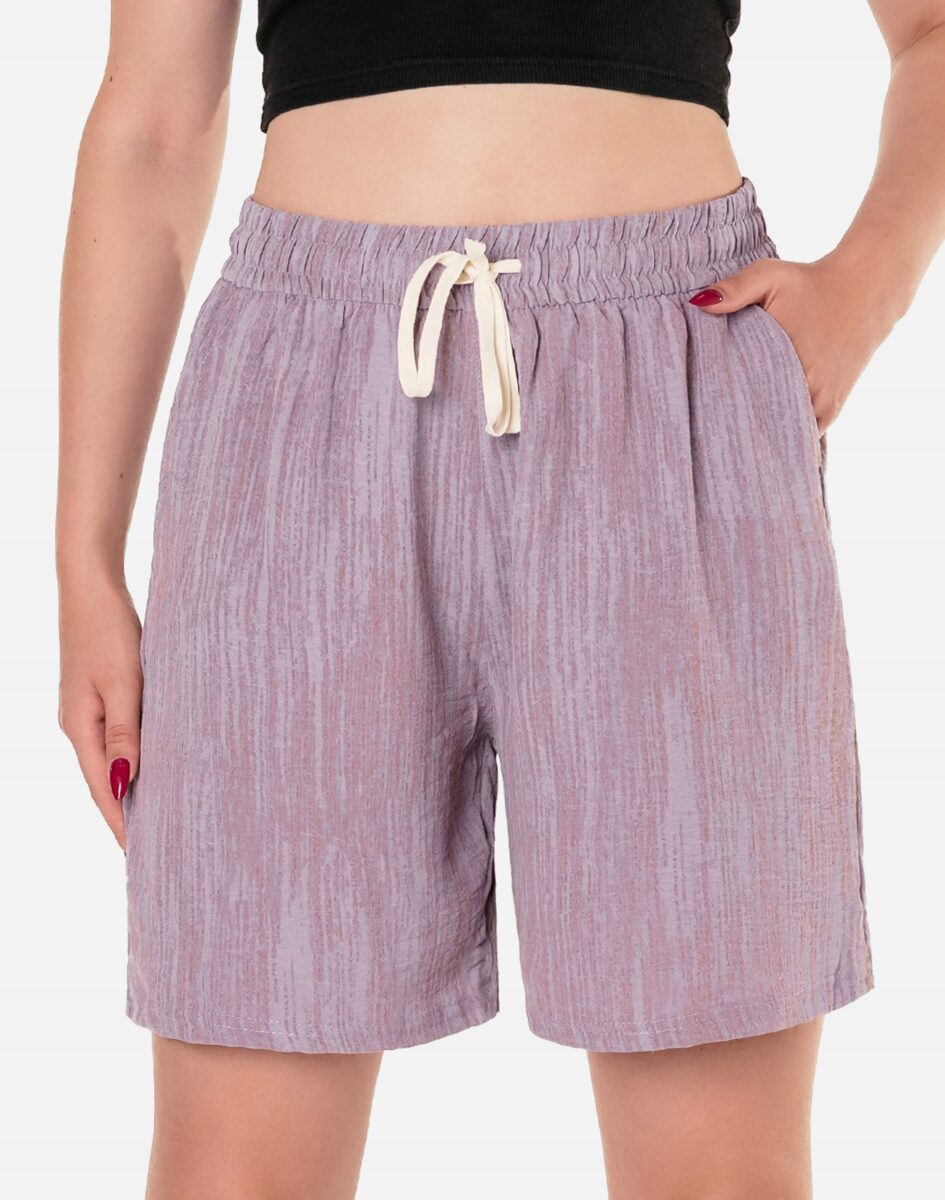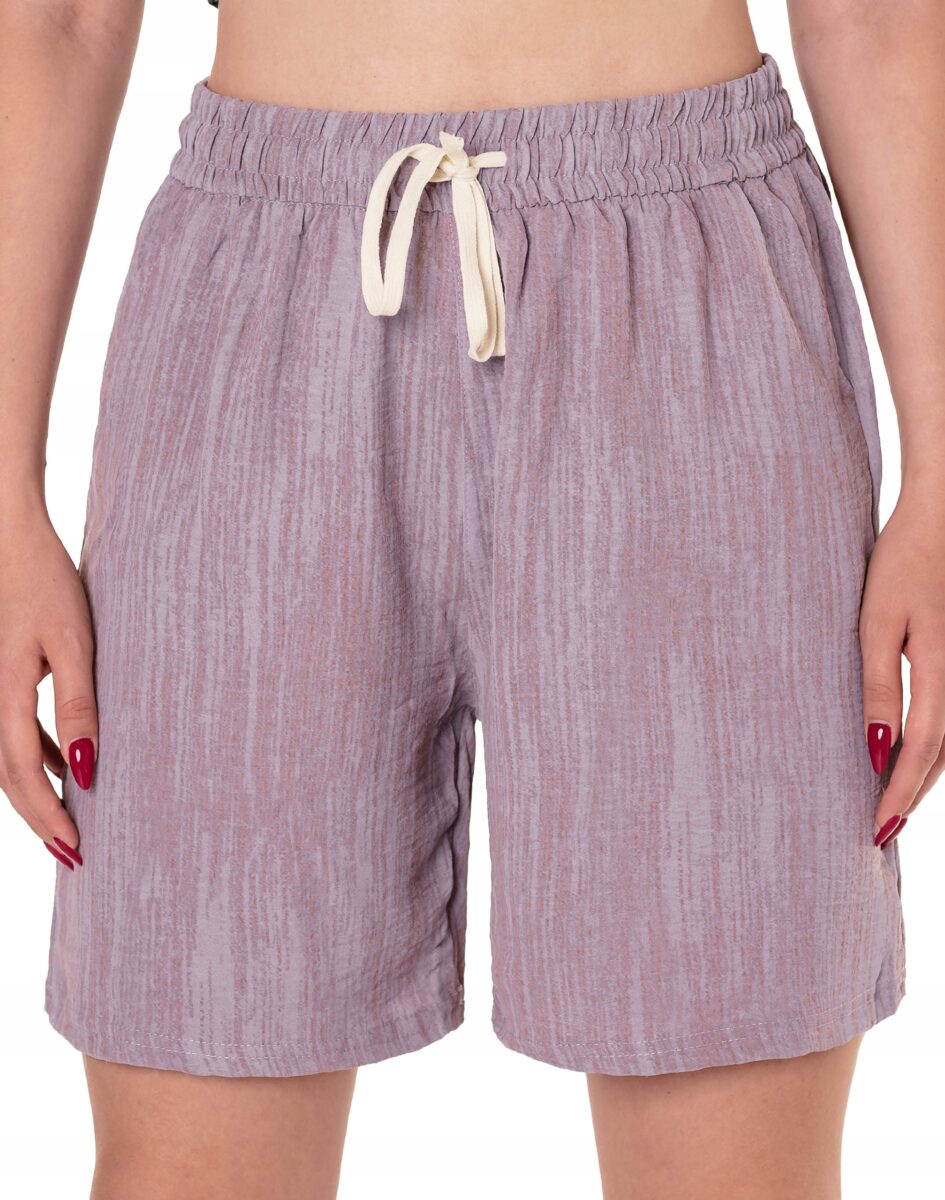 Wyjątkowo lekkie i przewiewne krótkie spodenki damskie bawełniane z wysokim stanem i luźną, szeroką nogawką przed kolano to jeden z najczęściej wybieranych na ciepłe i gorące dni wiosny i lata modeli spodenek. Wykonane z wysokiej jakości cienkiej i oddychającej tkaniny bawełnianej o jednolitym wybarwieniu. Odpowiedni na wysokie temperatury luźny krój spodenek nie ogranicza swobody ruchów, a niewielka gramatura tkaniny (140 g/m2) pozytywnie wpływa na komfort użytkowania. Z założenia wyróżniają się dużą wygodą a dopasowanie w pasie zapewnia szeroki, elastyczny pas ściągający zgrabnie modelujący sylwetkę w talii oraz dodatkowo wpuszczoną w pasek taśma regulacyjna z możliwością jej zawiązywania. Na bokach dwie wpuszczane kieszonki na dłonie. Idealne na co dzień jako element casualowego stroju czyniąc go lekkim i dostosowanym do wysokich temperatur.