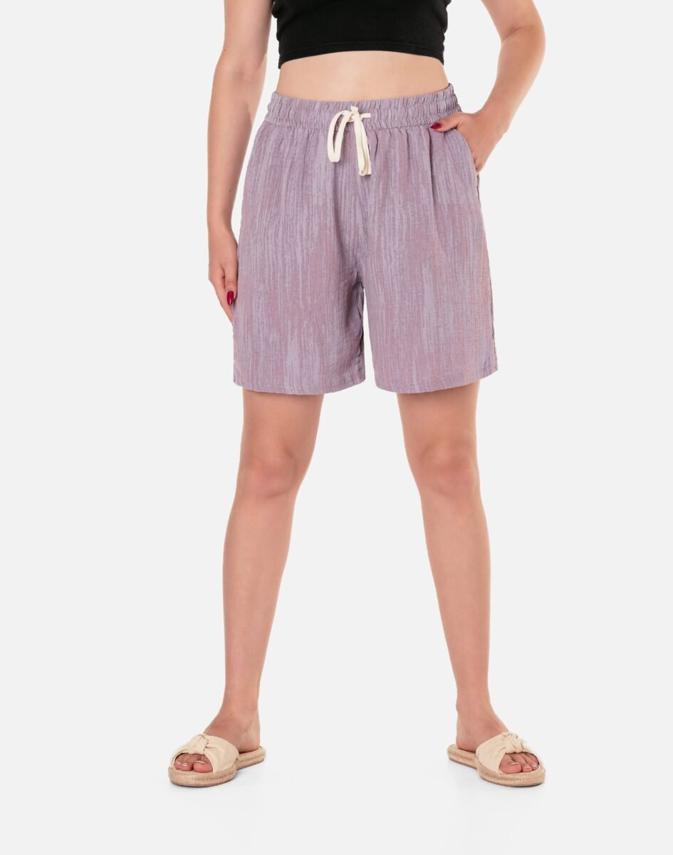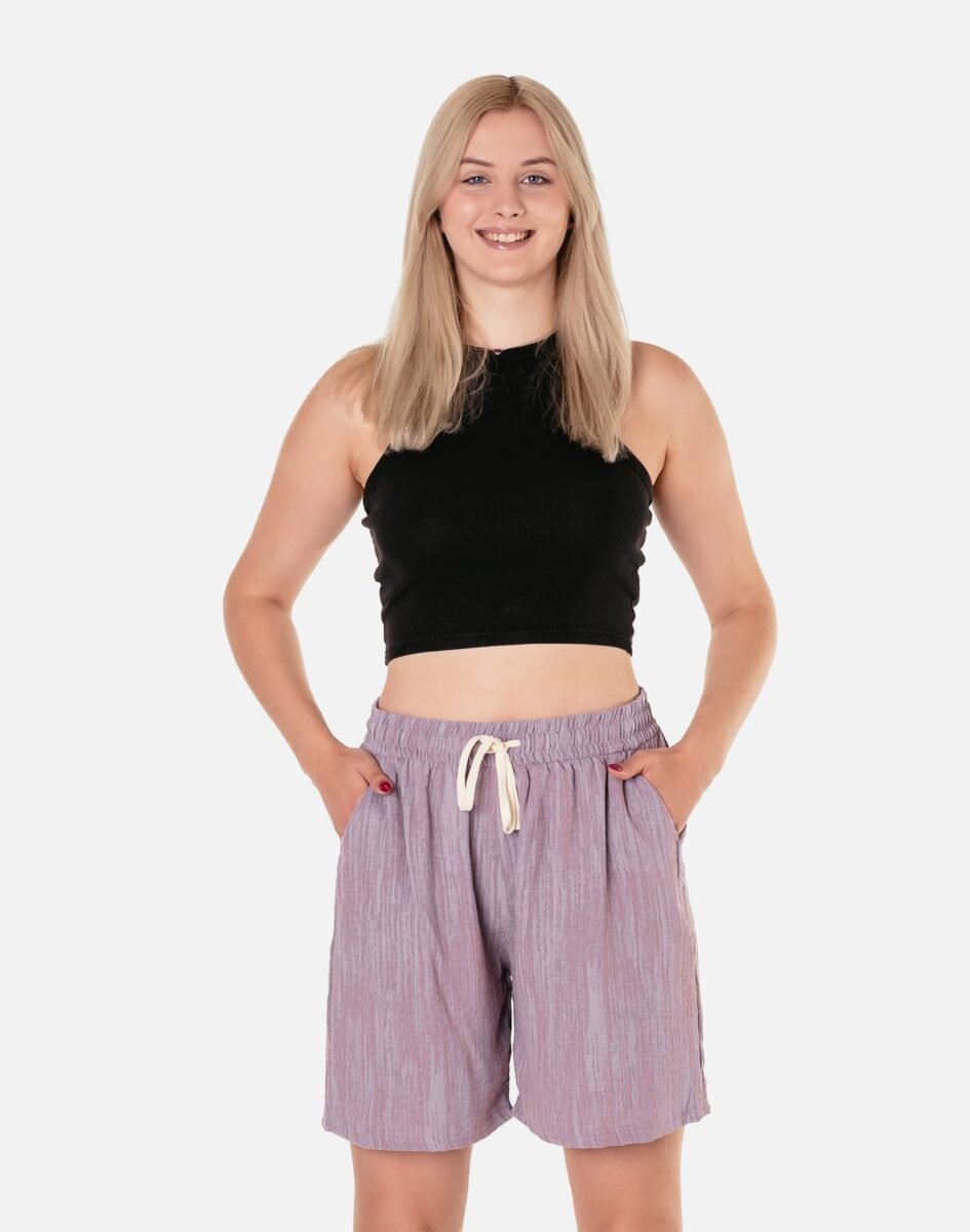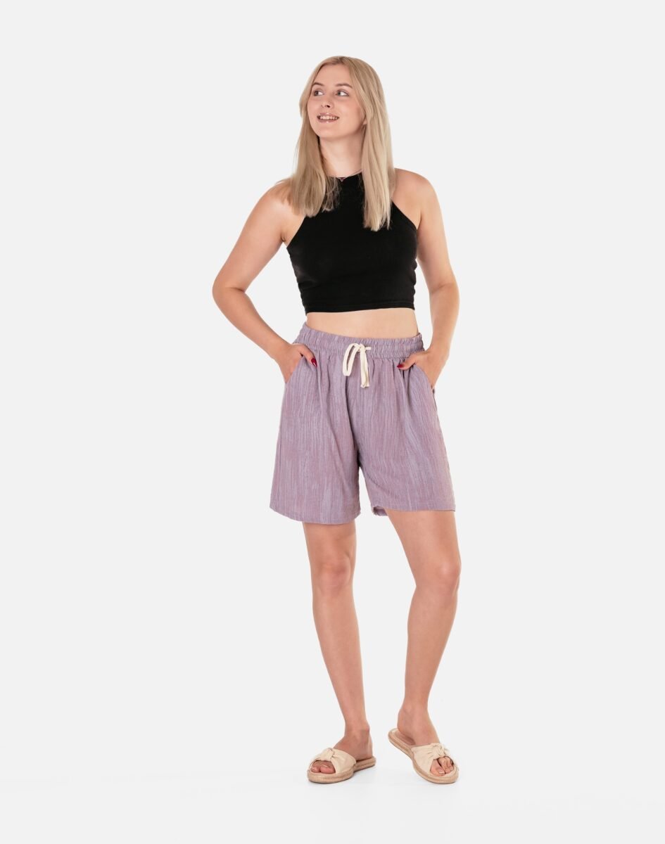 Wyjątkowo lekkie i przewiewne krótkie spodenki damskie bawełniane z wysokim stanem i luźną, szeroką nogawką przed kolano to jeden z najczęściej wybieranych na ciepłe i gorące dni wiosny i lata modeli spodenek. Wykonane z wysokiej jakości cienkiej i oddychającej tkaniny bawełnianej o jednolitym wybarwieniu. Odpowiedni na wysokie temperatury luźny krój spodenek nie ogranicza swobody ruchów, a niewielka gramatura tkaniny (140 g/m2) pozytywnie wpływa na komfort użytkowania. Z założenia wyróżniają się dużą wygodą a dopasowanie w pasie zapewnia szeroki, elastyczny pas ściągający zgrabnie modelujący sylwetkę w talii oraz dodatkowo wpuszczoną w pasek taśma regulacyjna z możliwością jej zawiązywania. Na bokach dwie wpuszczane kieszonki na dłonie. Idealne na co dzień jako element casualowego stroju czyniąc go lekkim i dostosowanym do wysokich temperatur.