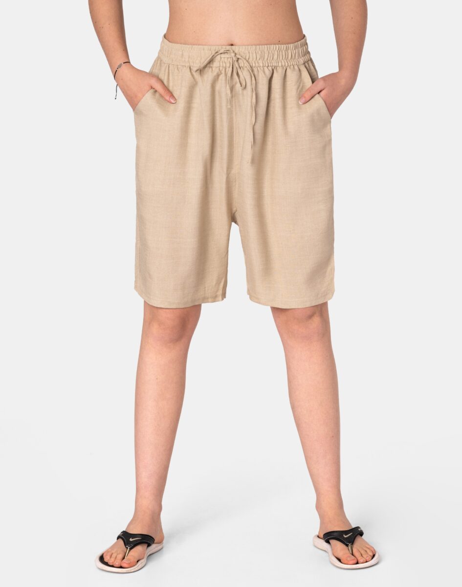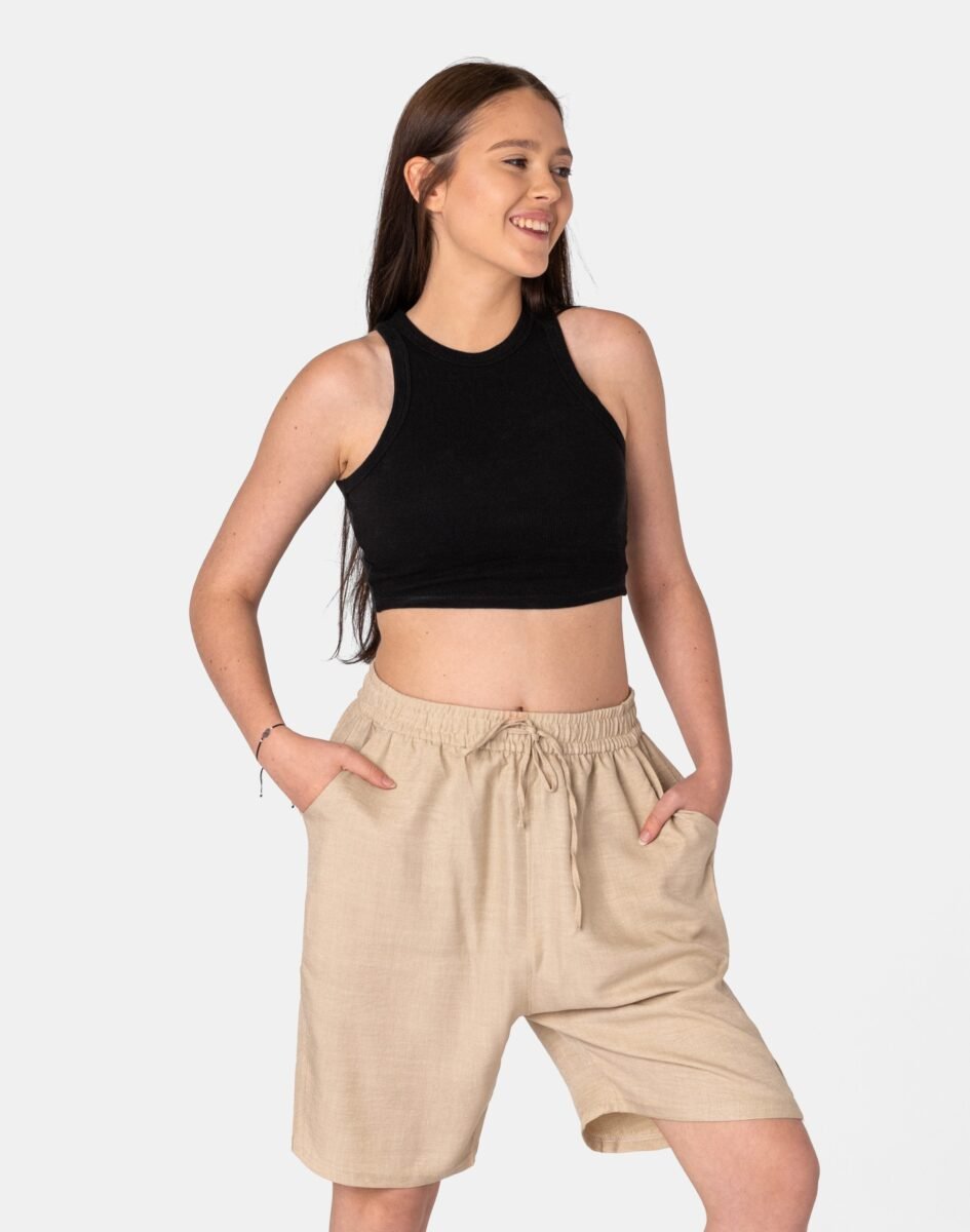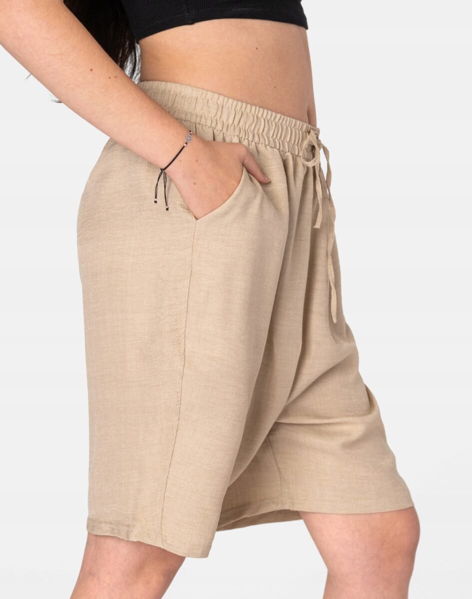 Wyjątkowo lekkie i przewiewne krótkie spodenki damskie bawełniane z wysokim stanem i luźną, szeroką nogawką w kolano to jeden z najczęściej wybieranych na ciepłe i gorące dni wiosny i lata modeli spodni. Wykonane z wysokiej jakości cienkiej i oddychającej tkaniny bawełnianej o jednolitym wybarwieniu. Odpowiedni na wysokie temperatury luźny krój spodenek nie ogranicza swobody ruchów, a niewielka gramatura tkaniny (140 g/m2) pozytywnie wpływa na komfort użytkowania. Z założenia wyróżniają się dużą wygodą a dopasowanie w pasie zapewnia szeroki, elastyczny pas ściągający zgrabnie modelujący sylwetkę w talii oraz dodatkowo wpuszczoną w pasek taśma regulacyjna z możliwością jej zawiązywania. Na bokach dwie wpuszczane kieszonki na dłonie. Idealne na co dzień jako element casualowego stroju czyniąc go lekkim i dostosowanym do wysokich temperatur.