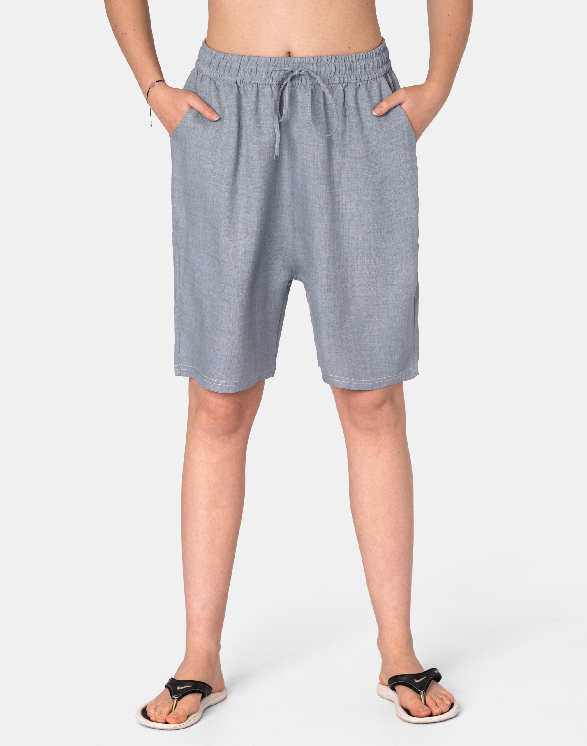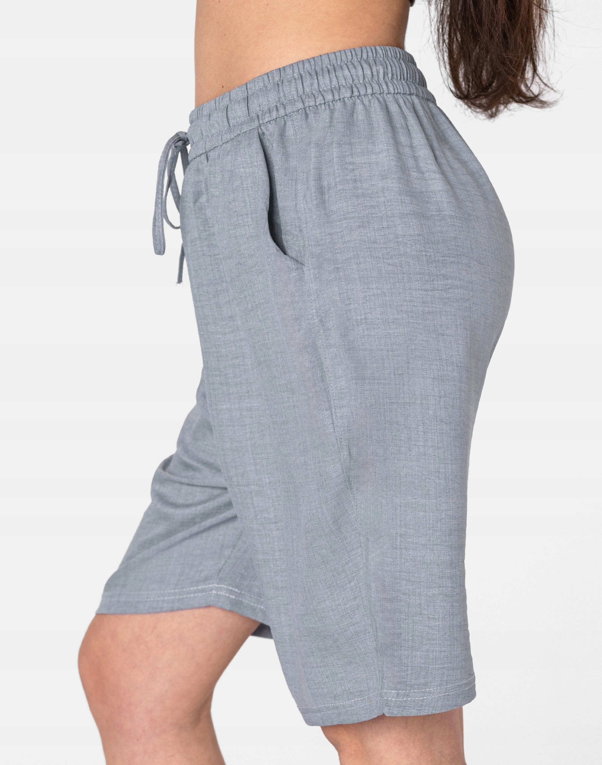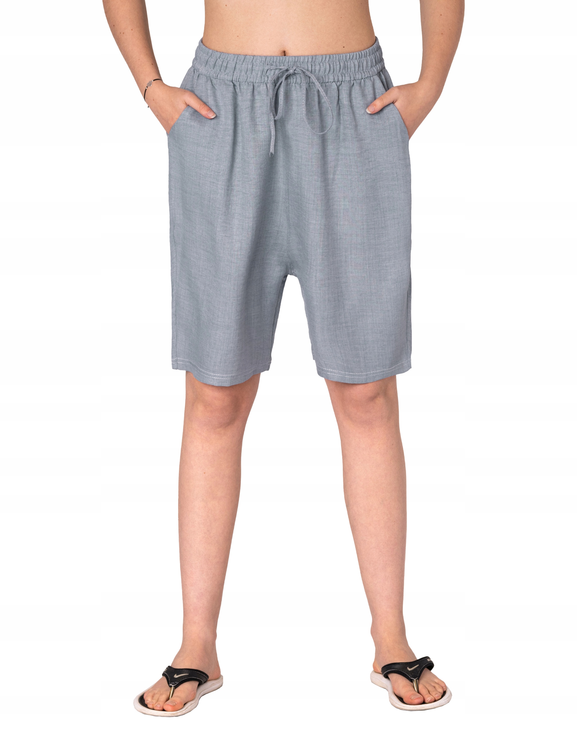 Wyjątkowo lekkie i przewiewne krótkie spodenki damskie bawełniane z wysokim stanem i luźną, szeroką nogawką w kolano to jeden z najczęściej wybieranych na ciepłe i gorące dni wiosny i lata modeli spodni. Wykonane z wysokiej jakości cienkiej i oddychającej tkaniny bawełnianej o jednolitym wybarwieniu. Odpowiedni na wysokie temperatury luźny krój spodenek nie ogranicza swobody ruchów, a niewielka gramatura tkaniny (140 g/m2) pozytywnie wpływa na komfort użytkowania. Z założenia wyróżniają się dużą wygodą a dopasowanie w pasie zapewnia szeroki, elastyczny pas ściągający zgrabnie modelujący sylwetkę w talii oraz dodatkowo wpuszczoną w pasek taśma regulacyjna z możliwością jej zawiązywania. Na bokach dwie wpuszczane kieszonki na dłonie. Idealne na co dzień jako element casualowego stroju czyniąc go lekkim i dostosowanym do wysokich temperatur.