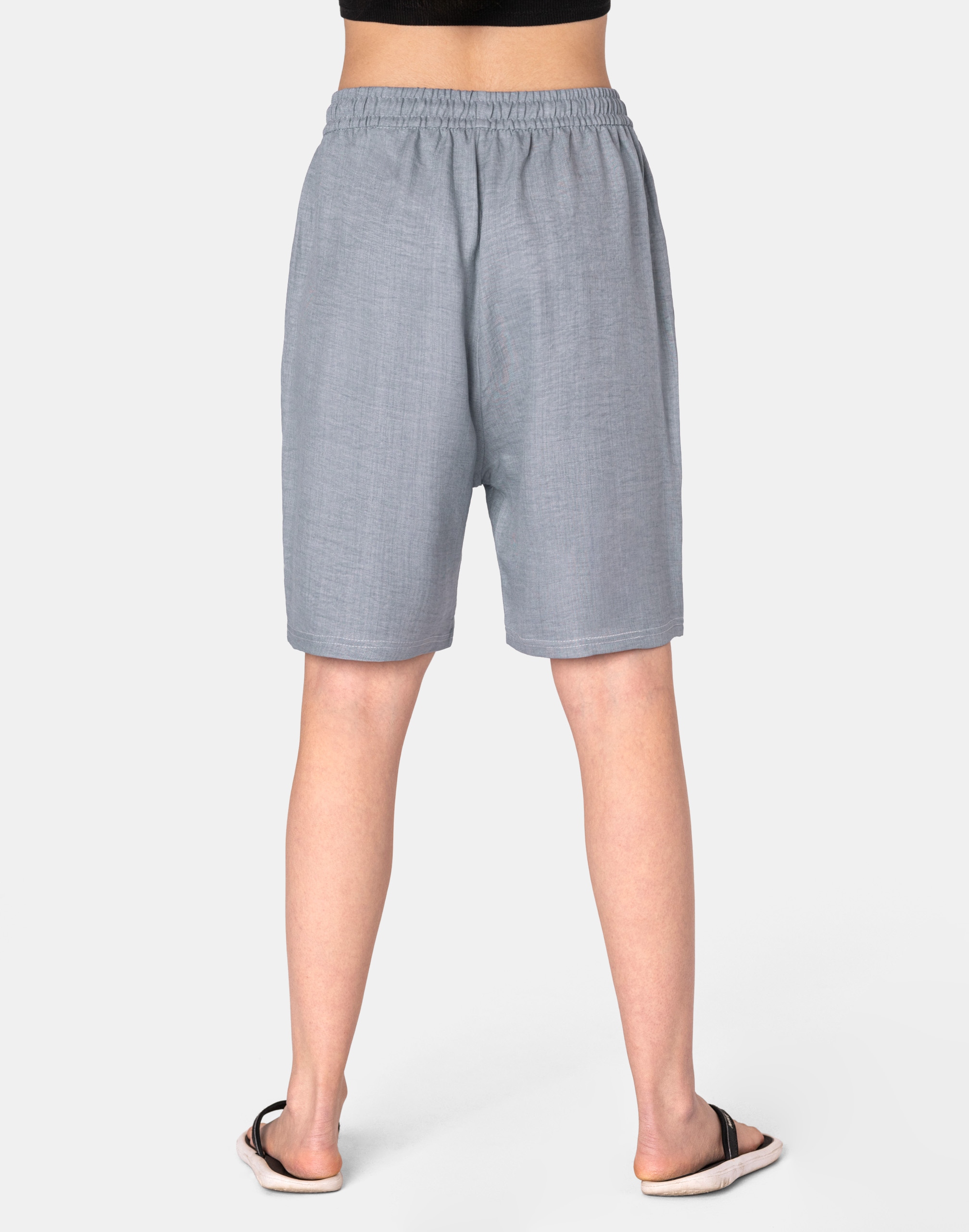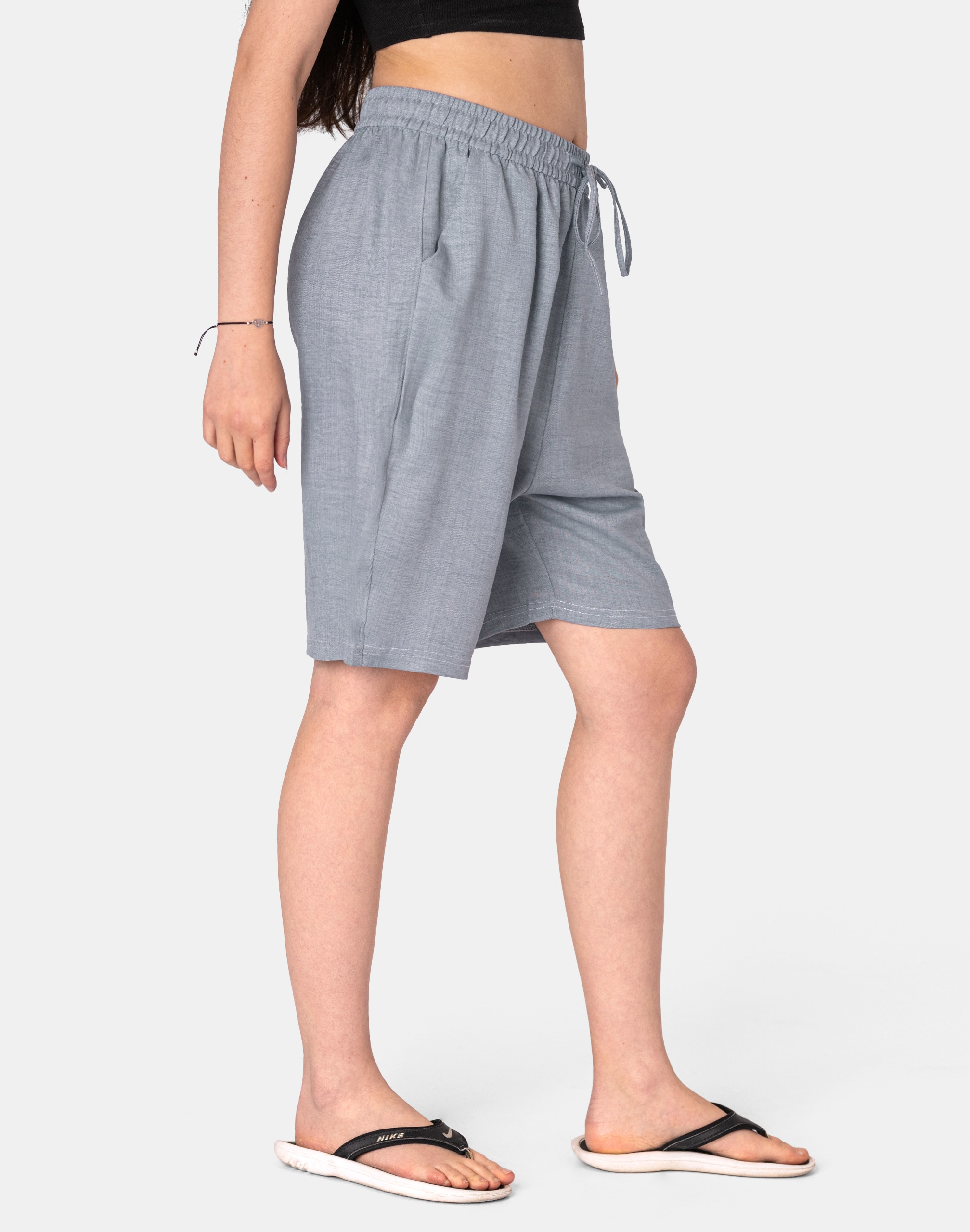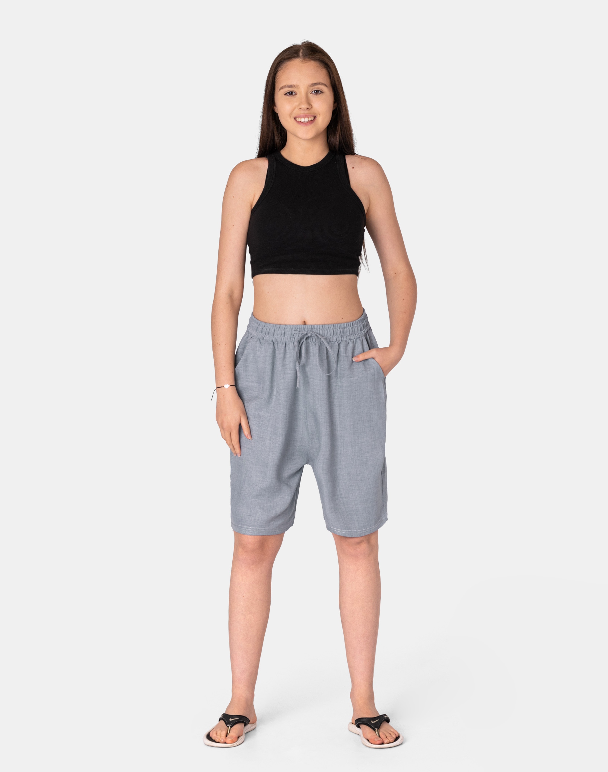 Wyjątkowo lekkie i przewiewne krótkie spodenki damskie bawełniane z wysokim stanem i luźną, szeroką nogawką w kolano to jeden z najczęściej wybieranych na ciepłe i gorące dni wiosny i lata modeli spodni. Wykonane z wysokiej jakości cienkiej i oddychającej tkaniny bawełnianej o jednolitym wybarwieniu. Odpowiedni na wysokie temperatury luźny krój spodenek nie ogranicza swobody ruchów, a niewielka gramatura tkaniny (140 g/m2) pozytywnie wpływa na komfort użytkowania. Z założenia wyróżniają się dużą wygodą a dopasowanie w pasie zapewnia szeroki, elastyczny pas ściągający zgrabnie modelujący sylwetkę w talii oraz dodatkowo wpuszczoną w pasek taśma regulacyjna z możliwością jej zawiązywania. Na bokach dwie wpuszczane kieszonki na dłonie. Idealne na co dzień jako element casualowego stroju czyniąc go lekkim i dostosowanym do wysokich temperatur.