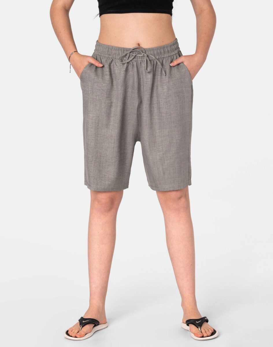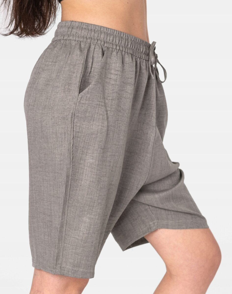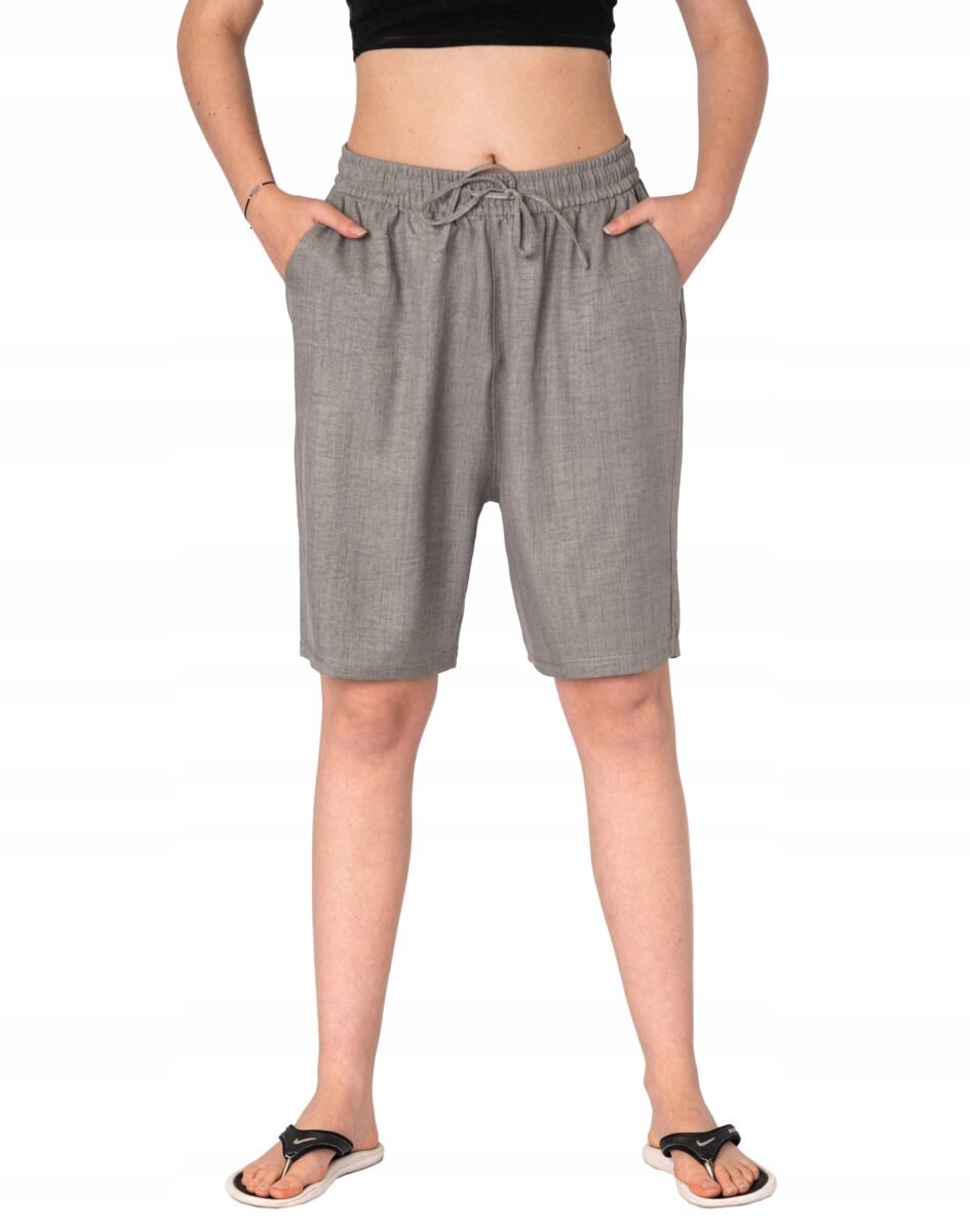 Wyjątkowo lekkie i przewiewne krótkie spodenki damskie bawełniane z wysokim stanem i luźną, szeroką nogawką w kolano to jeden z najczęściej wybieranych na ciepłe i gorące dni wiosny i lata modeli spodni. Wykonane z wysokiej jakości cienkiej i oddychającej tkaniny bawełnianej o jednolitym wybarwieniu. Odpowiedni na wysokie temperatury luźny krój spodenek nie ogranicza swobody ruchów, a niewielka gramatura tkaniny (140 g/m2) pozytywnie wpływa na komfort użytkowania. Z założenia wyróżniają się dużą wygodą a dopasowanie w pasie zapewnia szeroki, elastyczny pas ściągający zgrabnie modelujący sylwetkę w talii oraz dodatkowo wpuszczoną w pasek taśma regulacyjna z możliwością jej zawiązywania. Na bokach dwie wpuszczane kieszonki na dłonie. Idealne na co dzień jako element casualowego stroju czyniąc go lekkim i dostosowanym do wysokich temperatur.
