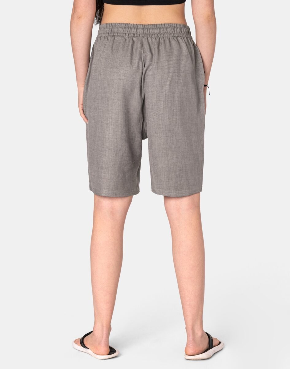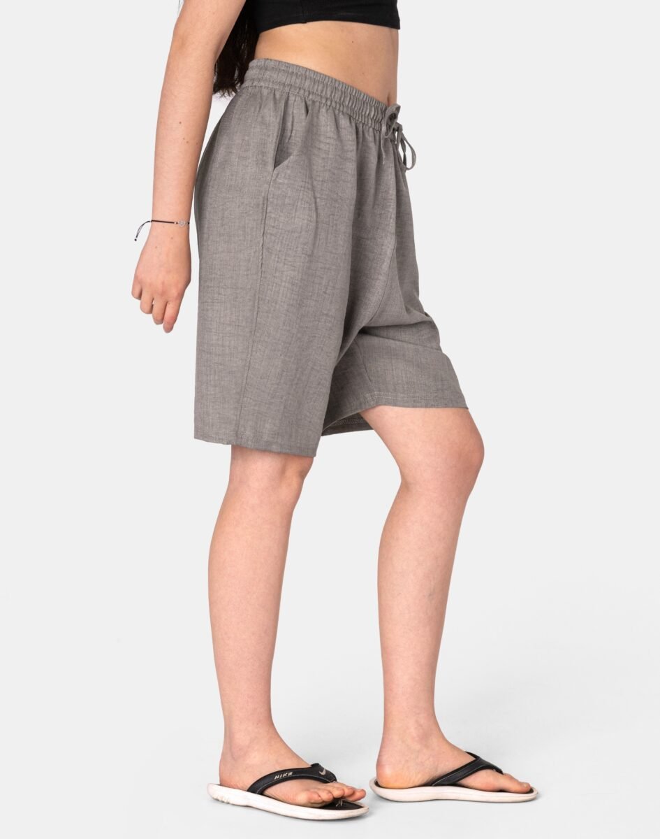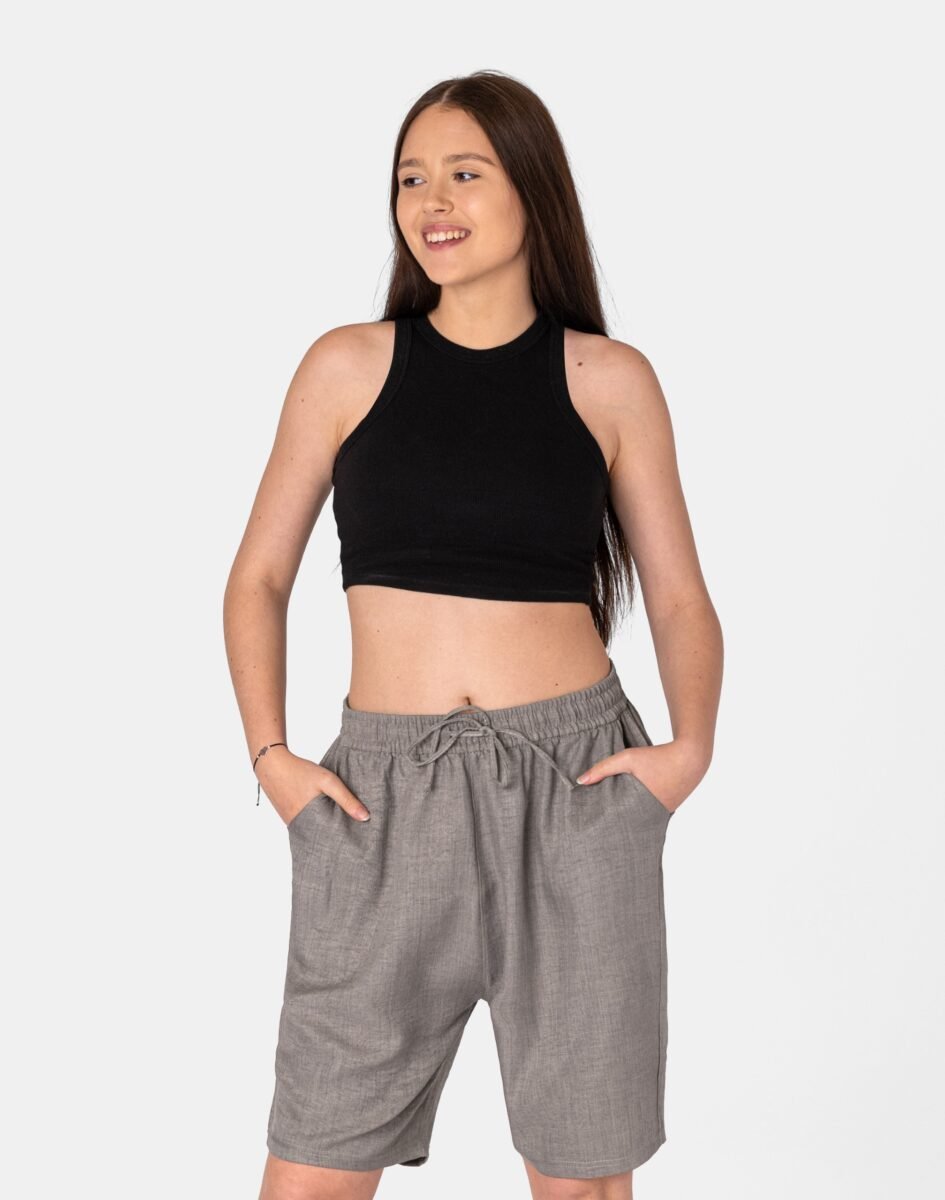 Wyjątkowo lekkie i przewiewne krótkie spodenki damskie bawełniane z wysokim stanem i luźną, szeroką nogawką w kolano to jeden z najczęściej wybieranych na ciepłe i gorące dni wiosny i lata modeli spodni. Wykonane z wysokiej jakości cienkiej i oddychającej tkaniny bawełnianej o jednolitym wybarwieniu. Odpowiedni na wysokie temperatury luźny krój spodenek nie ogranicza swobody ruchów, a niewielka gramatura tkaniny (140 g/m2) pozytywnie wpływa na komfort użytkowania. Z założenia wyróżniają się dużą wygodą a dopasowanie w pasie zapewnia szeroki, elastyczny pas ściągający zgrabnie modelujący sylwetkę w talii oraz dodatkowo wpuszczoną w pasek taśma regulacyjna z możliwością jej zawiązywania. Na bokach dwie wpuszczane kieszonki na dłonie. Idealne na co dzień jako element casualowego stroju czyniąc go lekkim i dostosowanym do wysokich temperatur.