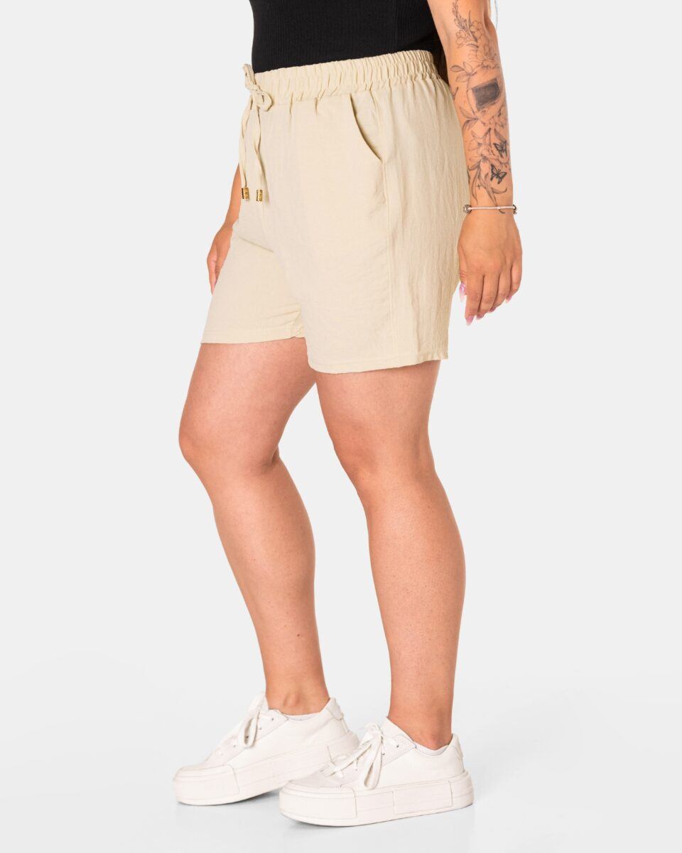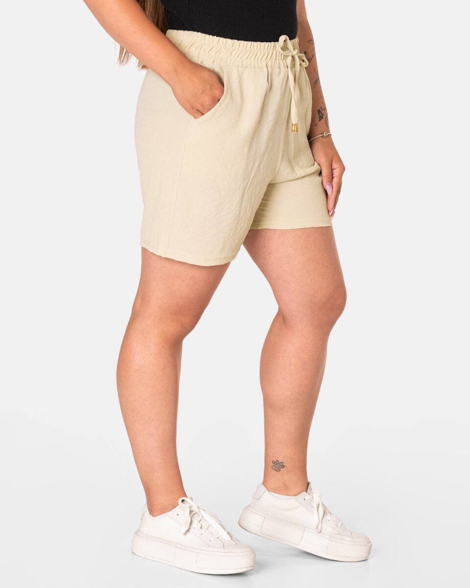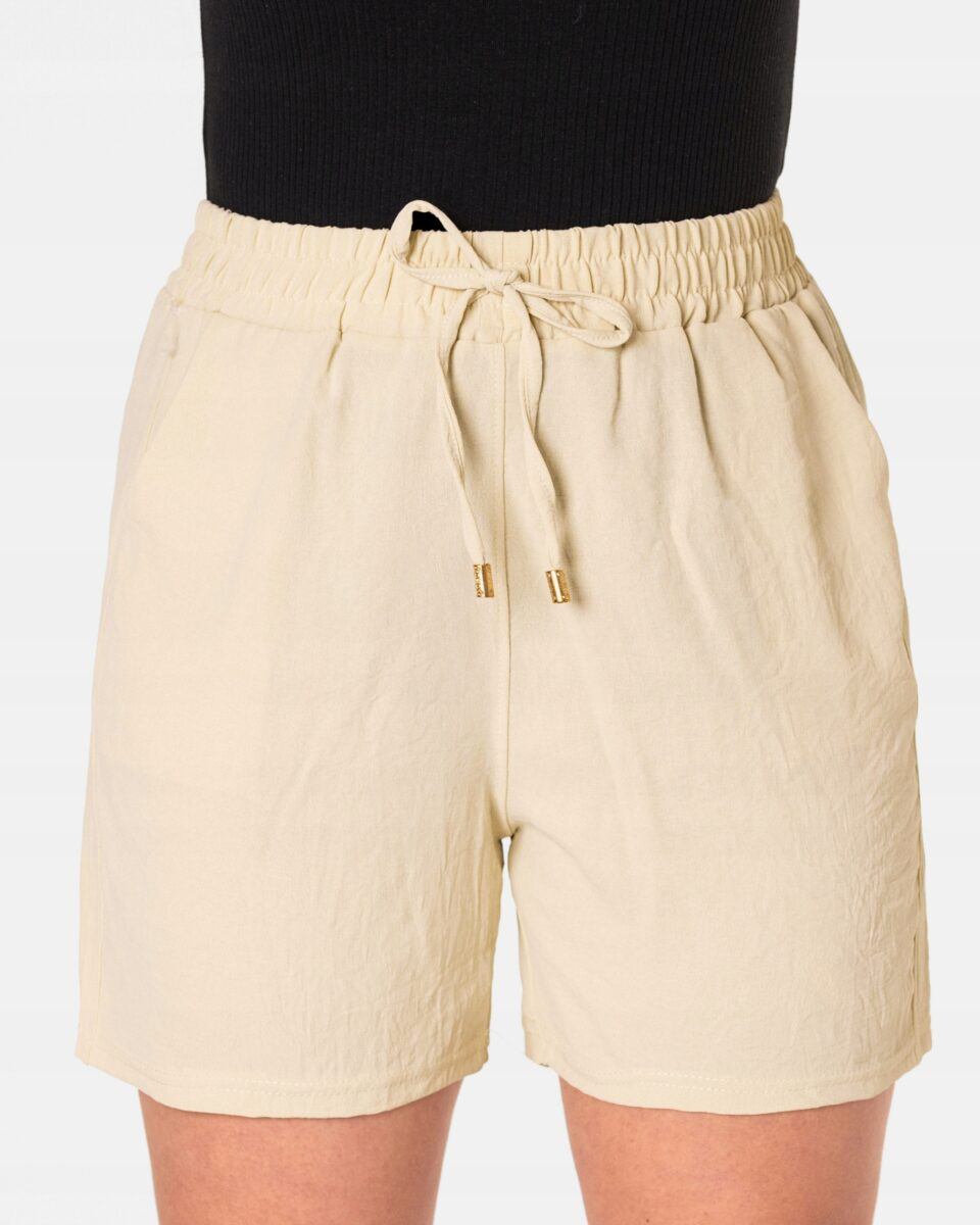 Wyjątkowo lekkie i przewiewne krótkie damskie spodenki z wysokim stanem i krótką, szeroką nogawką, to jeden z najczęściej wybieranych na ciepłe i gorące dni wiosny i lata modeli spodenek. Wykonane z wysokiej jakości cienkiej i oddychającej, zwiewnej tkaniny o jednolitym wybarwieniu. Odpowiedni na wysokie temperatury luźny krój spodenek nie ogranicza swobody ruchów, a niewielka gramatura tkaniny (140 g/m2) pozytywnie wpływa na komfort użytkowania. Z założenia wyróżniają się dużą wygodą a dopasowanie w pasie zapewnia szeroki, elastyczny pas ściągający zgrabnie modelujący sylwetkę w talii i ozdobiony taśmą do zawiązania. Na bokach spodenek dwie wpuszczane kieszonki na dłonie.