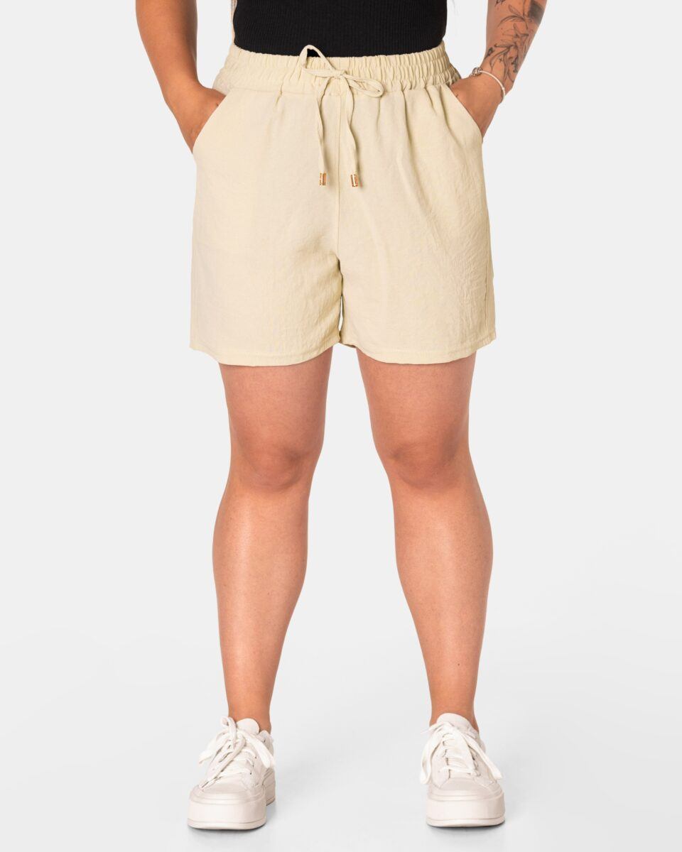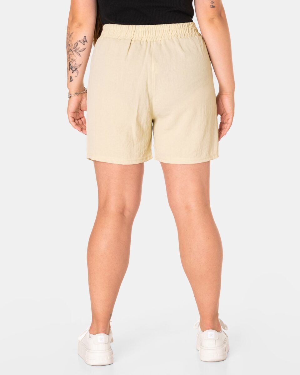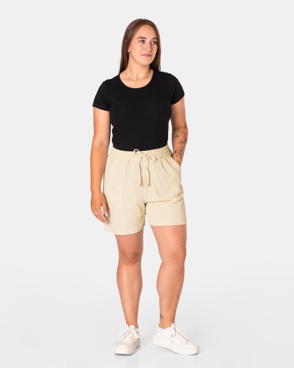 Wyjątkowo lekkie i przewiewne krótkie damskie spodenki z wysokim stanem i krótką, szeroką nogawką, to jeden z najczęściej wybieranych na ciepłe i gorące dni wiosny i lata modeli spodenek. Wykonane z wysokiej jakości cienkiej i oddychającej, zwiewnej tkaniny o jednolitym wybarwieniu. Odpowiedni na wysokie temperatury luźny krój spodenek nie ogranicza swobody ruchów, a niewielka gramatura tkaniny (140 g/m2) pozytywnie wpływa na komfort użytkowania. Z założenia wyróżniają się dużą wygodą a dopasowanie w pasie zapewnia szeroki, elastyczny pas ściągający zgrabnie modelujący sylwetkę w talii i ozdobiony taśmą do zawiązania. Na bokach spodenek dwie wpuszczane kieszonki na dłonie.