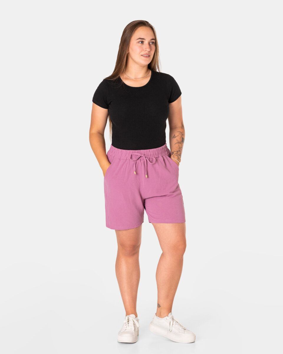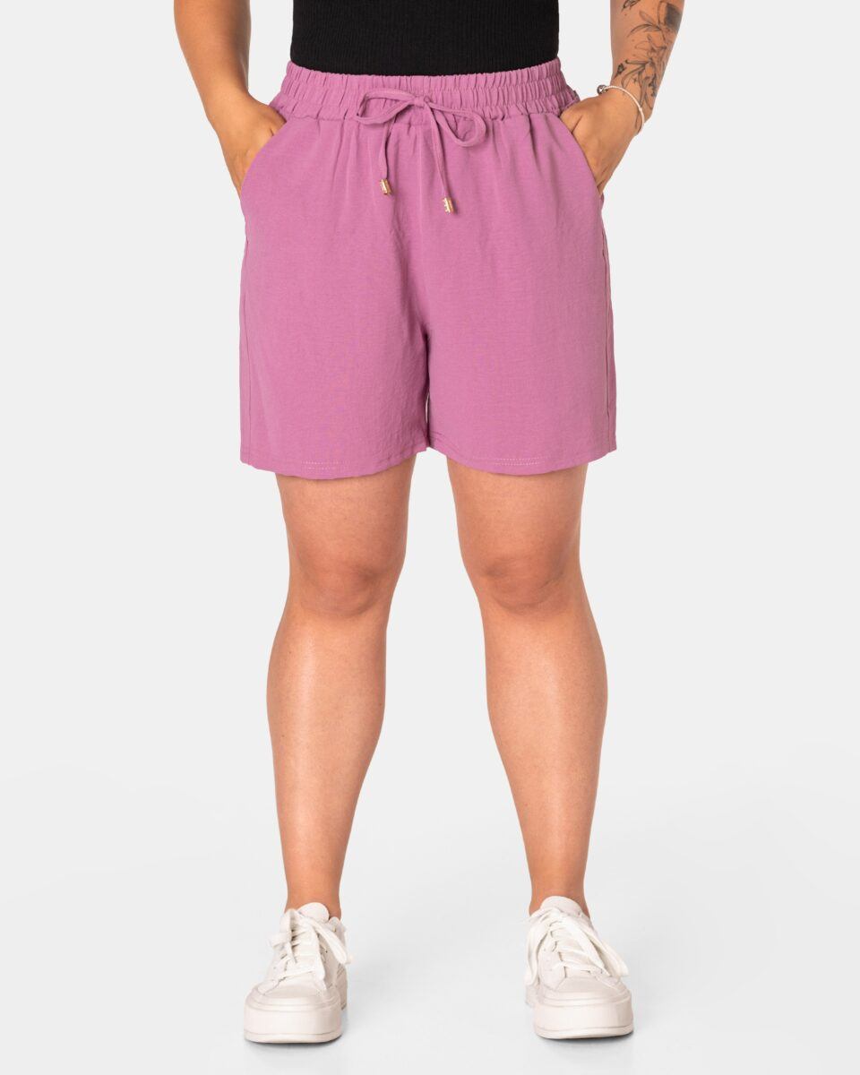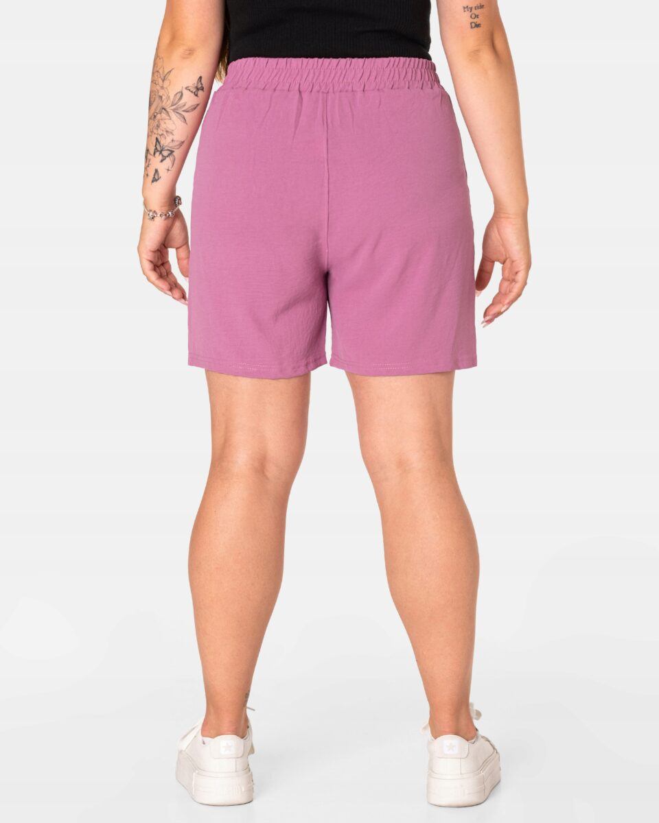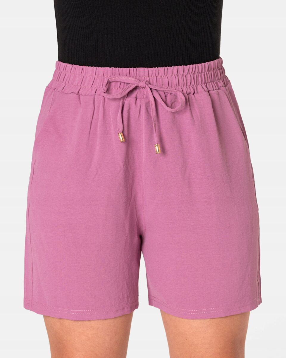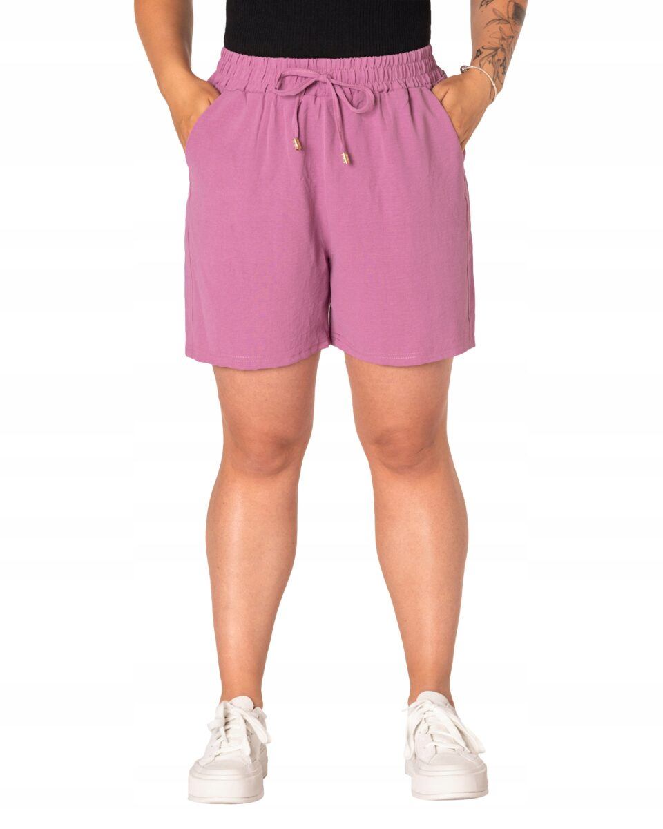Wyjątkowo lekkie i przewiewne krótkie damskie spodenki z wysokim stanem i krótką, szeroką nogawką, to jeden z najczęściej wybieranych na ciepłe i gorące dni wiosny i lata modeli spodenek. Wykonane z wysokiej jakości cienkiej i oddychającej, zwiewnej tkaniny o jednolitym wybarwieniu. Odpowiedni na wysokie temperatury luźny krój spodenek nie ogranicza swobody ruchów, a niewielka gramatura tkaniny (140 g/m2) pozytywnie wpływa na komfort użytkowania. Z założenia wyróżniają się dużą wygodą a dopasowanie w pasie zapewnia szeroki, elastyczny pas ściągający zgrabnie modelujący sylwetkę w talii i ozdobiony taśmą do zawiązania. Na bokach spodenek dwie wpuszczane kieszonki na dłonie.