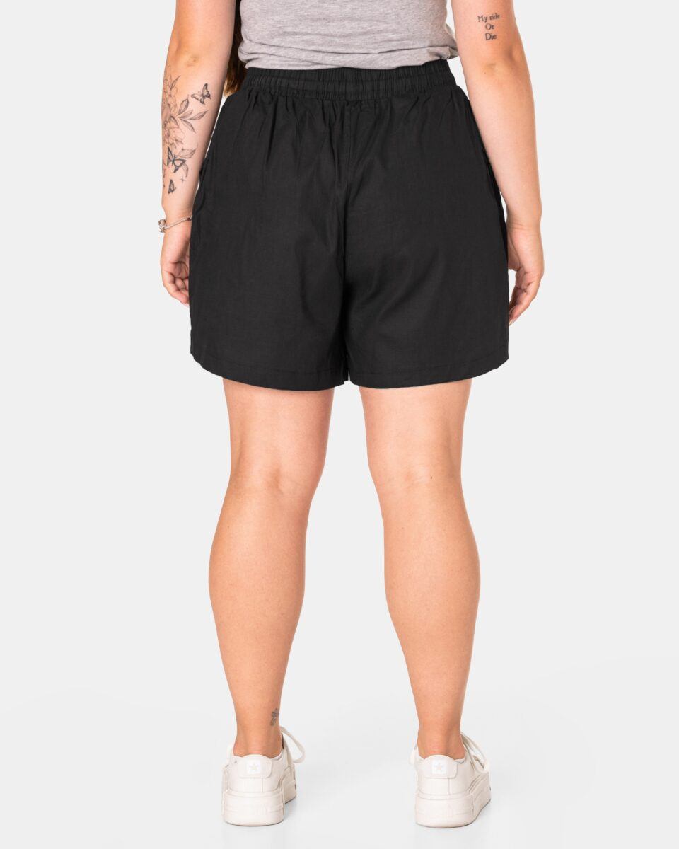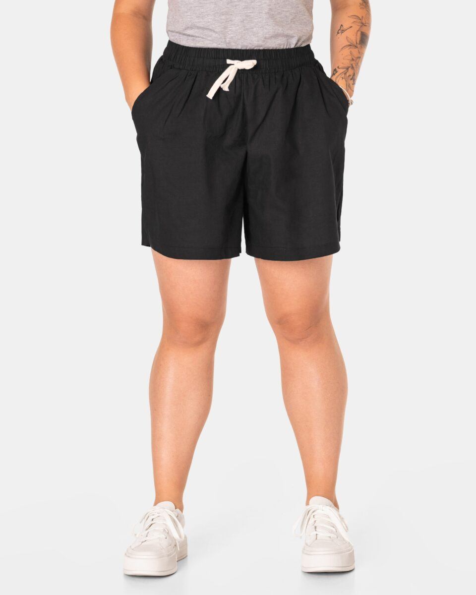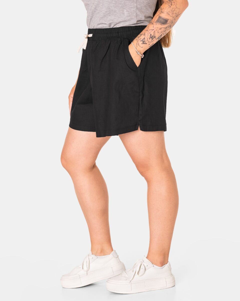Wyjątkowo lekkie i przewiewne krótkie damskie spodenki z wysokim stanem i krótką, szeroką nogawką, to jeden z najczęściej wybieranych na ciepłe i gorące dni wiosny i lata modeli spodenek. Wykonane z wysokiej jakości cienkiej i oddychającej, zwiewnej tkaniny bawełnianej o jednolitym wybarwieniu do złudzenia przypominającej naturalny len. Odpowiedni na wysokie temperatury luźny krój spodenek nie ogranicza swobody ruchów, a niewielka gramatura tkaniny (140 g/m2) pozytywnie wpływa na komfort użytkowania. Z założenia wyróżniają się dużą wygodą a dopasowanie w pasie zapewnia szeroki, elastyczny pas ściągający zgrabnie modelujący sylwetkę w talii oraz dodatkowo wpuszczoną w pasek taśma regulacyjna z możliwością jej zawiązywania. Na bokach spodenek dwie wpuszczane kieszonki na dłonie.