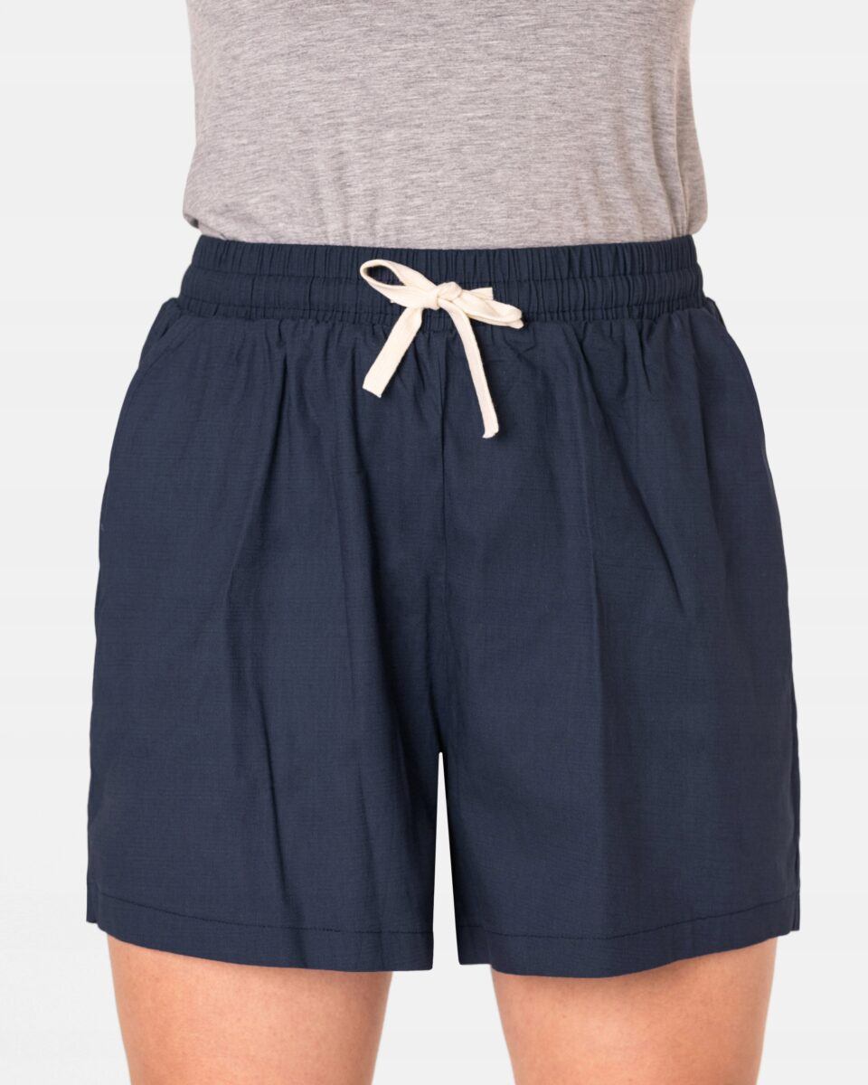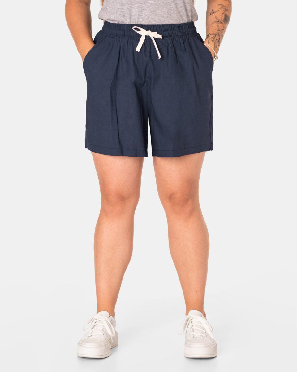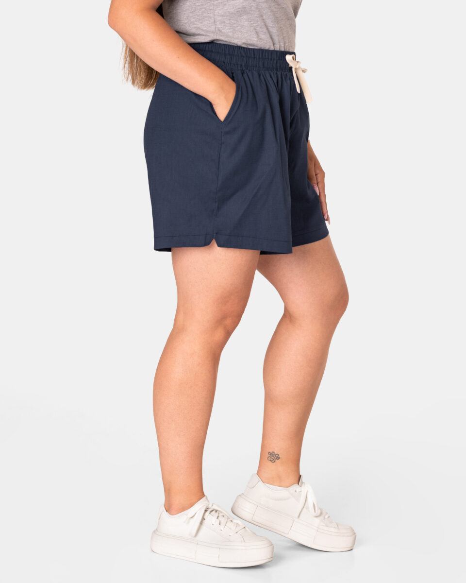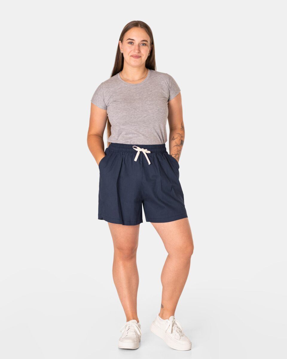 Wyjątkowo lekkie i przewiewne krótkie damskie spodenki z wysokim stanem i krótką, szeroką nogawką, to jeden z najczęściej wybieranych na ciepłe i gorące dni wiosny i lata modeli spodenek. Wykonane z wysokiej jakości cienkiej i oddychającej, zwiewnej tkaniny bawełnianej o jednolitym wybarwieniu do złudzenia przypominającej naturalny len. Odpowiedni na wysokie temperatury luźny krój spodenek nie ogranicza swobody ruchów, a niewielka gramatura tkaniny (140 g/m2) pozytywnie wpływa na komfort użytkowania. Z założenia wyróżniają się dużą wygodą a dopasowanie w pasie zapewnia szeroki, elastyczny pas ściągający zgrabnie modelujący sylwetkę w talii oraz dodatkowo wpuszczoną w pasek taśma regulacyjna z możliwością jej zawiązywania. Na bokach spodenek dwie wpuszczane kieszonki na dłonie.