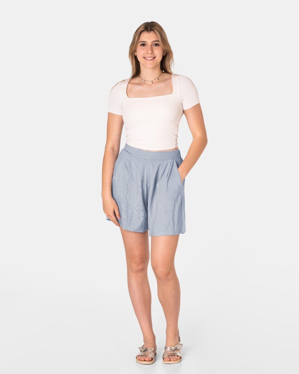 Wyjątkowo lekkie i przewiewne krótkie damskie spodenki bawełniane z wysokim stanem i luźną nogawką do połowy uda to jeden z najczęściej wybieranych na ciepłe i gorące dni wiosny i lata modeli spodni. Wykonane z wysokiej jakości cienkiej i oddychającej tkaniny bawełnianej o jednolitym wybarwieniu. Odpowiedni na wysokie temperatury luźny krój spodenek nie ogranicza swobody ruchów, a niewielka gramatura tkaniny (140 g/m2) pozytywnie wpływa na komfort użytkowania. Dopasowanie w talii zapewnia szeroki, elastyczny pas ściągający. Z przodu spodni dwie wpuszczane kieszonki na dłonie.