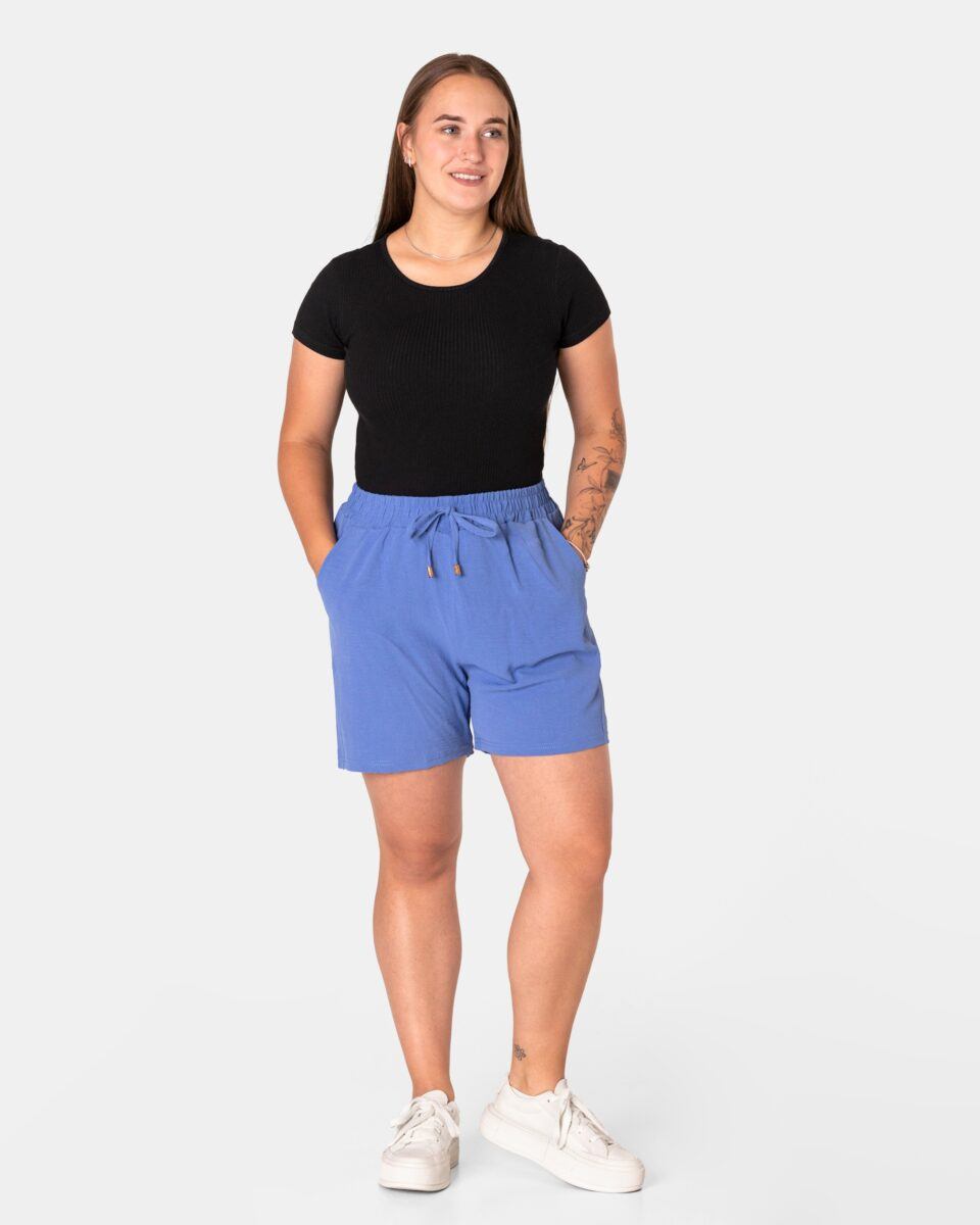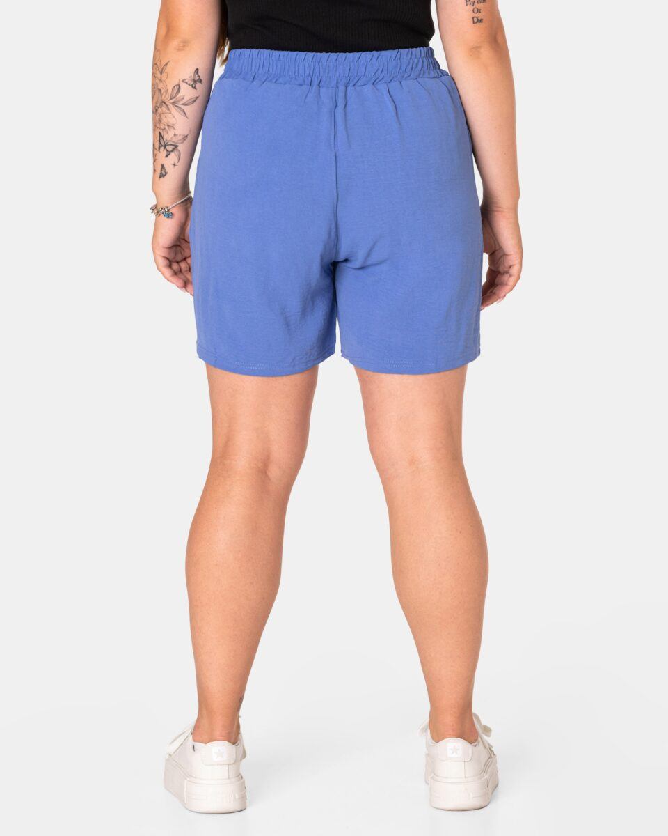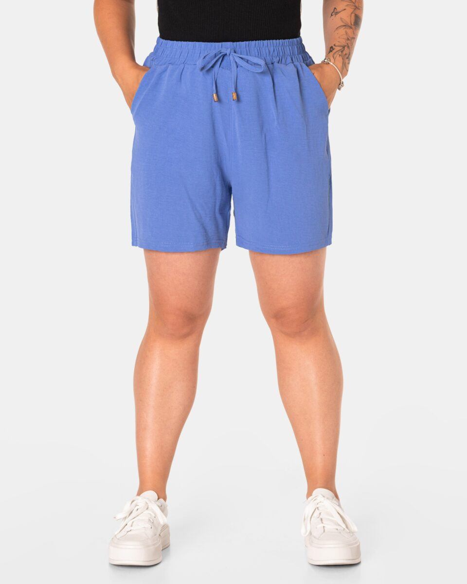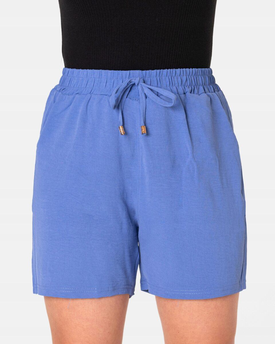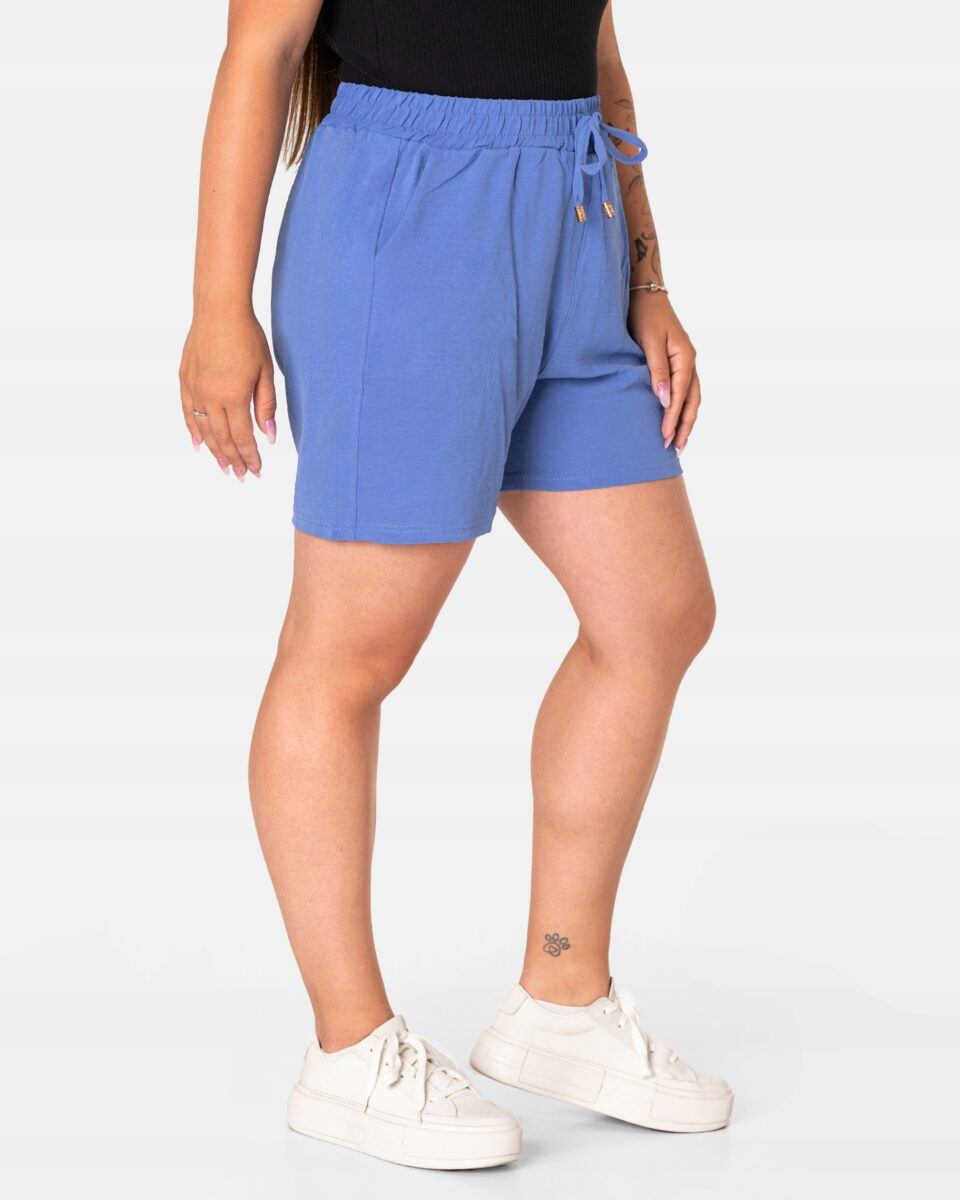 Wyjątkowo lekkie i przewiewne krótkie damskie spodenki z wysokim stanem i krótką, szeroką nogawką, to jeden z najczęściej wybieranych na ciepłe i gorące dni wiosny i lata modeli spodenek. Wykonane z wysokiej jakości cienkiej i oddychającej, zwiewnej tkaniny o jednolitym wybarwieniu. Odpowiedni na wysokie temperatury luźny krój spodenek nie ogranicza swobody ruchów, a niewielka gramatura tkaniny (140 g/m2) pozytywnie wpływa na komfort użytkowania. Z założenia wyróżniają się dużą wygodą a dopasowanie w pasie zapewnia szeroki, elastyczny pas ściągający zgrabnie modelujący sylwetkę w talii i ozdobiony taśmą do zawiązania. Na bokach spodenek dwie wpuszczane kieszonki na dłonie.