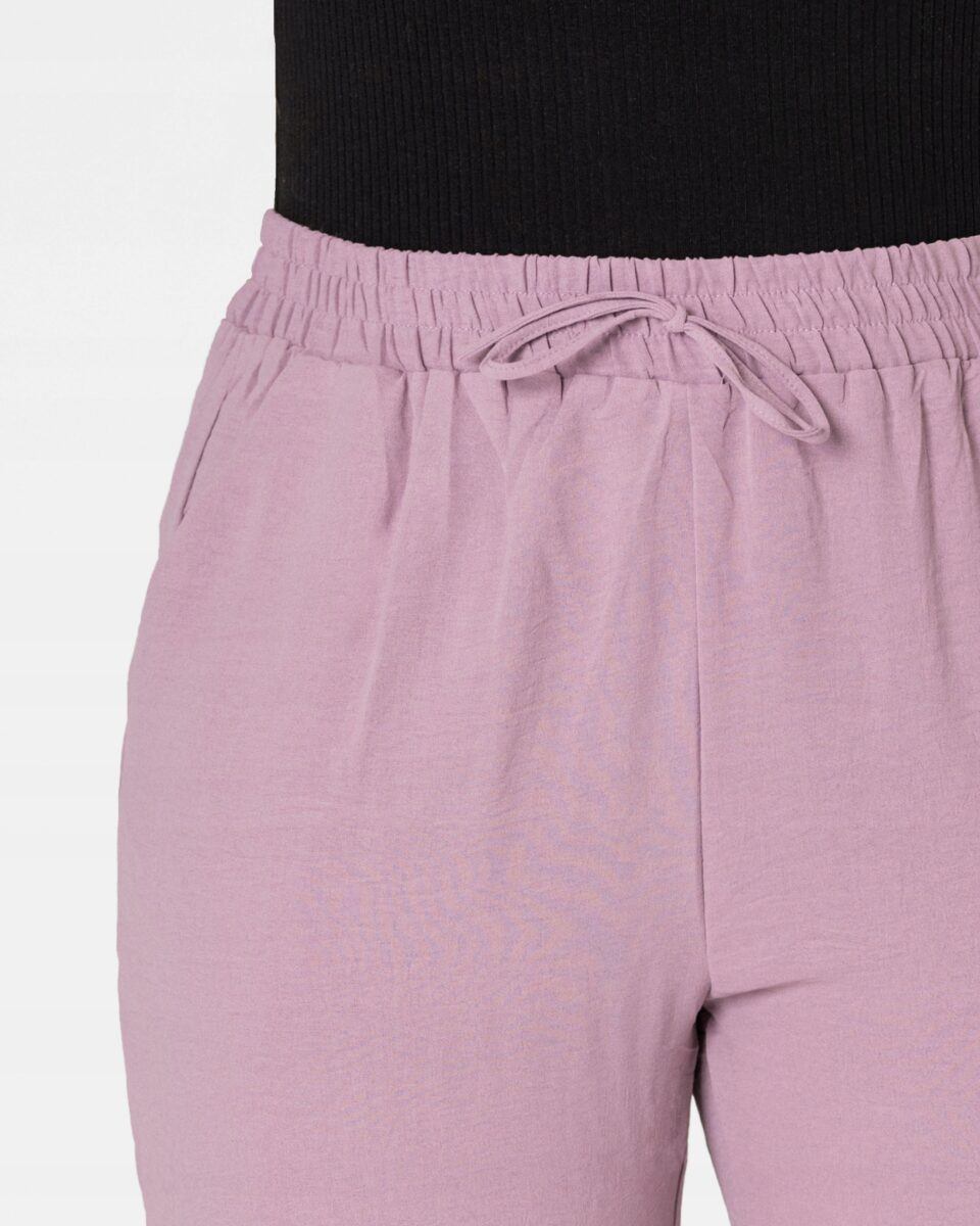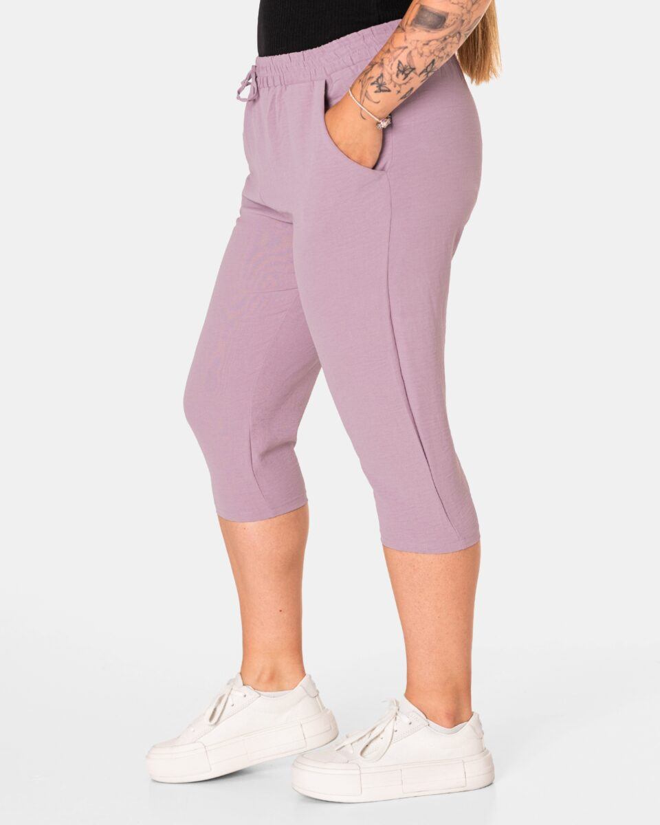 Wyjątkowo lekkie i przewiewne krótkie damskie spodenki z wysokim stanem i krótką nogawką 3/4, to jeden z najczęściej wybieranych na ciepłe i gorące dni wiosny i lata modeli spodenek. Wykonane z wysokiej jakości cienkiej i oddychającej, zwiewnej tkaniny o jednolitym wybarwieniu. Odpowiedni na wysokie temperatury luźny krój spodenek nie ogranicza swobody ruchów, a niewielka gramatura tkaniny (140 g/m2) pozytywnie wpływa na komfort użytkowania. Z założenia wyróżniają się dużą wygodą a dopasowanie w pasie zapewnia szeroki, elastyczny pas ściągający zgrabnie modelujący sylwetkę w talii i ozdobiony taśmą do zawiązania. Na bokach spodenek dwie wpuszczane kieszonki na dłonie.
