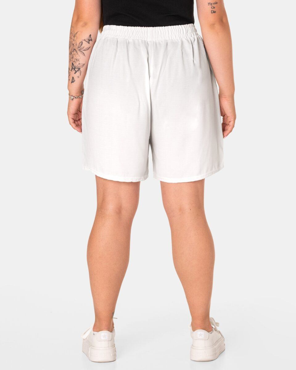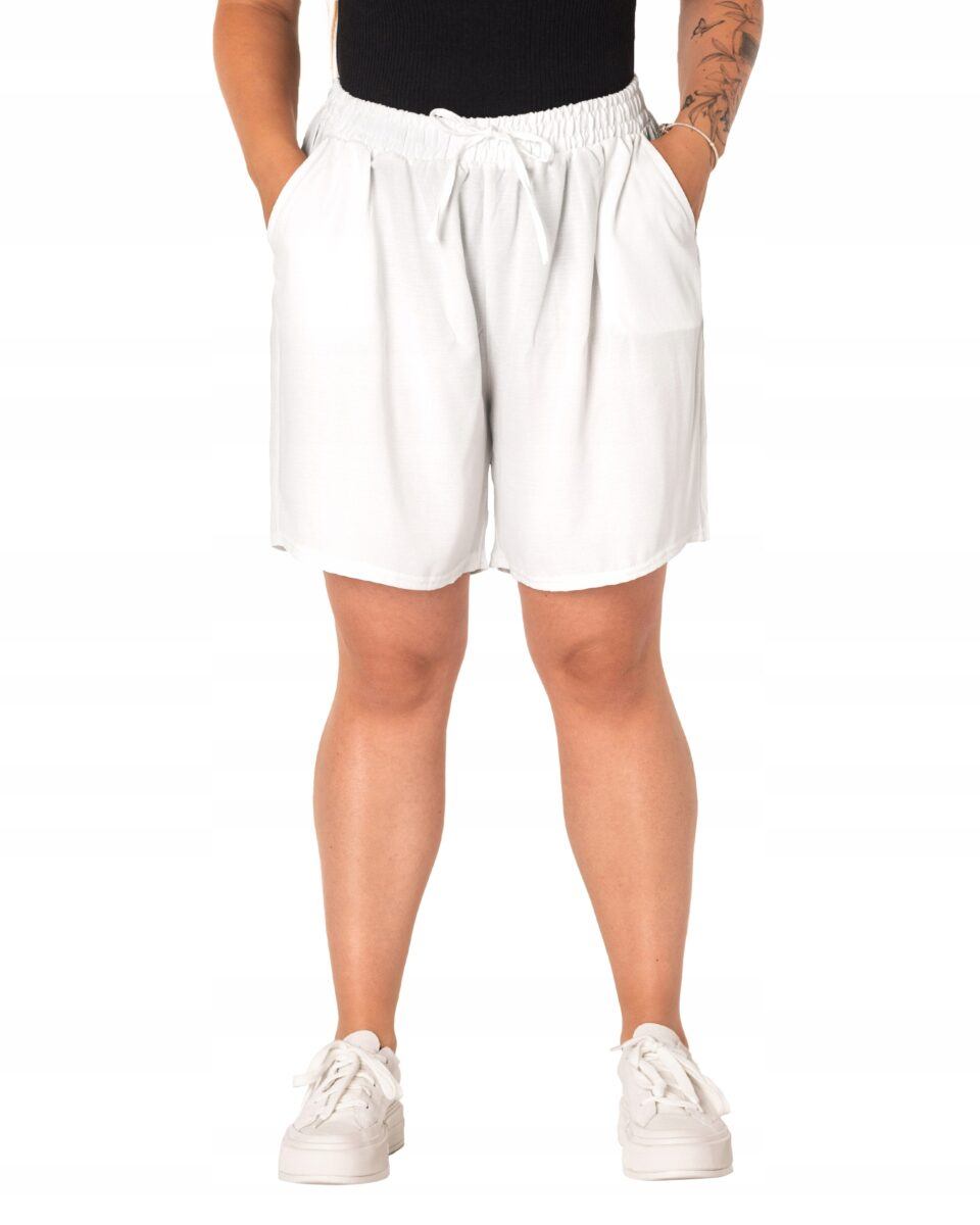 Wyjątkowo lekkie i przewiewne krótkie damskie spodenki bawełniane z wysokim stanem i krótką, szeroką nogawką, to jeden z najczęściej wybieranych na ciepłe i gorące dni wiosny i lata modeli spodenek. Wykonane z wysokiej jakości cienkiej i oddychającej, zwiewnej tkaniny bawełnianej o jednolitym wybarwieniu. Odpowiedni na wysokie temperatury luźny krój spodenek nie ogranicza swobody ruchów, a niewielka gramatura tkaniny (140 g/m2) pozytywnie wpływa na komfort użytkowania. Z założenia wyróżniają się dużą wygodą a dopasowanie w pasie zapewnia szeroki, elastyczny pas ściągający zgrabnie modelujący sylwetkę w talii i ozdobiony taśmą do zawiązania. Na bokach spodenek dwie wpuszczane kieszonki na dłonie.