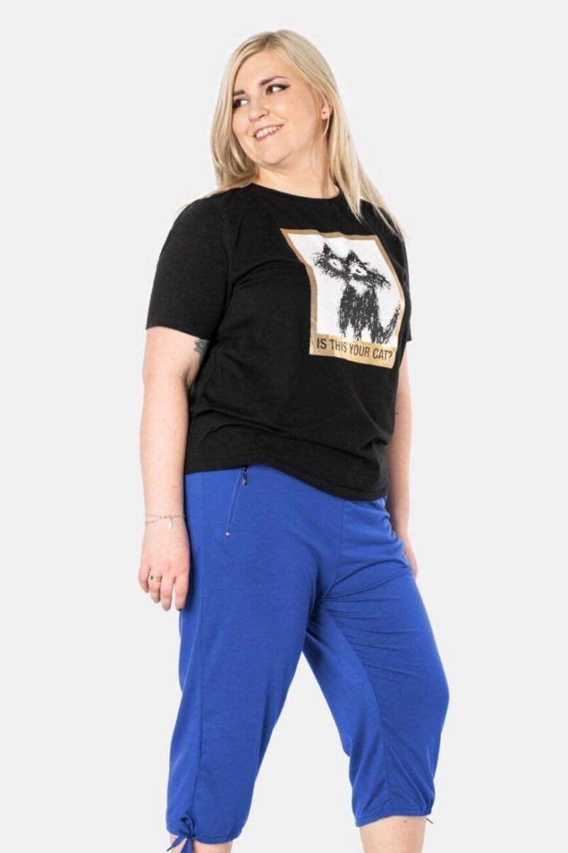 Spodenki damskie Capri 839 to komfortowo skrojony model z wyższym stanem i klasyczną prostą nogawką o długości 3/4 za kolano zakończoną ściągaczem. Uszyte z cienkiej dzianiny bawełnianej z domieszką poliestru, oddychającej i przewiewnej idealnej na ciepłe i gorące dni wiosny i lata zapewniającej wygodę i komfort ich użytkowania. Dopasowanie w pasie zapewnia elastyczny pas ściągający z taśmą regulacyjną do zawiązywania. Na bokach mają dwie wpuszczane kieszenie na dłonie, zasuwane na zamki błyskawiczne. Tył gładki bez kieszeni. Doły nogawek mają możliwość regulacji szerokości i dopasowania za pomocą wiązanych tasiemek regulacyjnych.