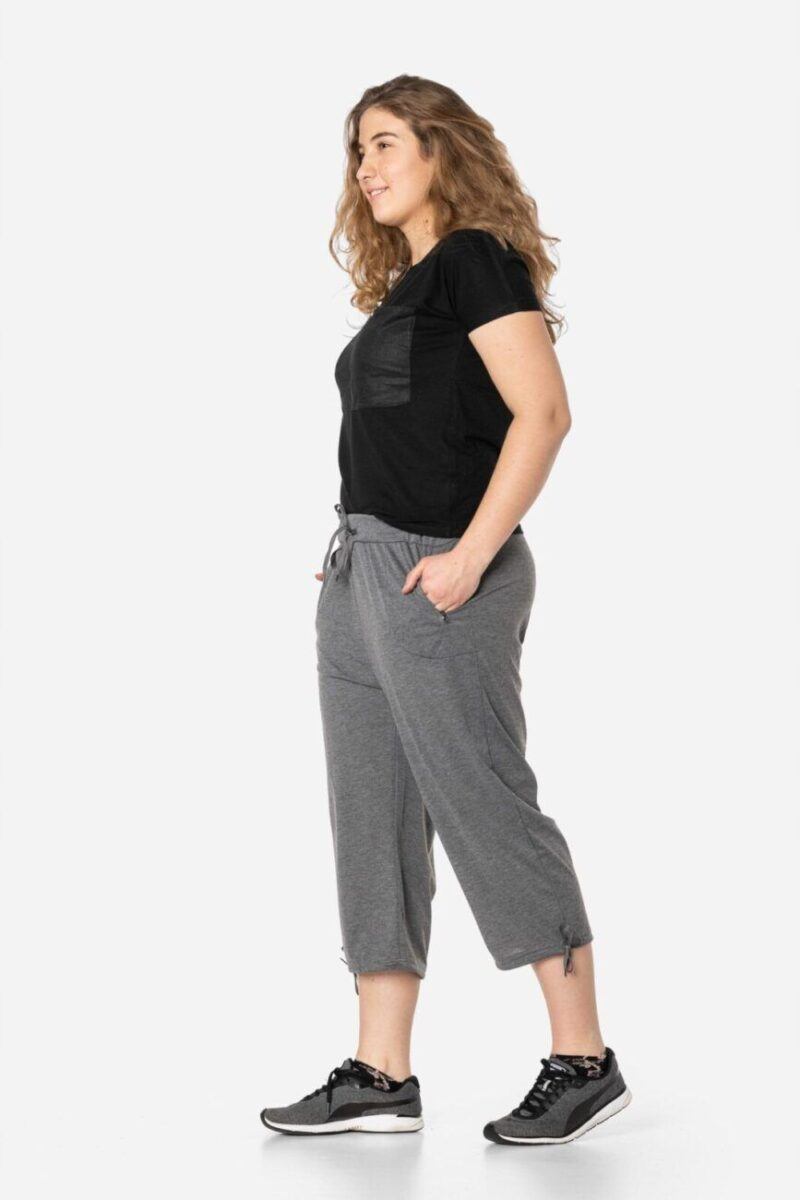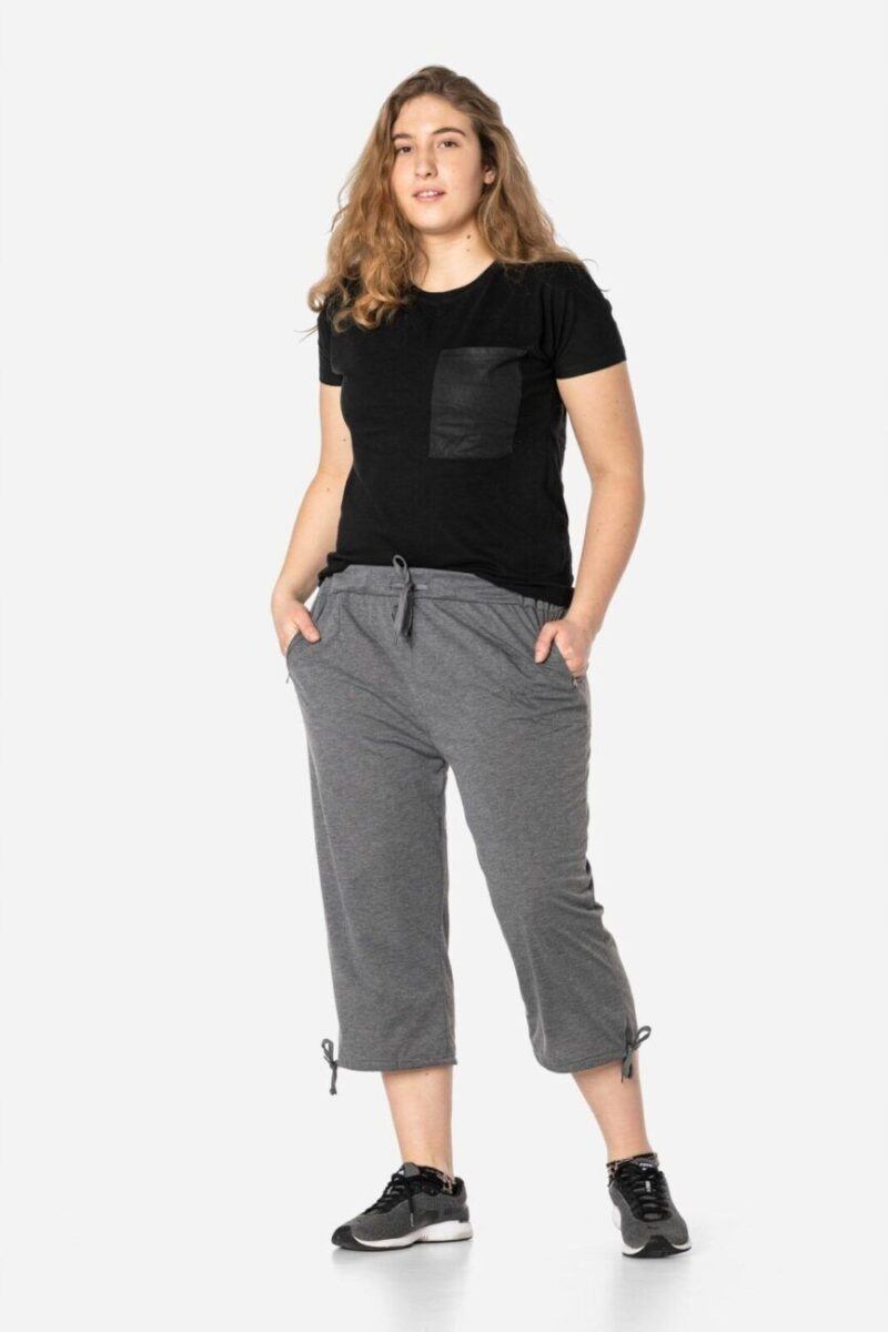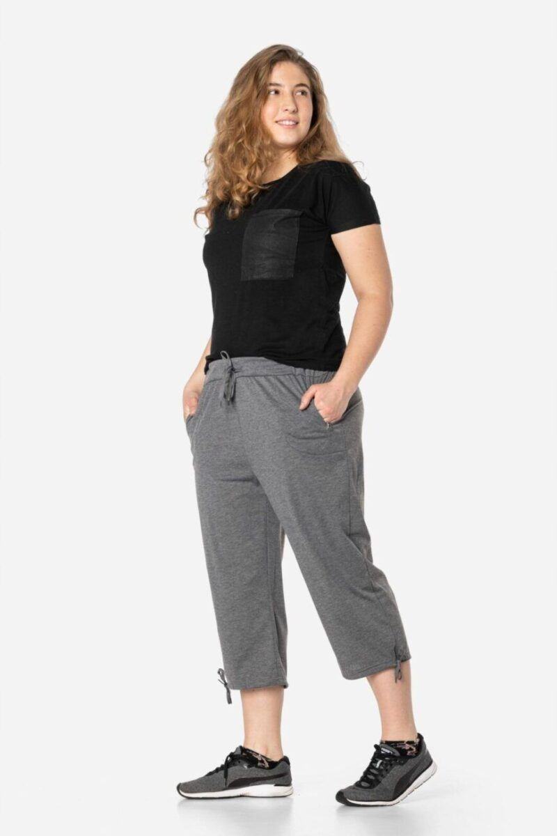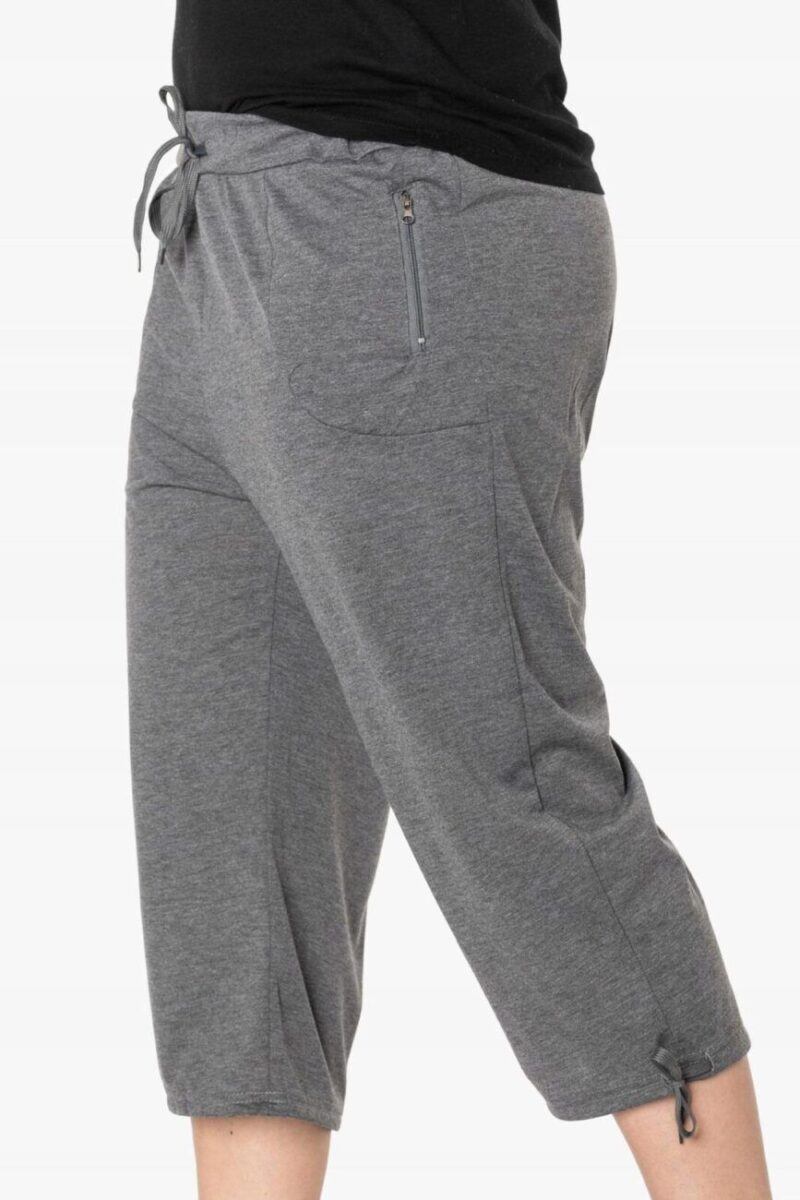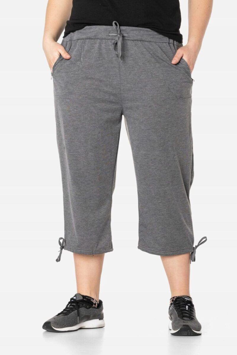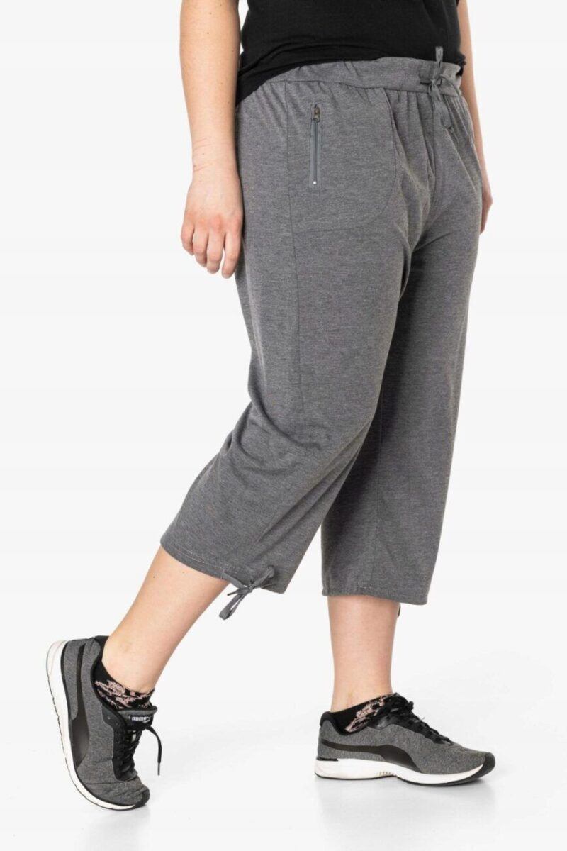 Spodenki damskie Capri 86022 to komfortowo skrojony model z wyższym stanem i klasyczną prostą nogawką o długości 3/4 za kolano zakończoną ściągaczem. Uszyte z cienkiej dzianiny bawełnianej z domieszką poliestru, oddychającej i przewiewnej idealnej na ciepłe i gorące dni wiosny i lata zapewniającej wygodę i komfort ich użytkowania. Dopasowanie w pasie zapewnia elastyczny pas ściągający z taśmą regulacyjną do zawiązywania. Na bokach mają dwie wpuszczane kieszenie na dłonie, zasuwane na zamki błyskawiczne. Tył gładki bez kieszeni. Doły nogawek mają możliwość regulacji szerokości i dopasowania za pomocą wiązanych tasiemek regulacyjnych.