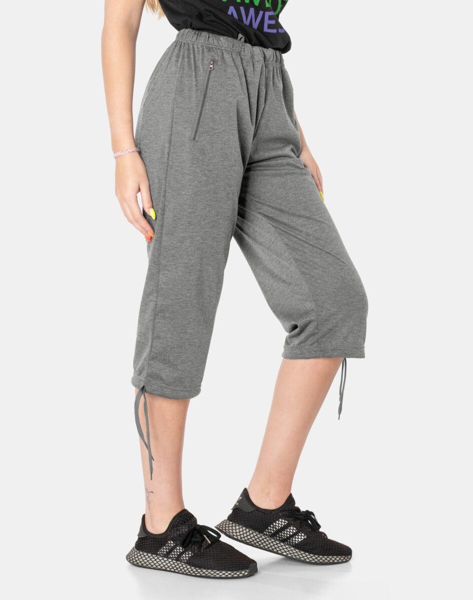 Spodenki damskie Capri 86077 to komfortowo skrojony model z wyższym stanem i klasyczną prostą nogawką o długości 3/4 za kolano zakończoną ściągaczem. Uszyte z cienkiej dzianiny bawełnianej z domieszką poliestru, oddychającej i przewiewnej idealnej na ciepłe i gorące dni wiosny i lata zapewniającej wygodę i komfort ich użytkowania. Dopasowanie w pasie zapewnia elastyczny pas ściągający z taśmą regulacyjną do zawiązywania. Na bokach mają dwie wpuszczane kieszenie na dłonie zasuwane na zamki błyskawiczne. Tył gładki bez kieszeni. Doły nogawek mają możliwość regulacji szerokości i dopasowania za pomocą wiązanych tasiemek regulacyjnych.