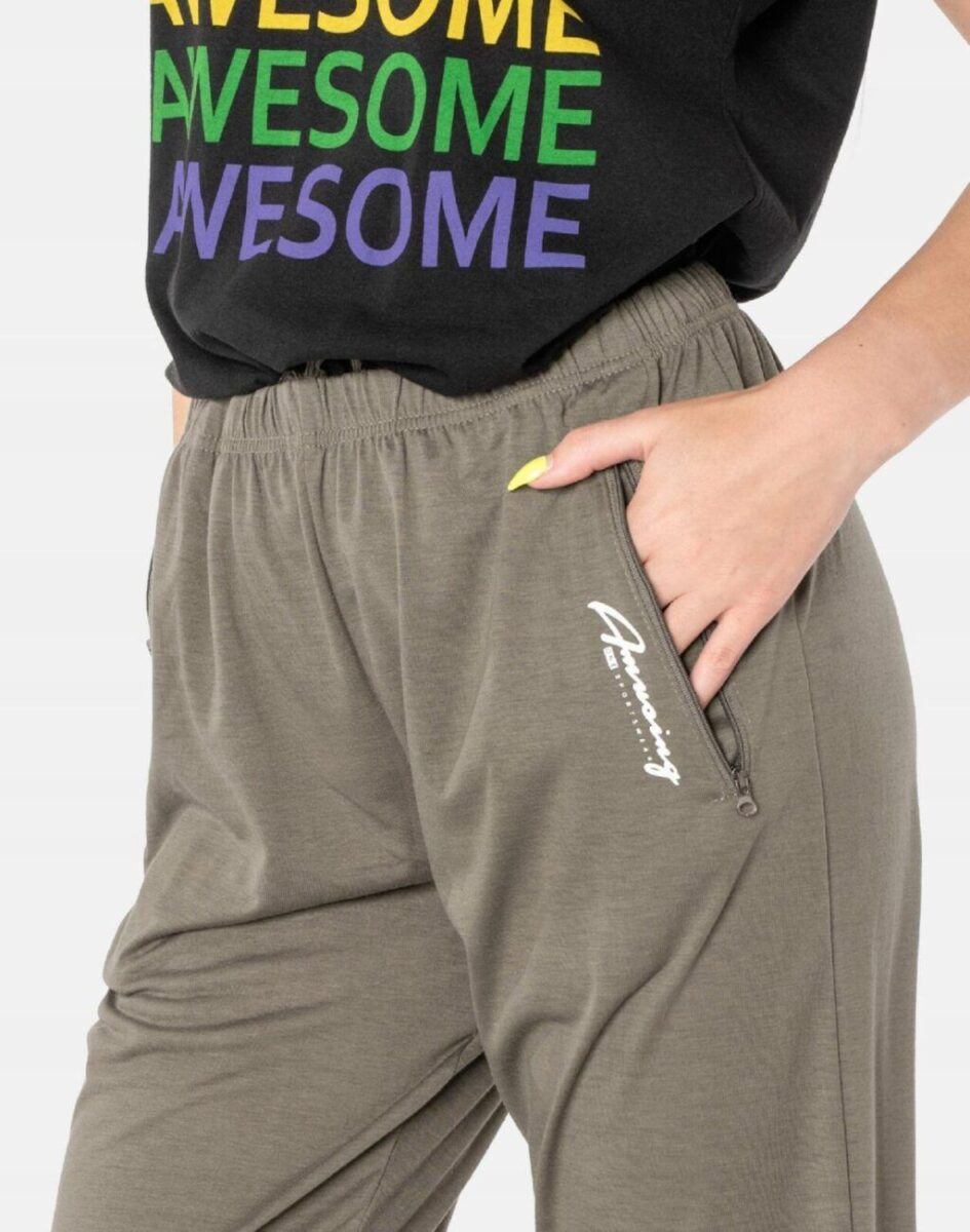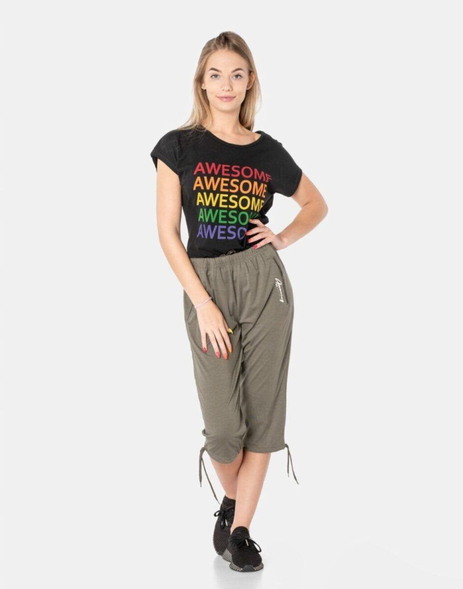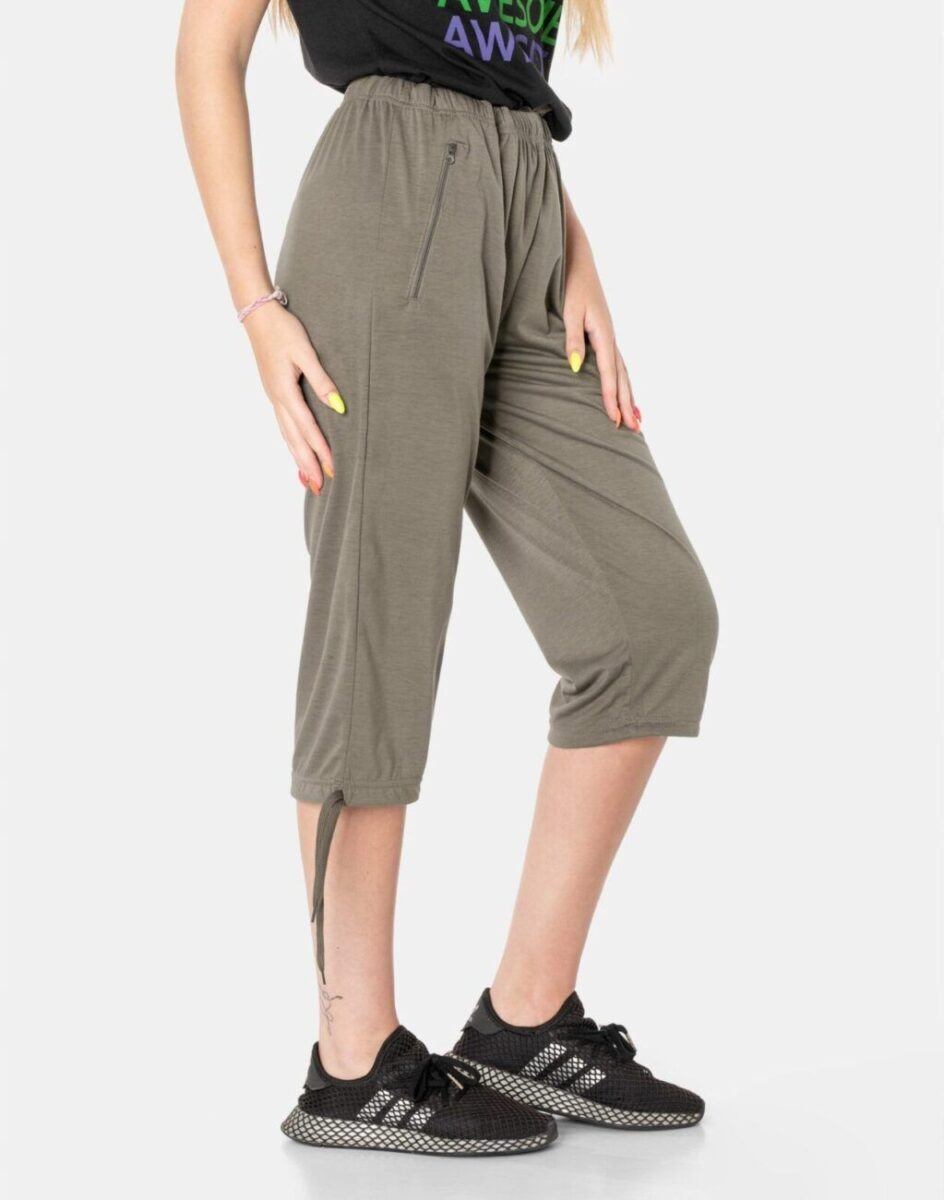 Spodenki damskie Capri 86077 to komfortowo skrojony model z wyższym stanem i klasyczną prostą nogawką o długości 3/4 za kolano zakończoną ściągaczem. Uszyte z cienkiej dzianiny bawełnianej z domieszką poliestru, oddychającej i przewiewnej idealnej na ciepłe i gorące dni wiosny i lata zapewniającej wygodę i komfort ich użytkowania. Dopasowanie w pasie zapewnia elastyczny pas ściągający z taśmą regulacyjną do zawiązywania. Na bokach mają dwie wpuszczane kieszenie na dłonie zasuwane na zamki błyskawiczne. Tył gładki bez kieszeni. Doły nogawek mają możliwość regulacji szerokości i dopasowania za pomocą wiązanych tasiemek regulacyjnych.