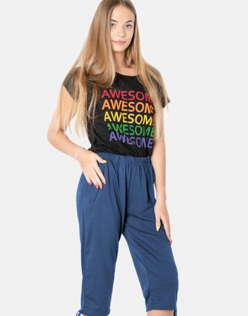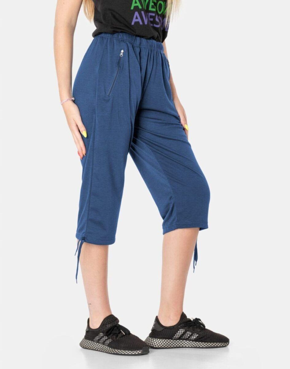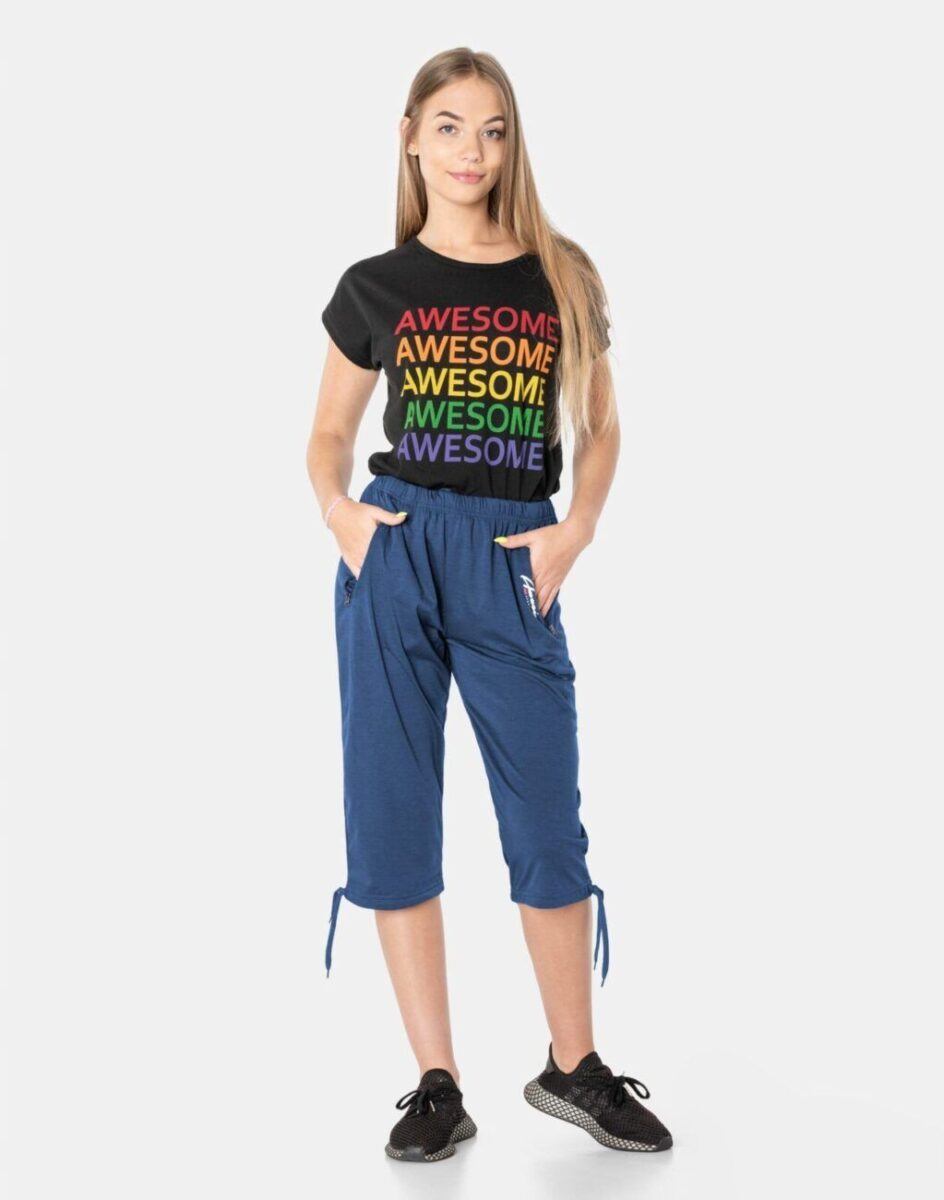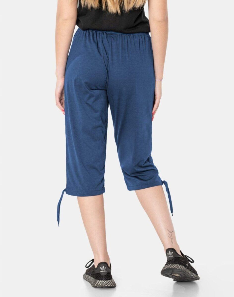 Spodenki damskie Capri 86077 to komfortowo skrojony model z wyższym stanem i klasyczną prostą nogawką o długości 3/4 za kolano zakończoną ściągaczem. Uszyte z cienkiej dzianiny bawełnianej z domieszką poliestru, oddychającej i przewiewnej idealnej na ciepłe i gorące dni wiosny i lata zapewniającej wygodę i komfort ich użytkowania. Dopasowanie w pasie zapewnia elastyczny pas ściągający z taśmą regulacyjną do zawiązywania. Na bokach mają dwie wpuszczane kieszenie na dłonie zasuwane na zamki błyskawiczne. Tył gładki bez kieszeni. Doły nogawek mają możliwość regulacji szerokości i dopasowania za pomocą wiązanych tasiemek regulacyjnych.