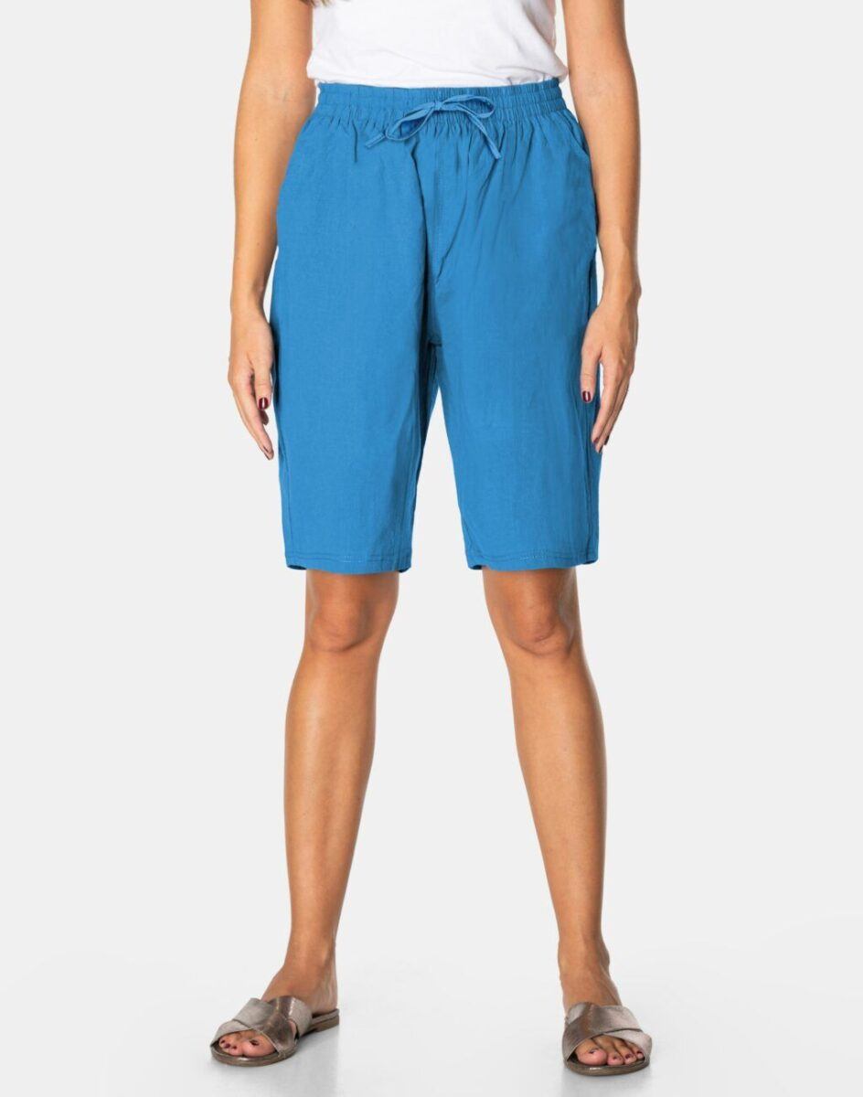 Wyjątkowo lekkie i przewiewne krótkie damskie spodenki bawełniane z wysokim stanem i luźną nogawką przed kolano to jeden z najczęściej wybieranych na ciepłe i gorące dni wiosny i lata modeli spodni. Wykonane z wysokiej jakości cienkiej i oddychającej tkaniny bawełnianej o jednolitym wybarwieniu. Odpowiedni na wysokie temperatury luźny krój spodenek nie ogranicza swobody ruchów, a niewielka gramatura tkaniny (180 g/m2) pozytywnie wpływa na komfort użytkowania. Dopasowanie w talii zapewnia szeroki, elastyczny pas ściągający. Z przodu pasek spodni został wykończony ozdobną taśmą, z możliwością zawiązania. Na bokach spodni dwie wpuszczane kieszonki na dłonie.