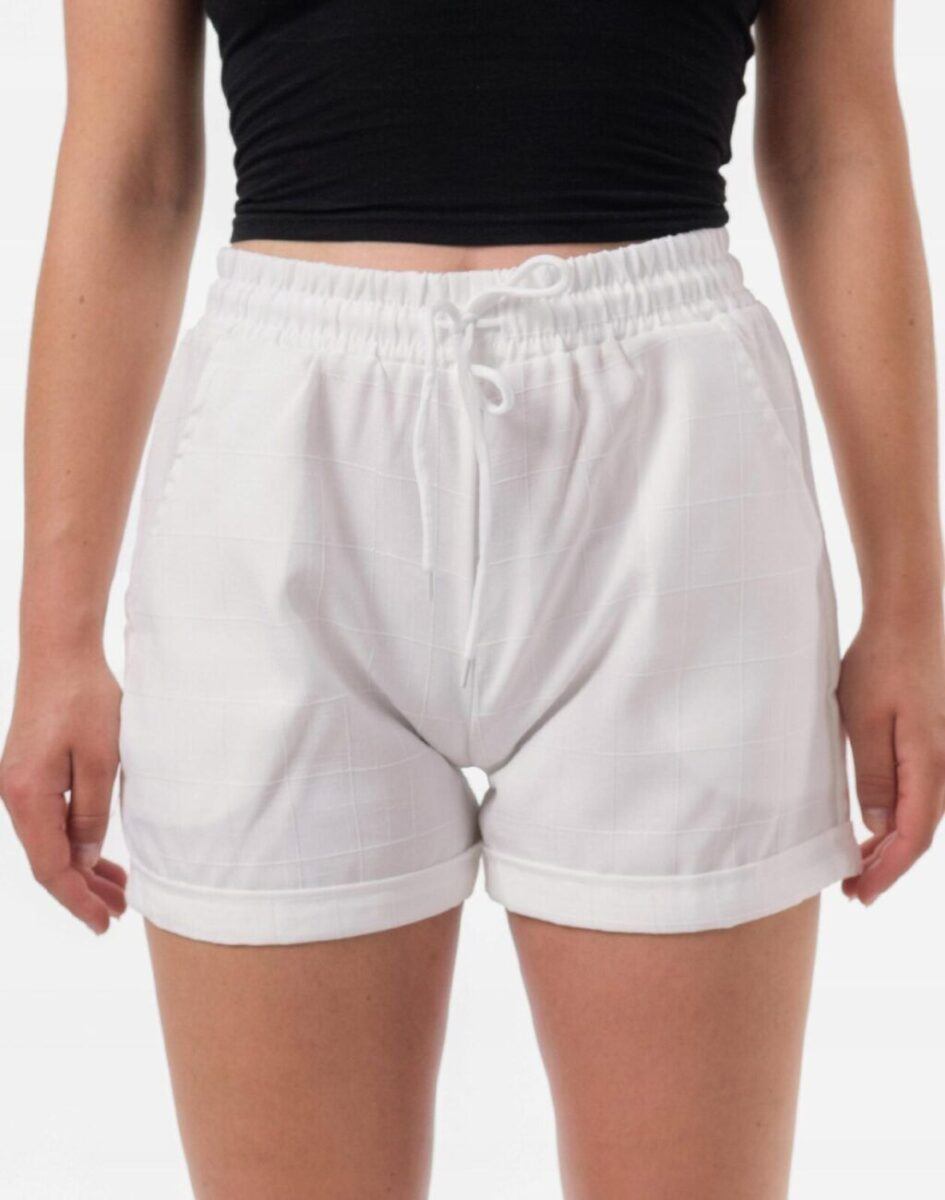 Od kilku sezonów absolutnym hitem podczas słonecznych dni są eleganckie szorty damskie w stylową kratkę. Niezmiennie modne, bardzo kobiece i kojarzone z dobrym gustem. Wyjątkowo lekkie i przewiewne, z podwyższonym stanem i krótką nogawką, to jeden z najczęściej wybieranych na ciepłe i gorące dni wiosny i lata modeli spodenek przez kobiety ceniące szykowne rozwiązania. Dobry i sprawdzony krój spodenek nie ogranicza swobody ruchów, a odpowiednia na wysokie temperatury gramatura tkaniny pozytywnie wpływa na komfort użytkowania. W talii posiadają szeroki elastyczny pas ściągający oraz dodatkowo wpuszczoną w pasek taśmę regulacyjną z możliwością jej zawiązywania. Na bokach mają dwie wpuszczane zaokrąglone kieszonki na dłonie. Idealne na co dzień jako element casualowego stroju czyniąc go lekkim i dostosowanym do wysokich temperatur.