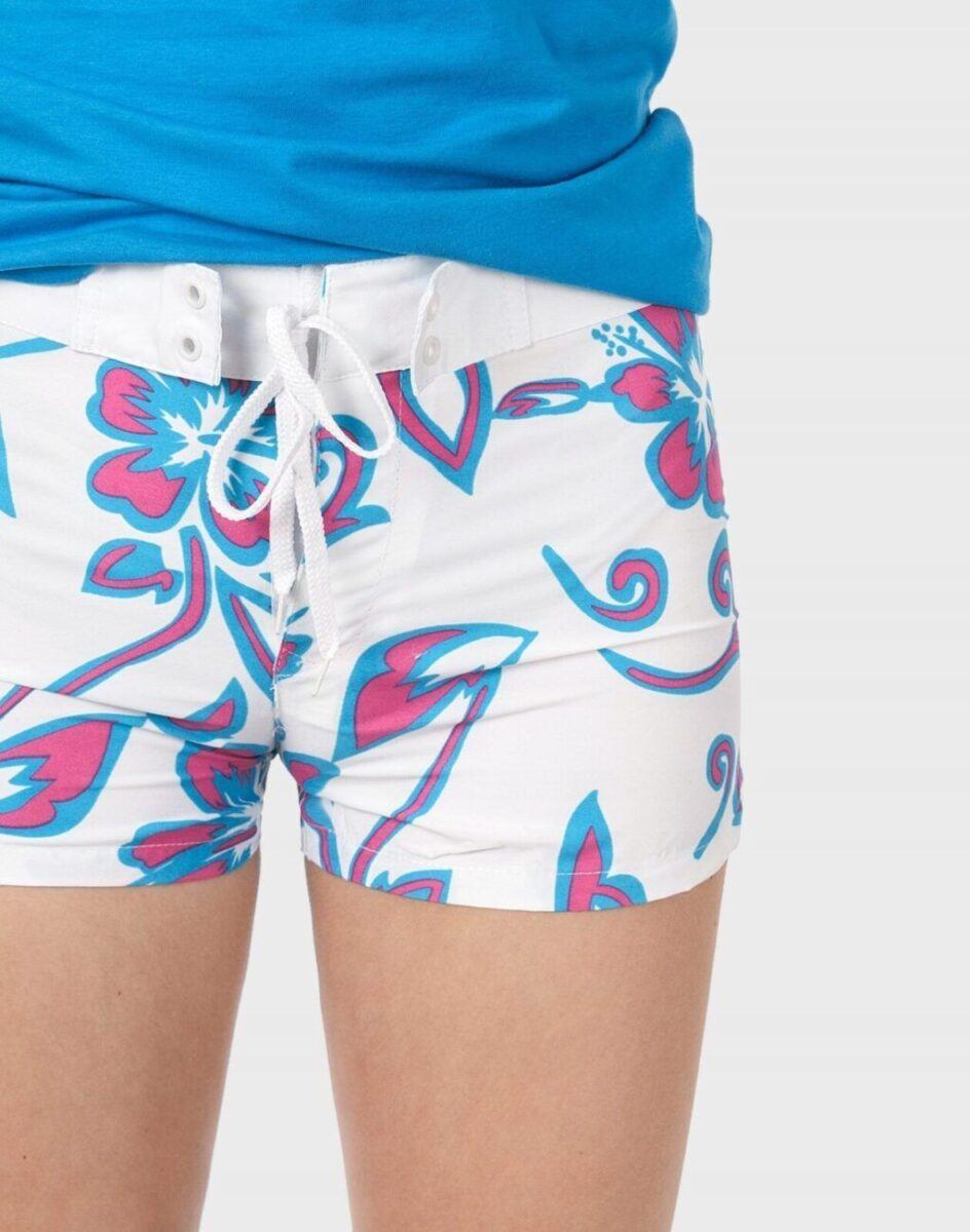 Krótkie, lekkie jak piórko, z niskim stanem o sprawdzonym kroju, cienkie i wygodne, idealne na co dzień jako element casualowego stroju, czyniąc go lekkim i dostosowanym do wysokich temperatur. Wykonane według najnowszych trendów przewidzianych na ten sezon. Z przodu zapinane na rzepy i zawiązywane ozdobną tasiemką umożliwiającą dodatkową regulację. W całości wykończone w modny kwiecisty wzór Floral.