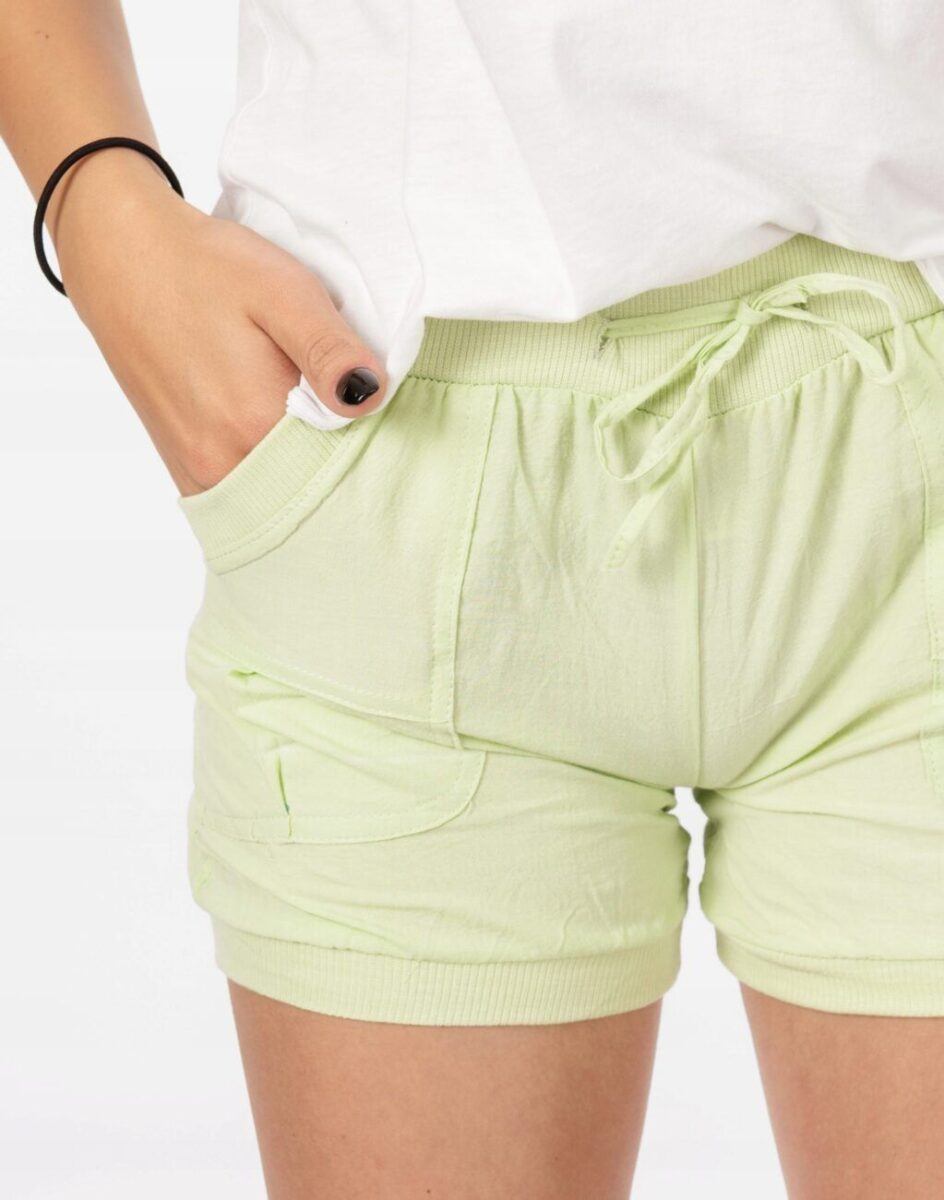 Krótkie, lekkie jak piórko, ze średnim stanem o sprawdzonym kroju, cienkie i wygodne, idealne na co dzień jako element casualowego stroju, czyniąc go lekkim i dostosowanym do wysokich temperatur. Wykonane według najnowszych trendów przewidzianych na ten sezon. Posiadają szeroki elastyczny pas ściągający oraz dodatkowo wpuszczoną w pasek taśmę regulacyjną z możliwością jej zawiązywania. Dwie kieszonki naszywane z przodu i dwie z tyłu spodenek. Doły nogawek zakończone delikatnym ściągaczem.