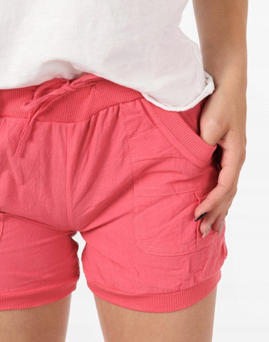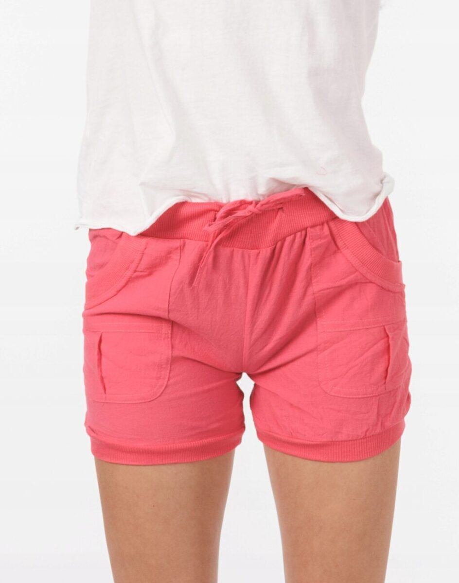 Krótkie, lekkie jak piórko, ze średnim stanem o sprawdzonym kroju, cienkie i wygodne, idealne na co dzień jako element casualowego stroju, czyniąc go lekkim i dostosowanym do wysokich temperatur. Wykonane według najnowszych trendów przewidzianych na ten sezon. Posiadają szeroki elastyczny pas ściągający oraz dodatkowo wpuszczoną w pasek taśmę regulacyjną z możliwością jej zawiązywania. Dwie kieszonki naszywane z przodu i dwie z tyłu spodenek. Doły nogawek zakończone delikatnym ściągaczem.