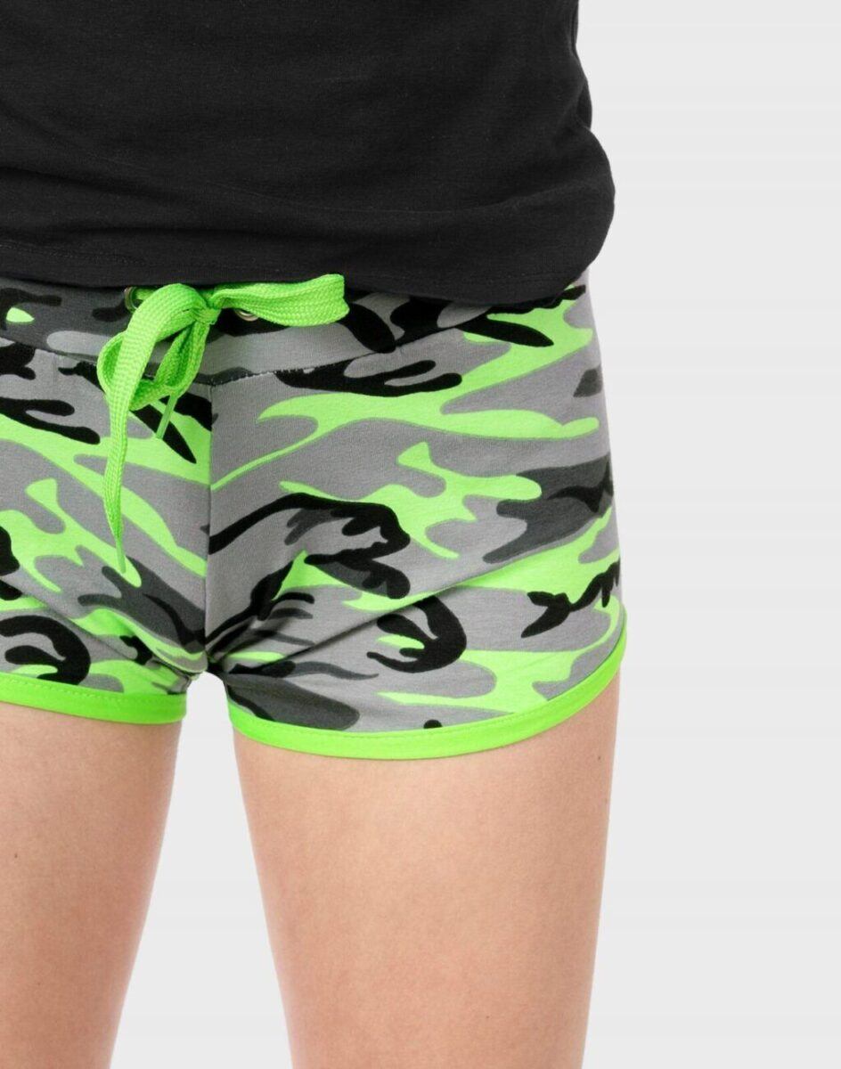 Wykonane według najnowszych trendów przewidzianych na ten sezon, o wzorze moro CAMO dla fanek militarnego stylu sport-casual. Posiadają szeroki elastyczny pas ściągający oraz dodatkowo wpuszczoną w pasek taśmę regulacyjna z możliwością jej zawiązywania. Są wyjątkowo elastyczne, z łatwością dopasowują się do ciała a sam materiał odznacza się dużą miękkością i pozwala skórze swobodnie oddychać.