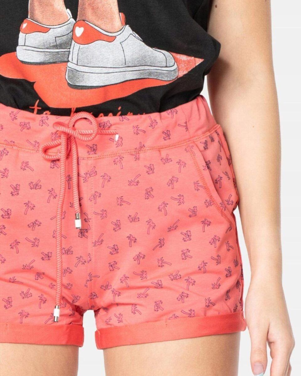 Uszyte z cienkiej tkaniny bawełnianej z dodatkiem lycry (elastan) o drobnym zapewniającym dobrą cyrkulację powietrza splocie i sprawdzonym przez wiele klientek kroju. Elastyczne i wygodne, idealne na co dzień jako element letniego stroju czyniąc go lekkim i dostosowanym do wysokich temperatur. Naturalna bawełna gwarantuje świetną przepuszczalność powietrza, wchłanianie potu i oddychanie skóry. Dodatek lycry sprawia że spodenki są bardziej elastyczne i doskonale dopasowują się do każdej sylwetki. Pozwalają na pełną swobodę ruchów co daje komfort przy siadaniu i zapewnia ogromny komfort noszenia. Z założenia wyróżniają się dużą wygodą a dopasowanie w pasie zapewnia szeroki elastyczny pas ściągający z taśmą regulacyjną do zawiązywania. Z przodu mają dwie kieszonki na dłonie a z tyłu atrapę kieszonki wpuszczanej zapinanej na ozdobny metalowy guziczek. Doły nogawek zakończone ozdobnym mankietem/ściągaczem. Delikatna, palmowa stylistyka na nogawkach nadaje im wyjątkowego charakteru i ożywia wakacyjny look.