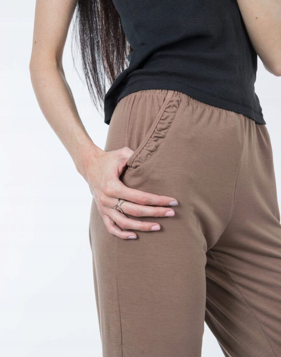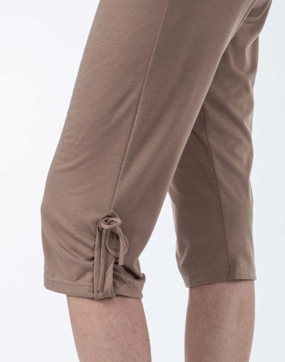 Szeroki elastyczny ściągacz oraz oraz dodatkowo wpuszczona w pasek taśma regulacyjna z możliwością jej zawiązywania, umożliwiają dopasowanie w pasie i ładnie podkreślą talię. Po bokach dwie wpuszczane kieszenie na dłonie.
